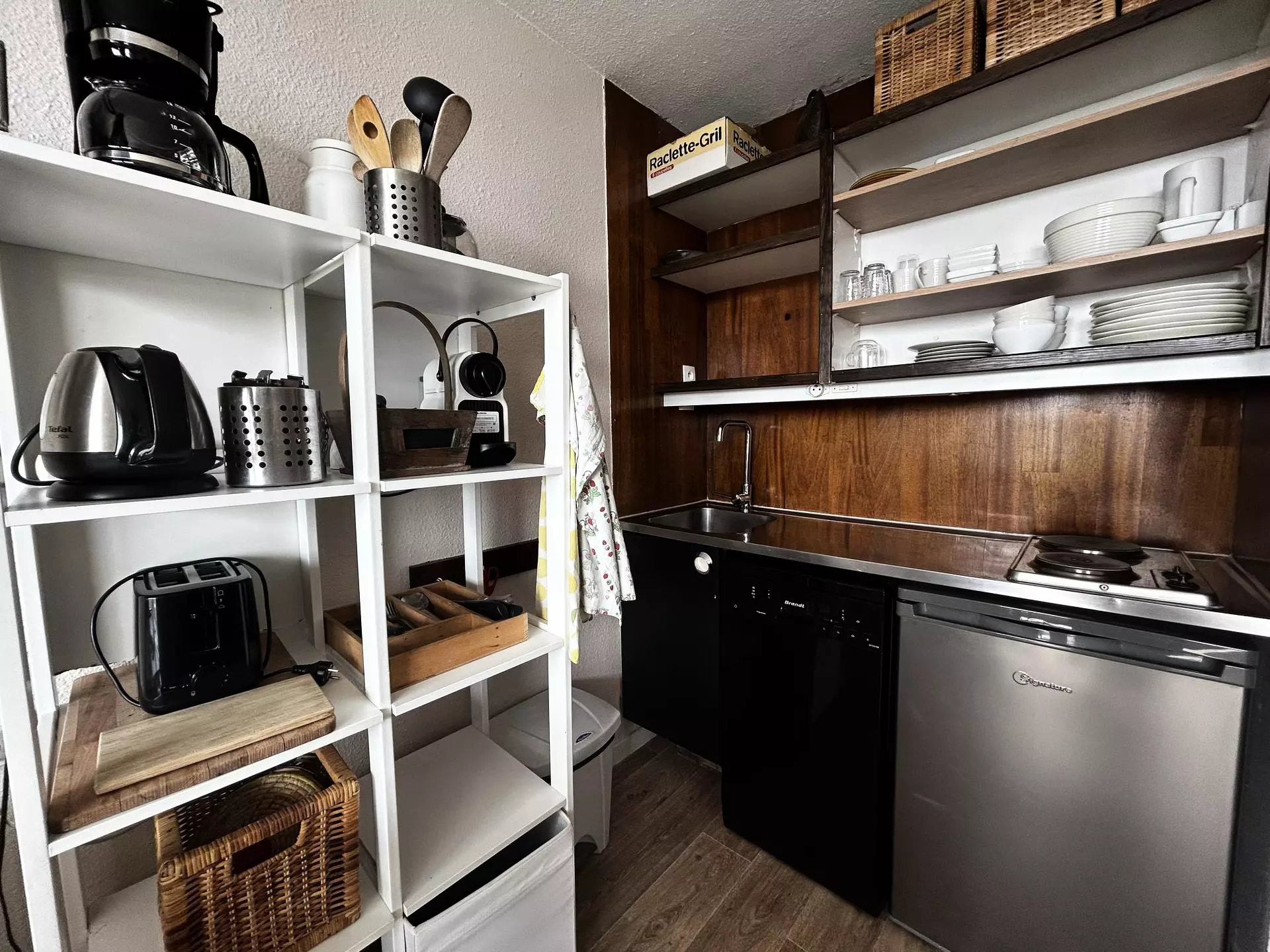 Kitchenette ouverte sur le séjour séparée par un meuble bar de rangement : plaques de cuisson vitrocéramiques (x2), four, micro-ondes, réfrigérateur, lave-vaisselle, cafetière filtre et cafetière senseo et bouilloire, grille-pain, appareil raclette