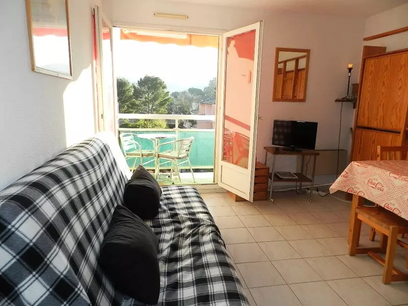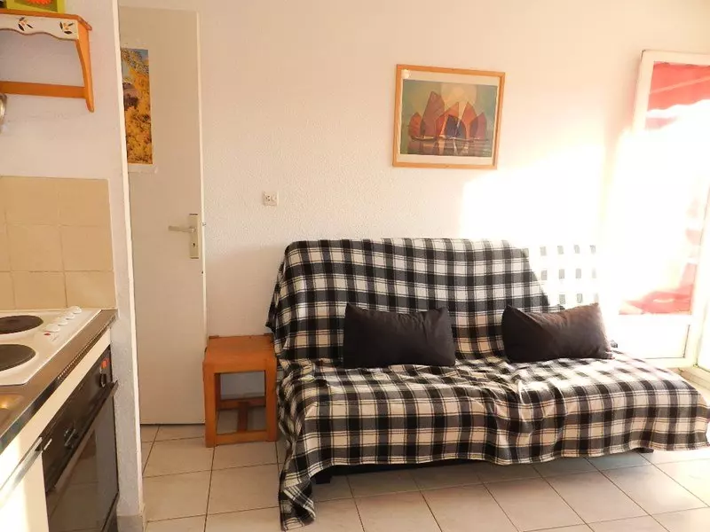 La location vous offre une loggia exposée Sud avec une vue dégagée, un séjour avec divan convertible et lits superposés rabattables , une kitchenette, ainsi qu'une salle de bain avec wc.