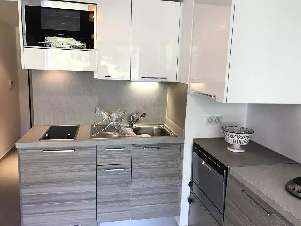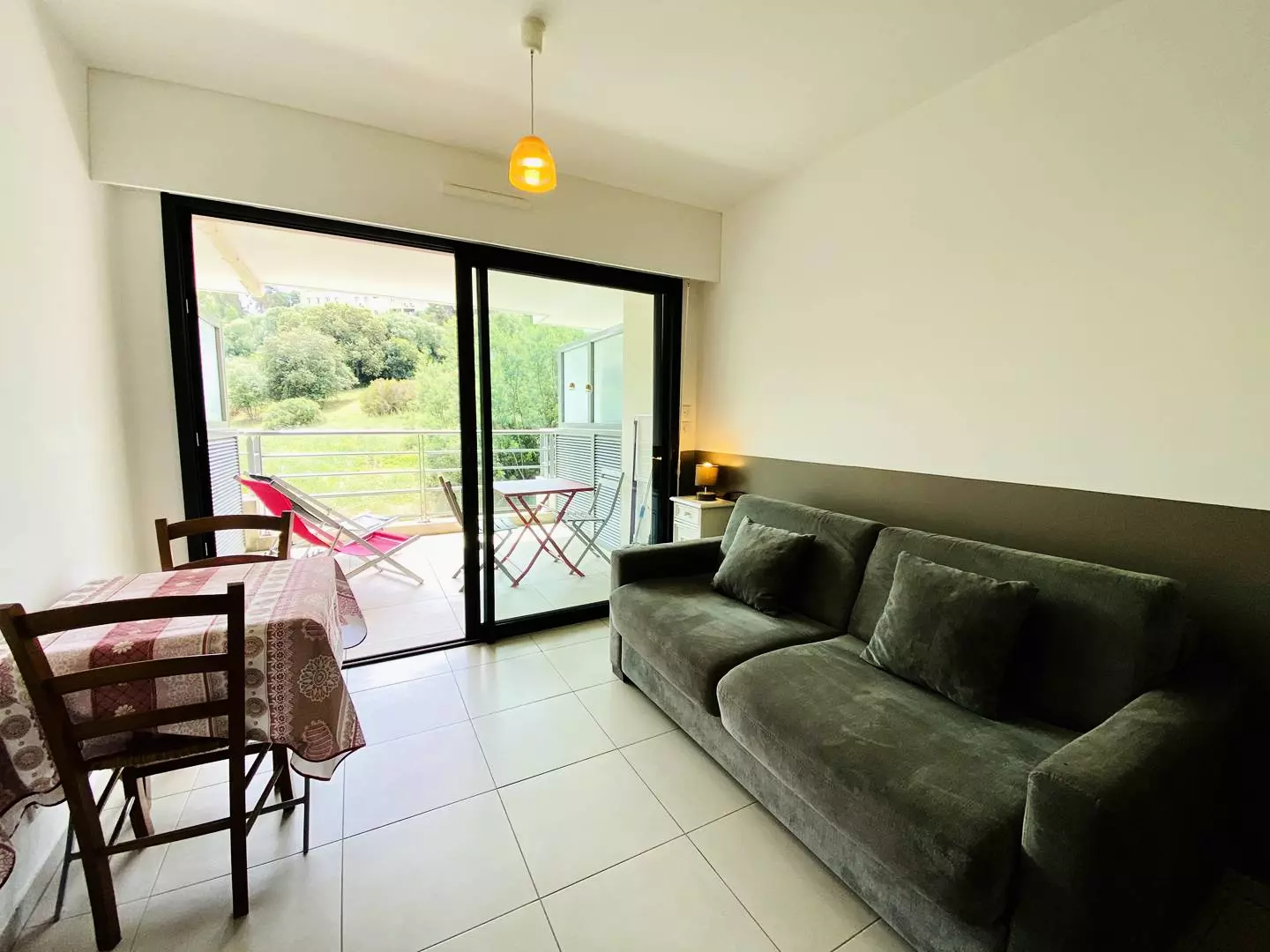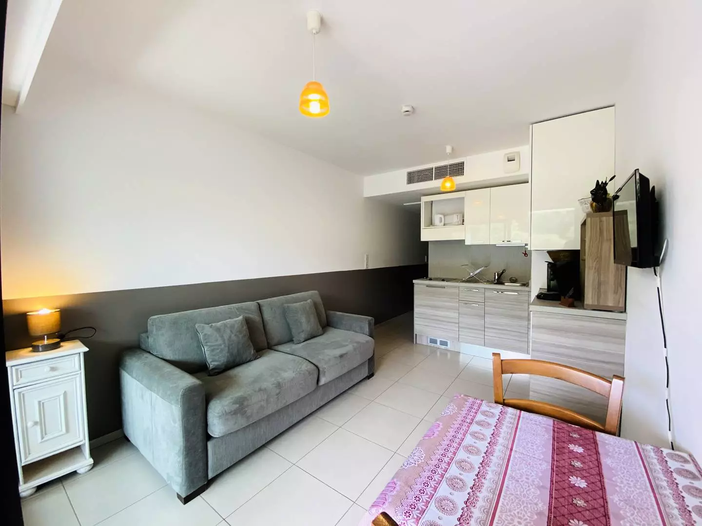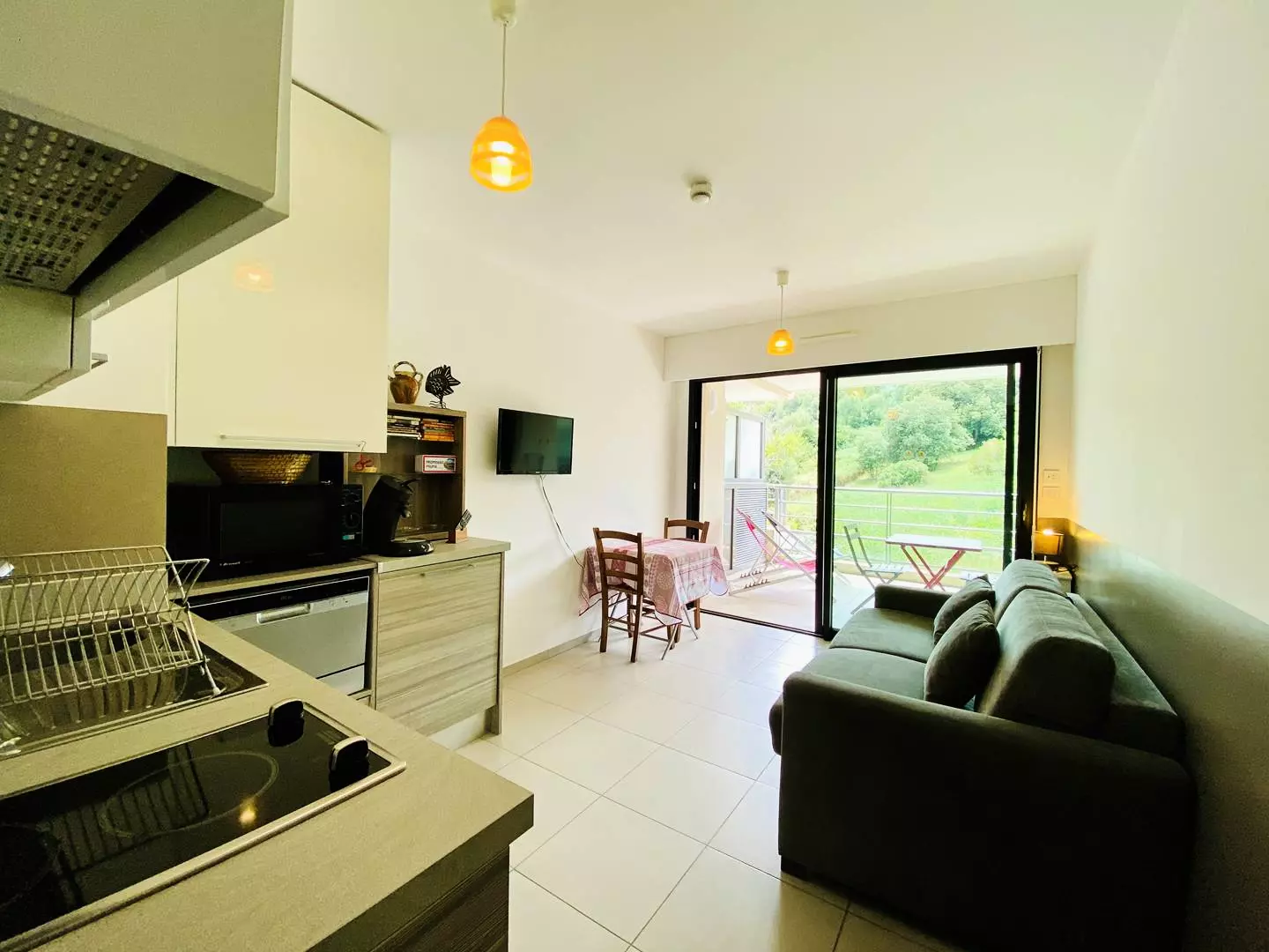 une pièce de vie avec cuisine, espace repas, canapé convertible