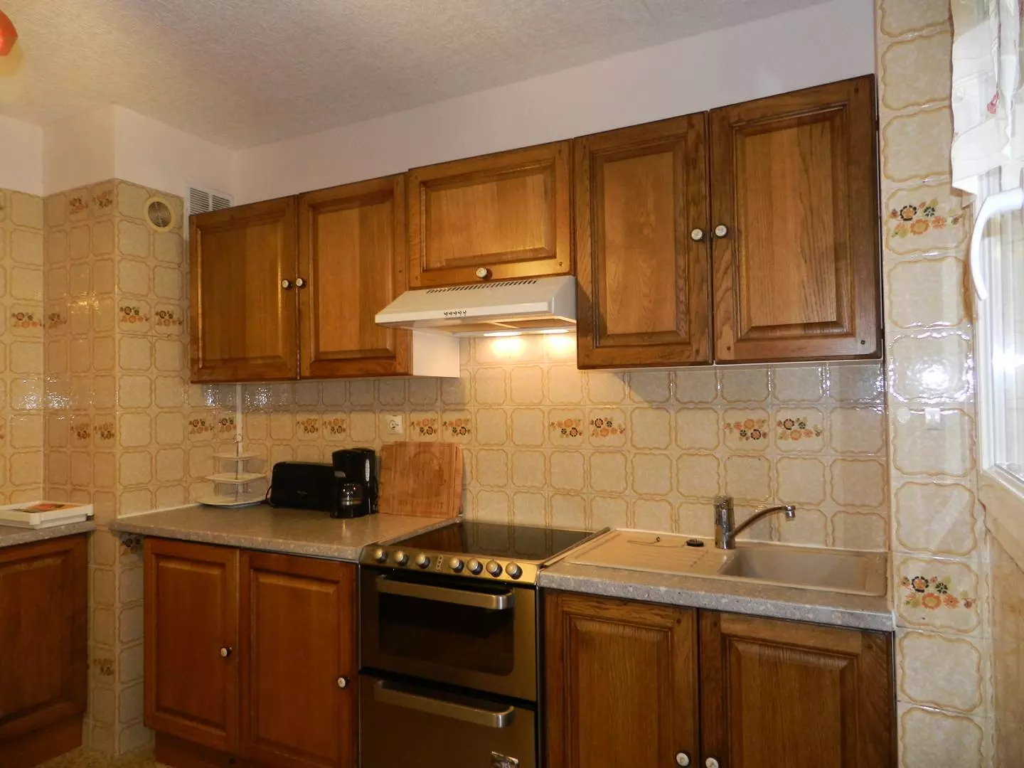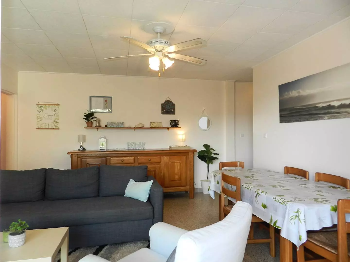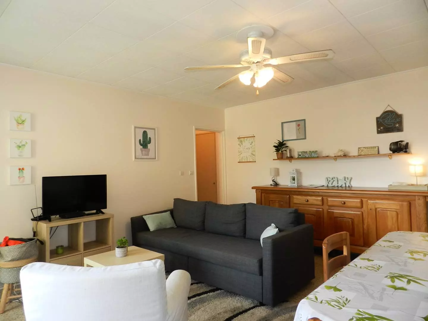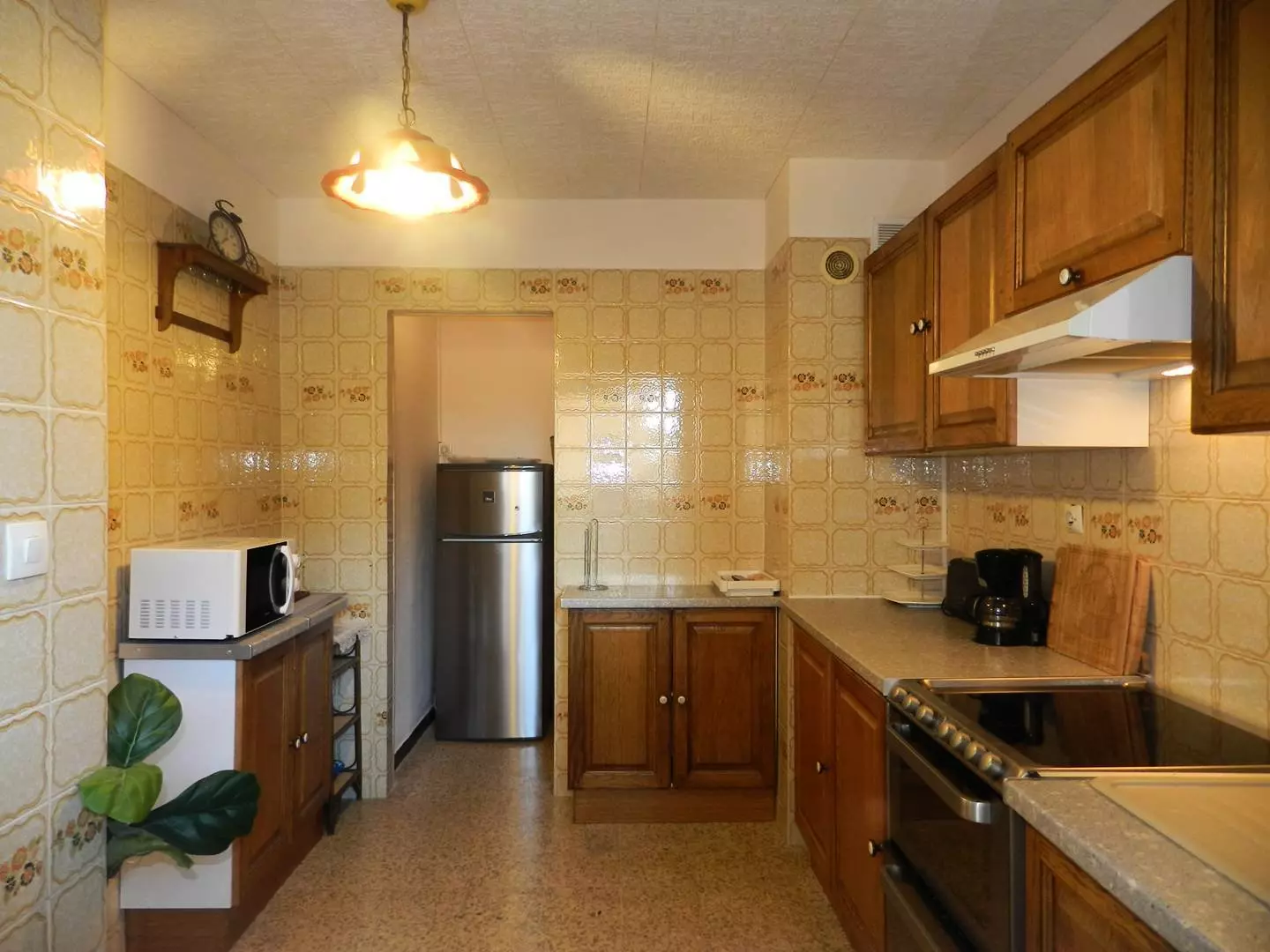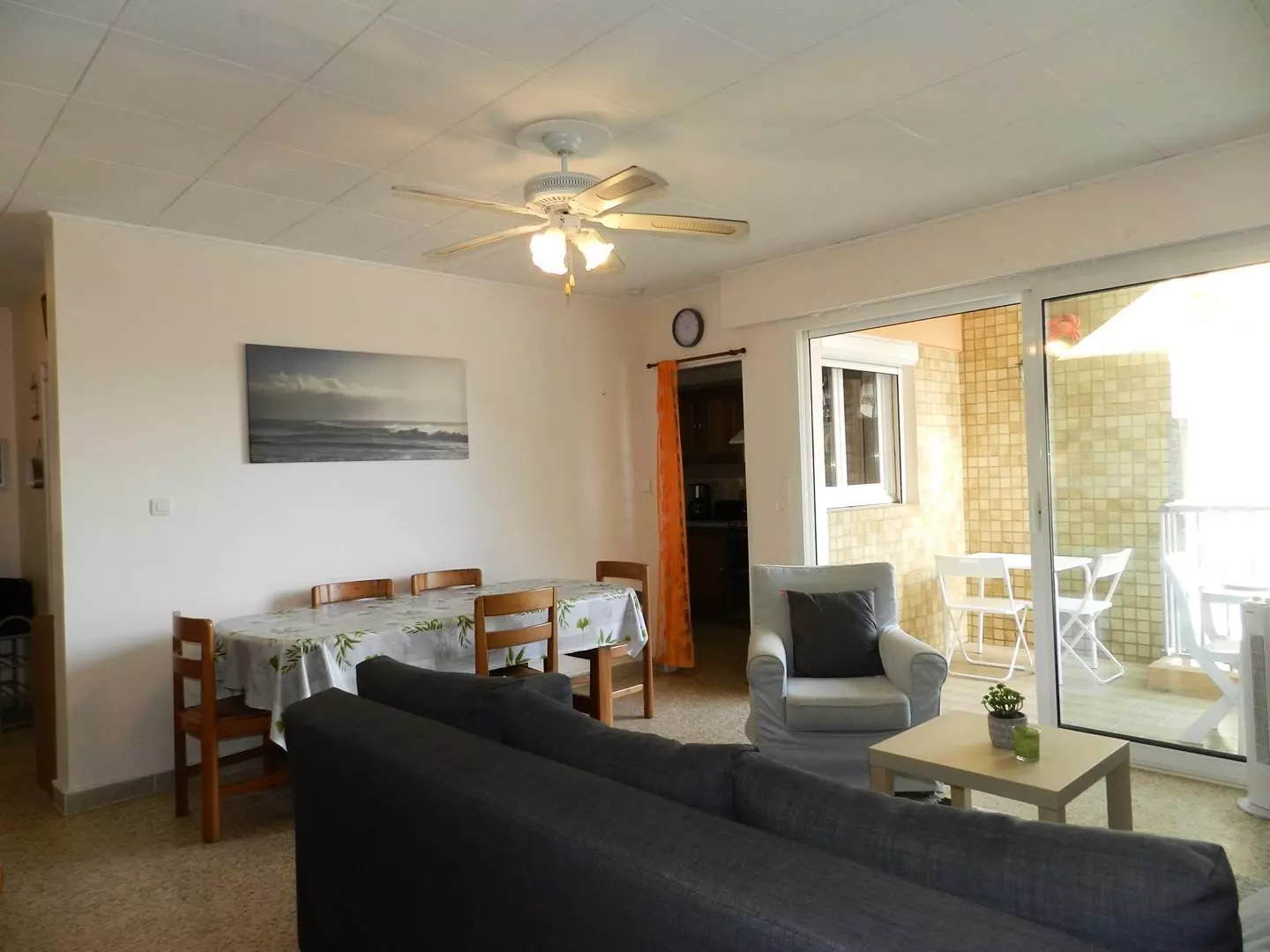 Cet appartement au troisième étage sans ascenseur est composé d'un séjour avec canapé convertible, d'une chambre avec lit double ouvrant sur la terrasse orientée Nord-Est ,une cabine avec lits superposés, d'une cuisine indépendante et d'une salle d'eau avec WC.