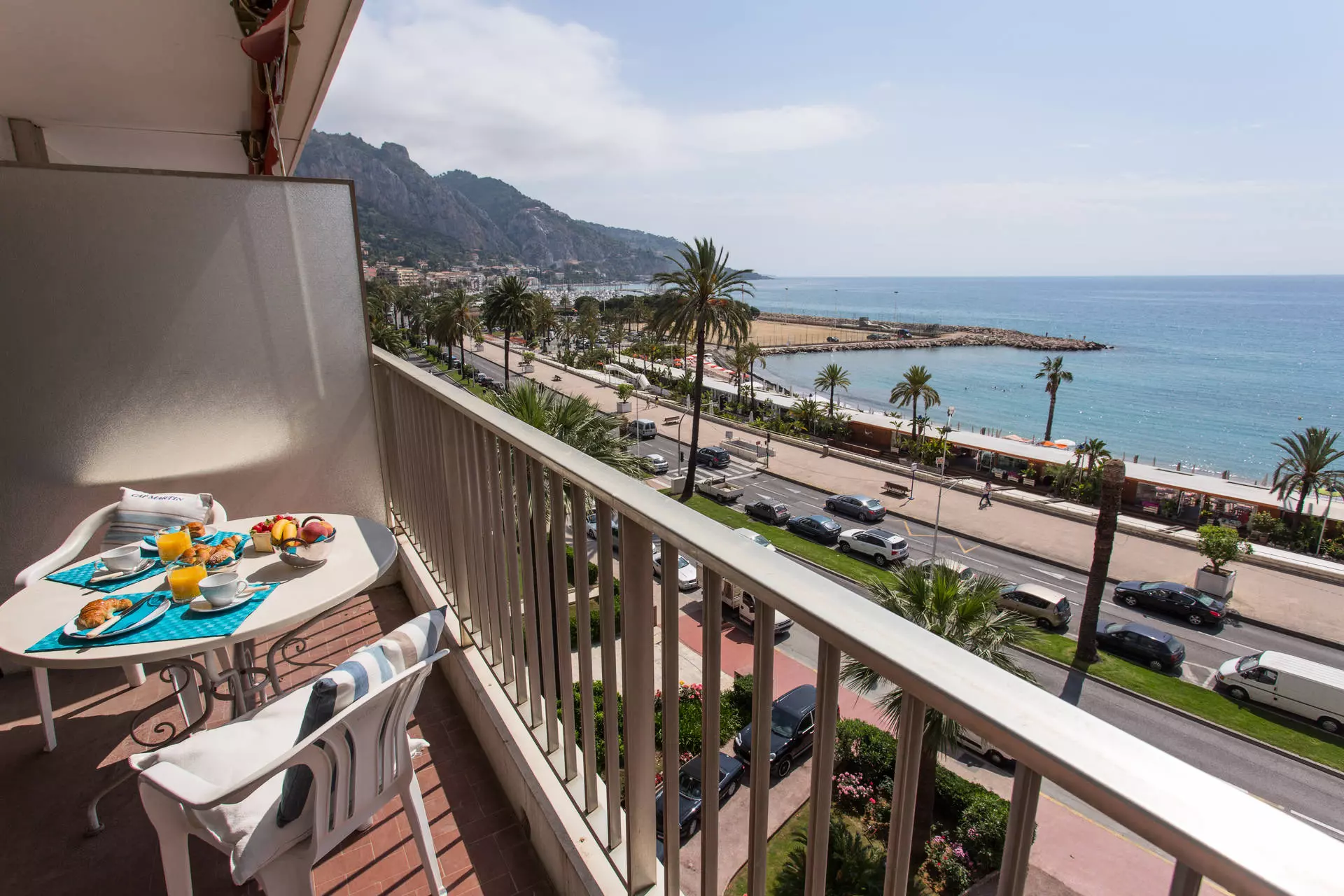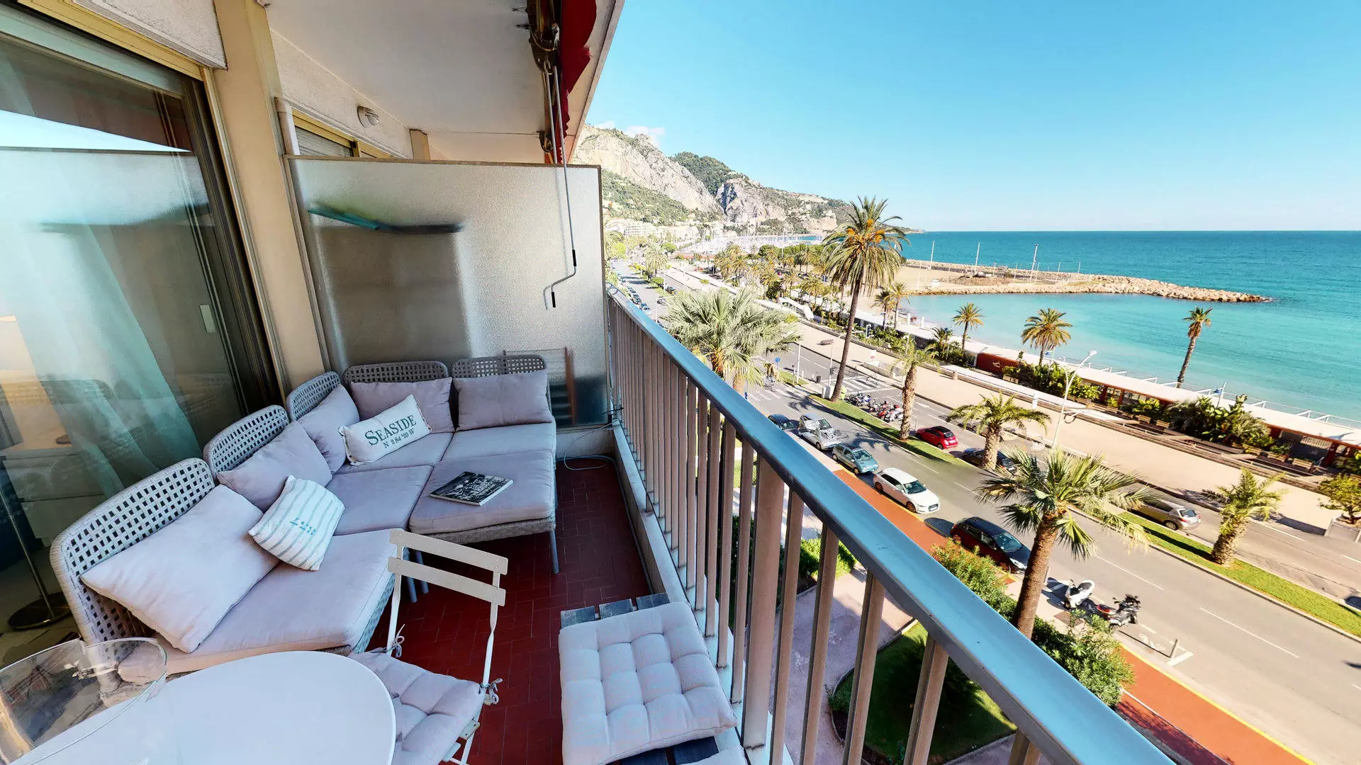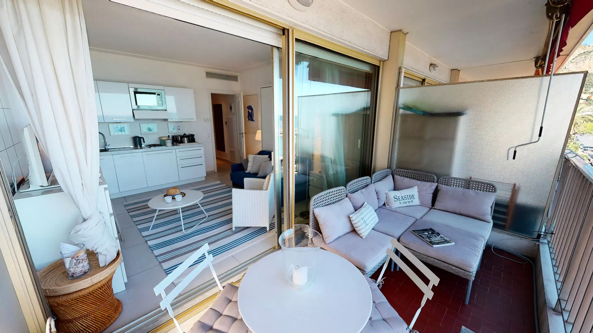 Superbe studio tout confort en front de mer pour 2 personnes, entièrement rénové et climatisé, au 5ème étage avec ascenseur et très belle terrasse équipée face à la mer avec vue panoramique sur la " Baie de Garavan ".