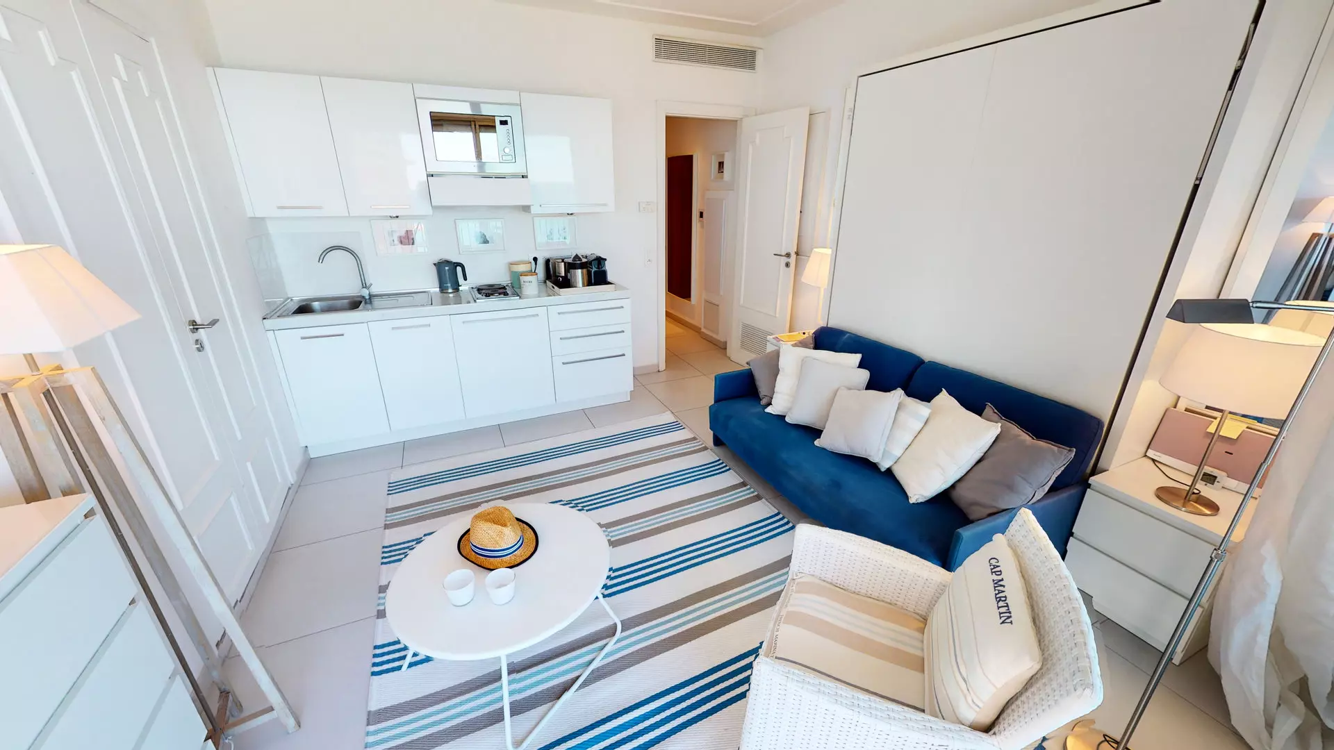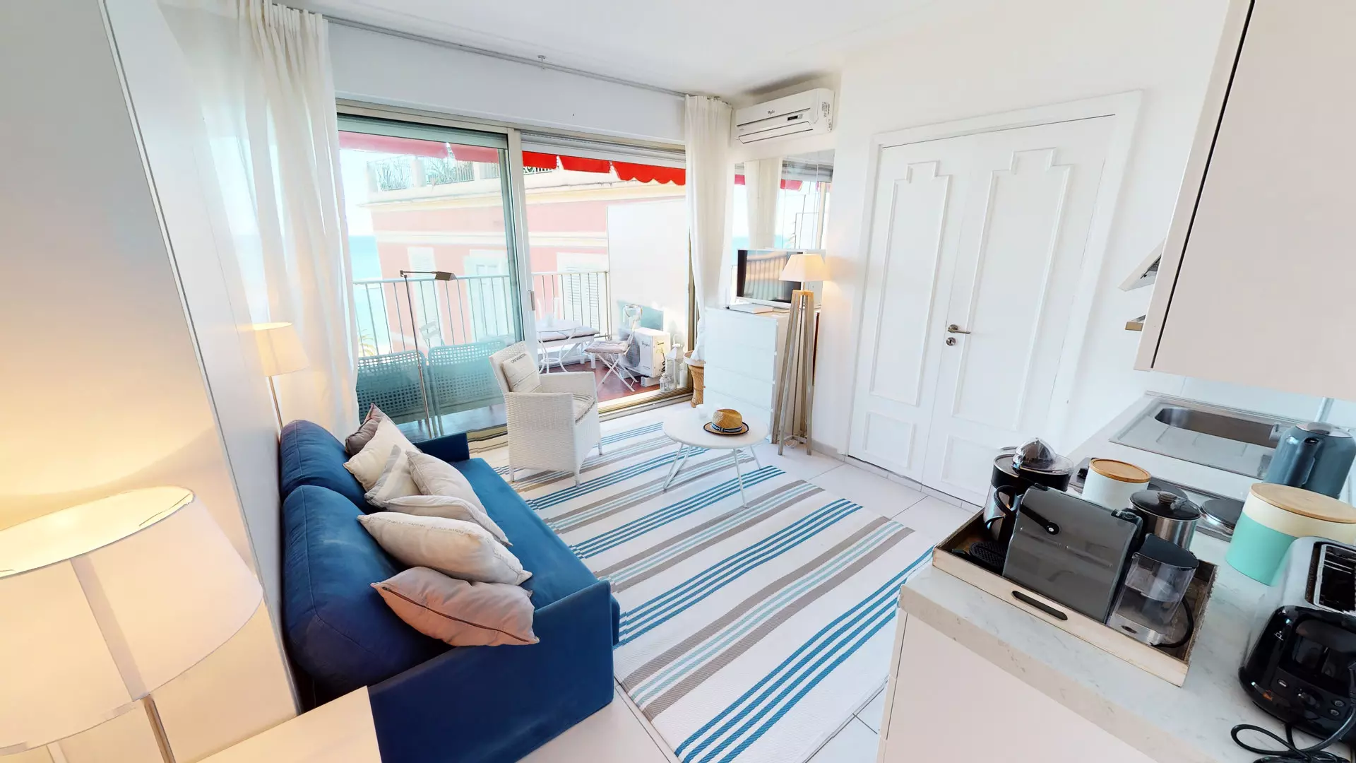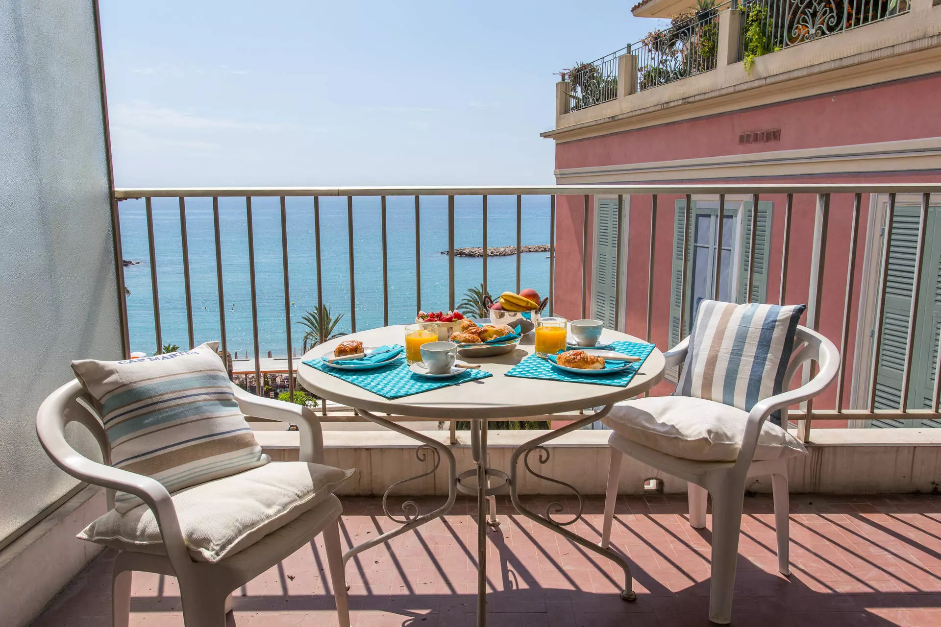 Superbe studio tout confort en front de mer pour 2 personnes, entièrement rénové et climatisé, au 5ème étage avec ascenseur et très belle terrasse équipée face à la mer avec vue panoramique sur la " Baie de Garavan ".