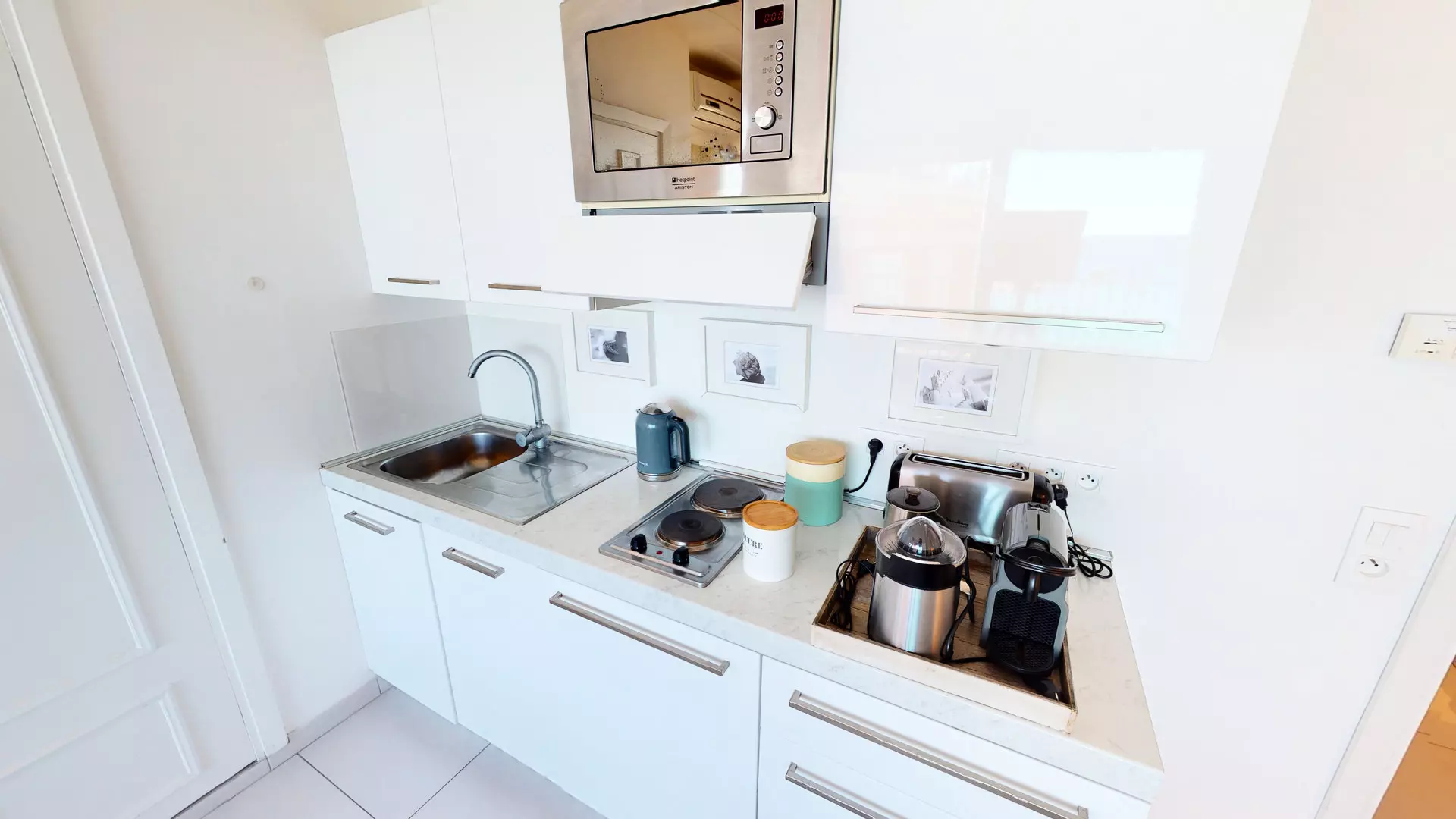 Coin cuisine équipée avec lave-vaisselle, four micro-ondes, plaques électriques et frigo