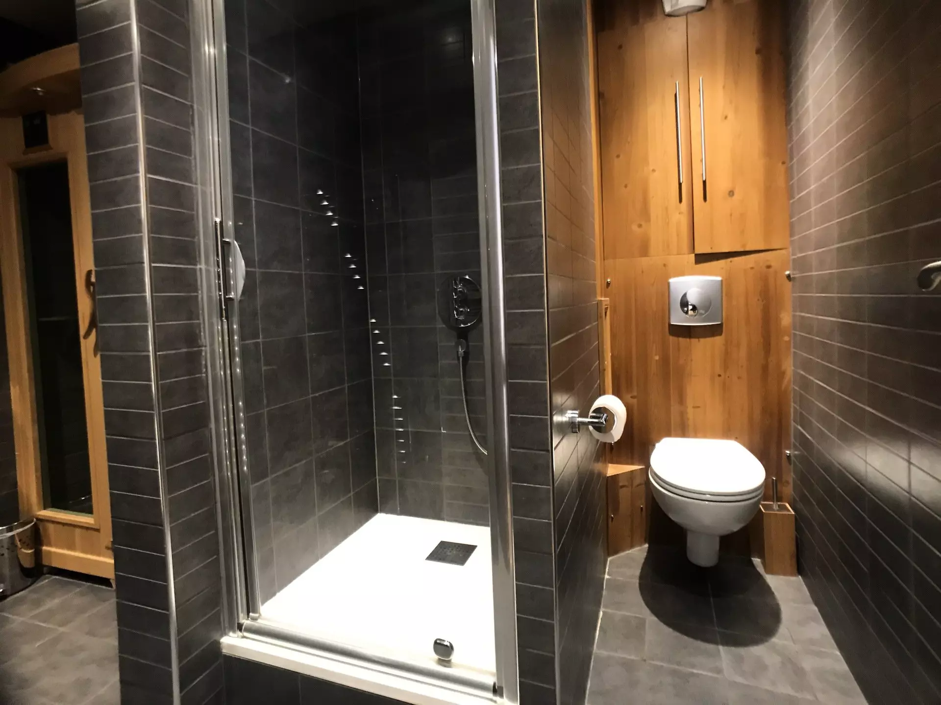 * 1 salle de bain avec lavabo, wc, douche et sauna