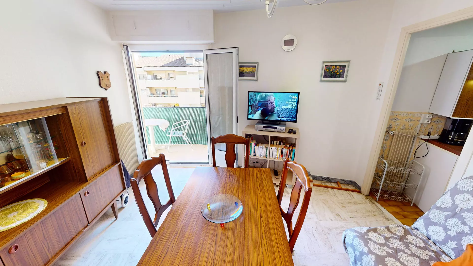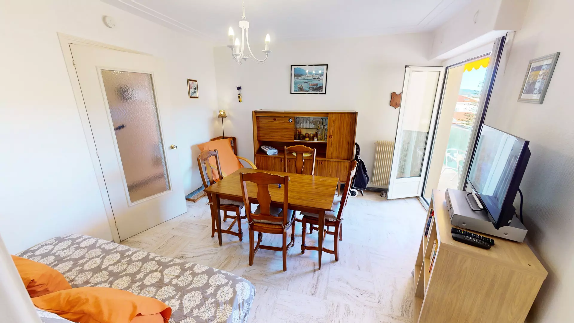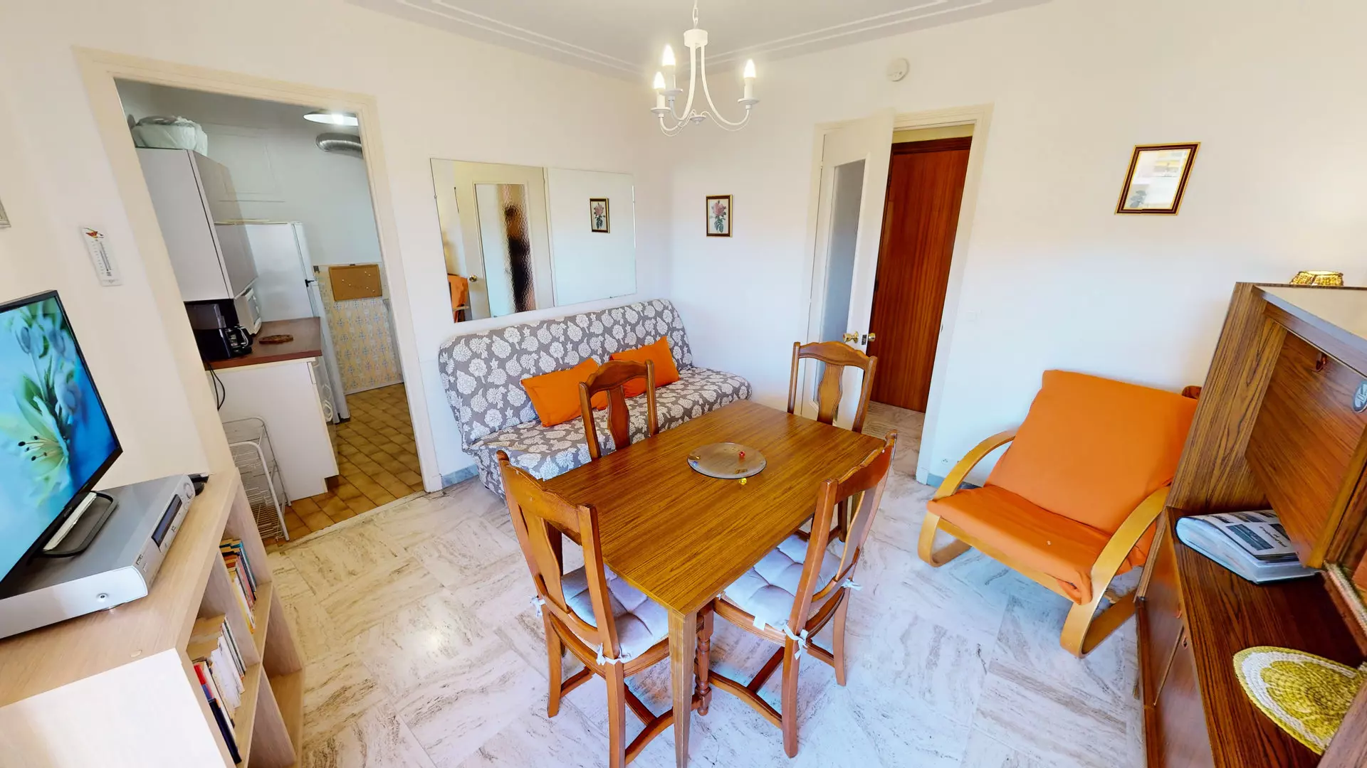 Séjour avec canapé lit 140x190cm et TV.