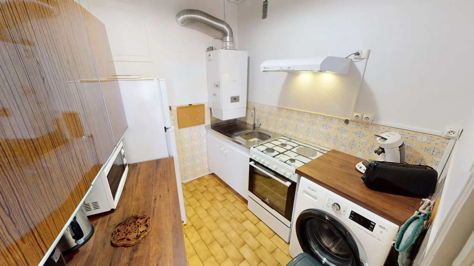 Cuisine séparée équipée de lave-linge, four traditionnel, plaques à gaz 4 feux, microonde, grille pain, cafetière type Senseo, bouilloire, cafetière électrique à filtres et réfrigérateur/congélateur.