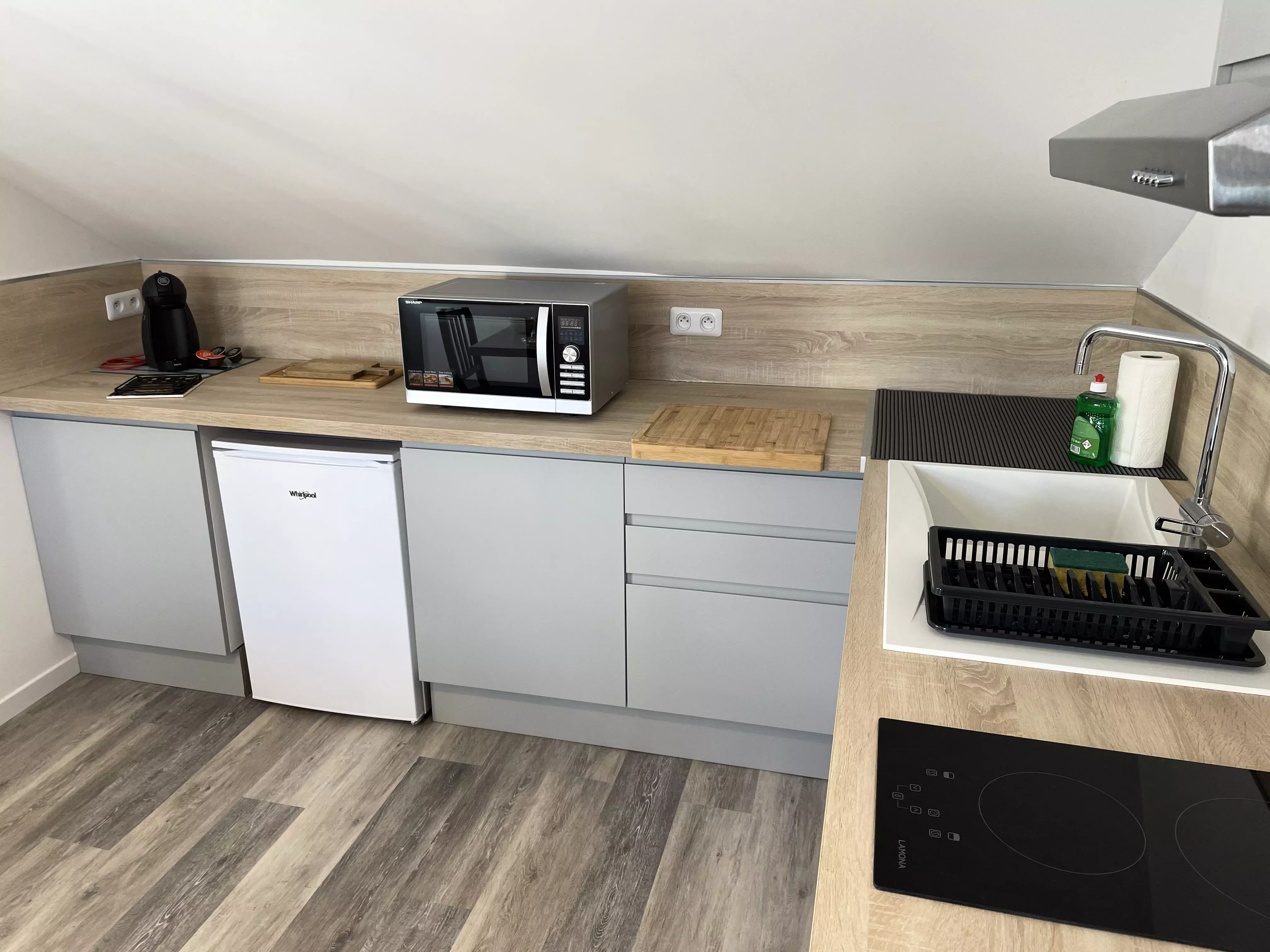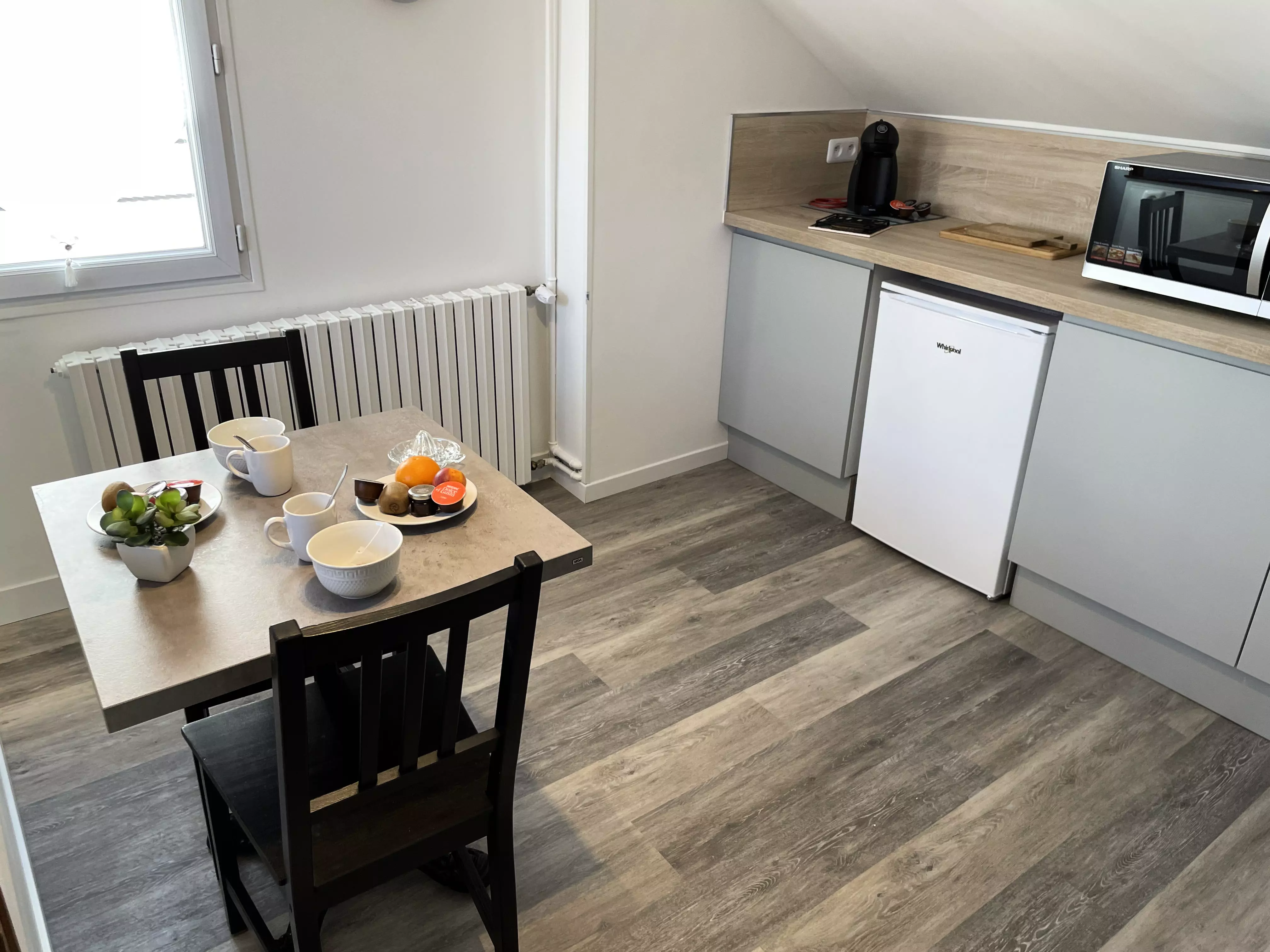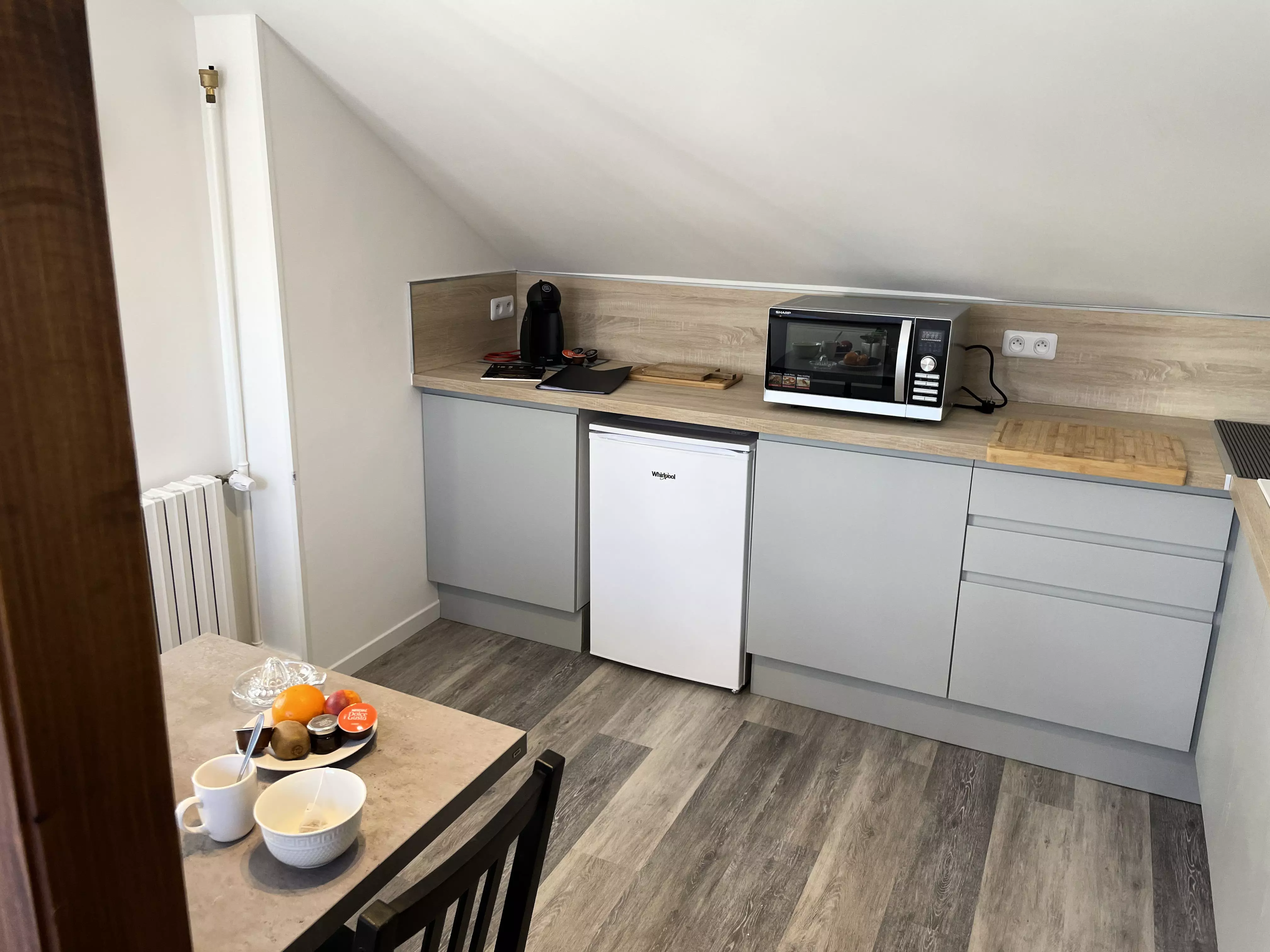 -COIN CUISINE EQUIPE (Sol : parquet / Murs : peinture et crédence) : éléments haut et bas, évier, égouttoir, plaque de cuisson vitrocéramique 2 feux, hotte aspirante, réfrigérateur table-top, four combiné micro-ondes, bouilloire, cafetière dolce gusto, grille-pain, vaisselles, ustensiles de cuisine et de cuisson, table et deux chaises, poubelle.