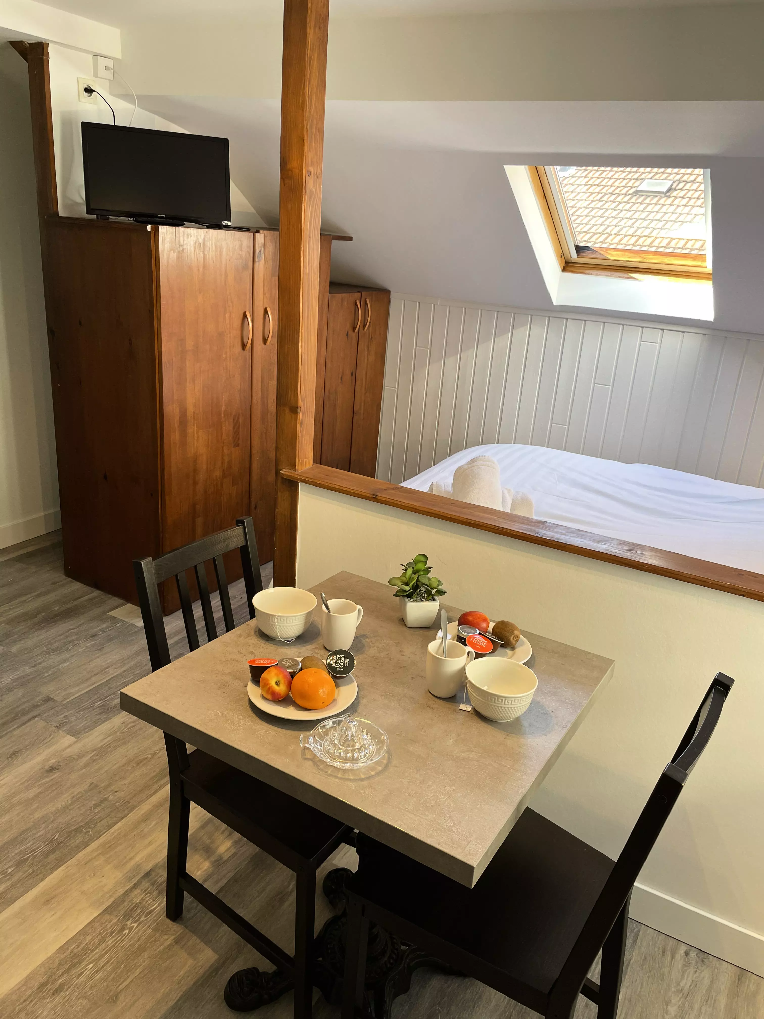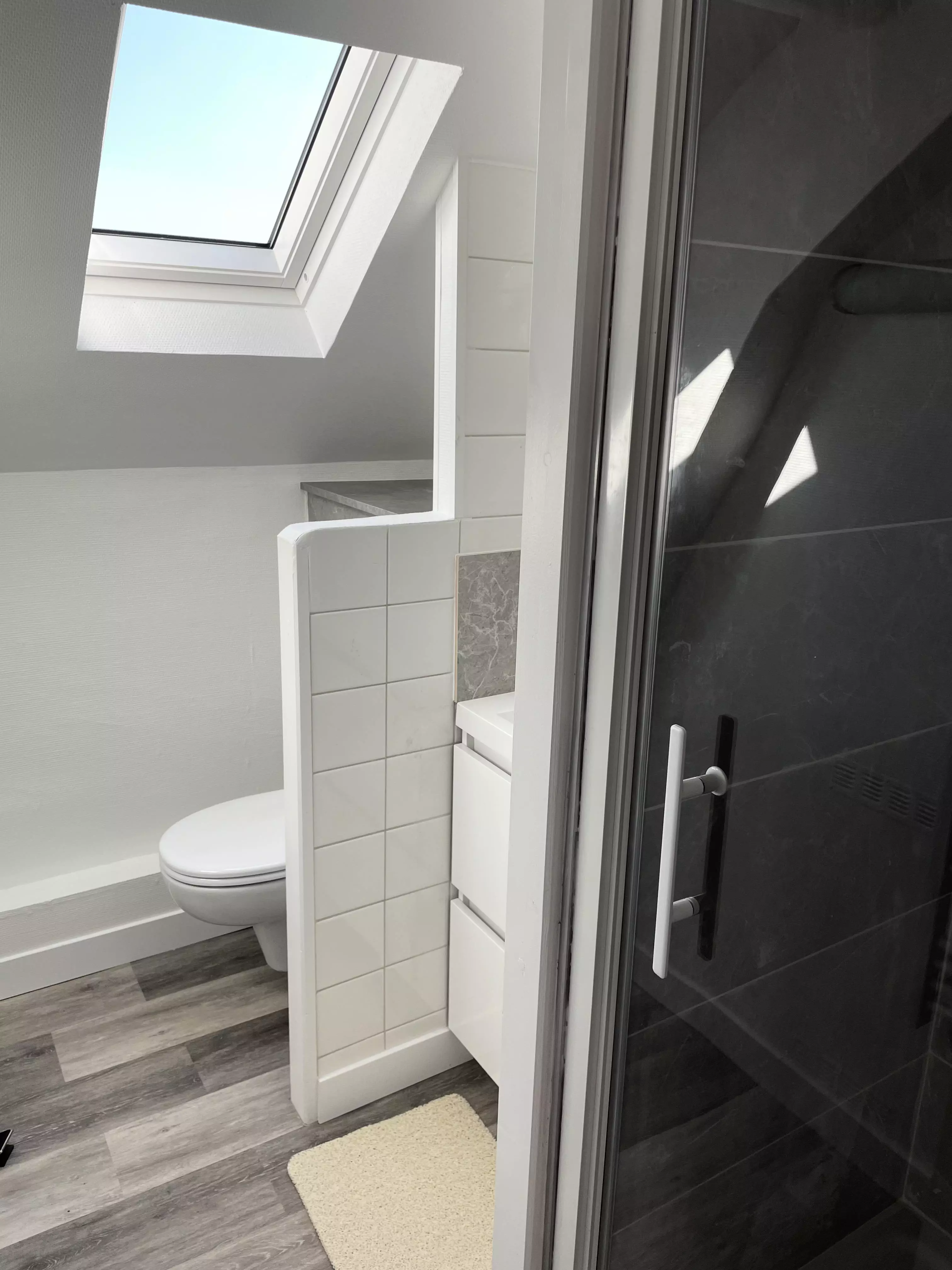 Dans une maison entièrement réhabilitée en 6 studios TOUT CONFORT, au 2ème et dernier étage sans ascenseur, coquet studio meublé et renové à neuf.