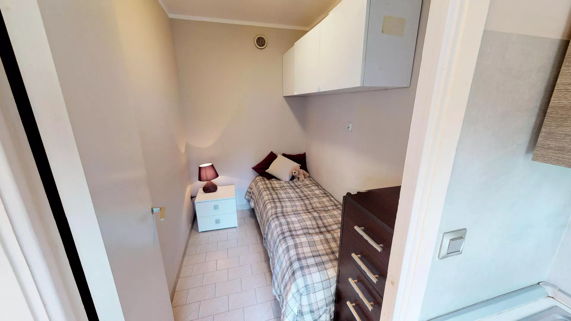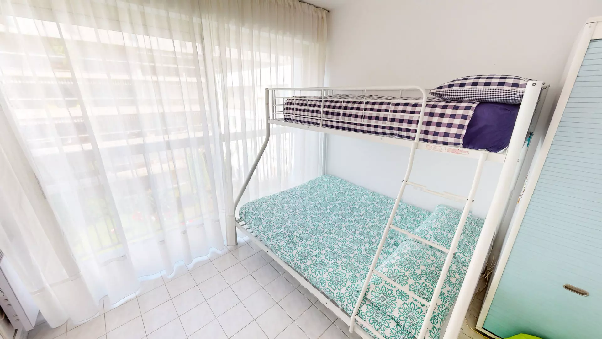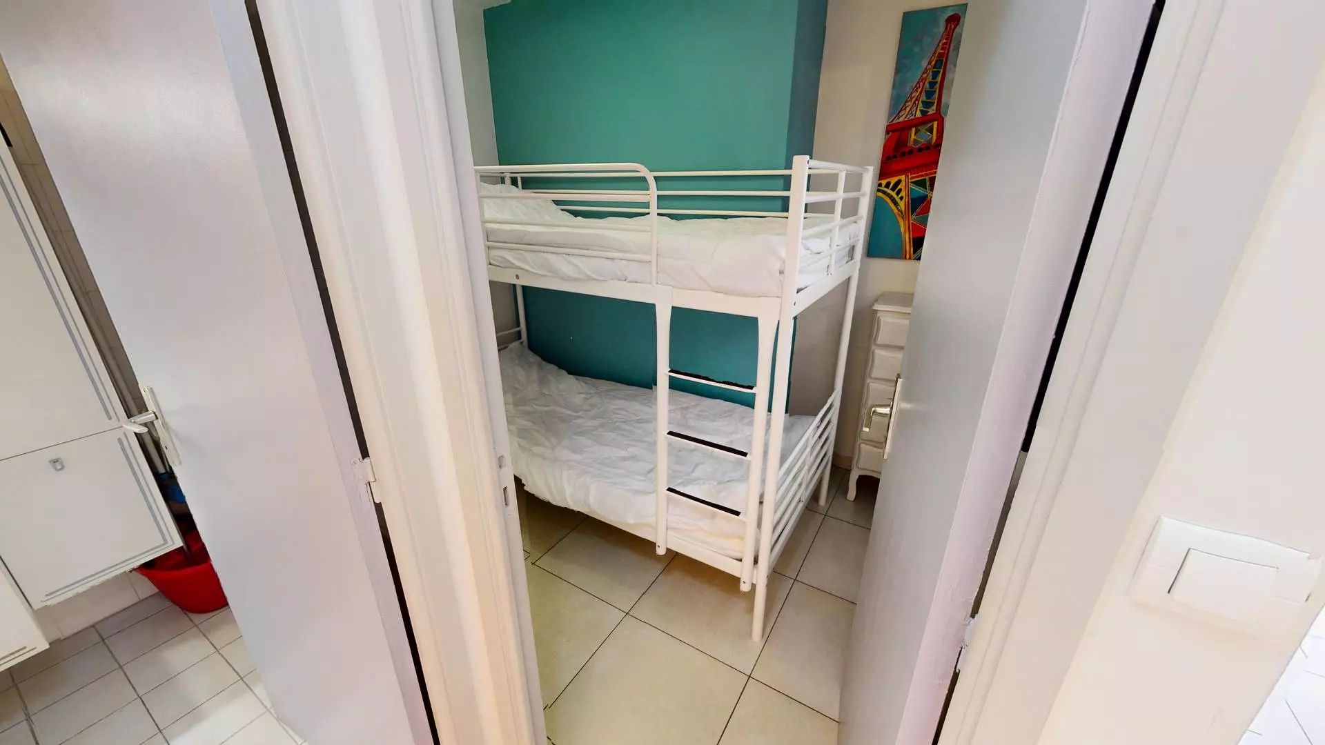 Chambre d'enfants avec lits superposés (140x200cm en dessous et 70x190cm au dessus) et rangements.