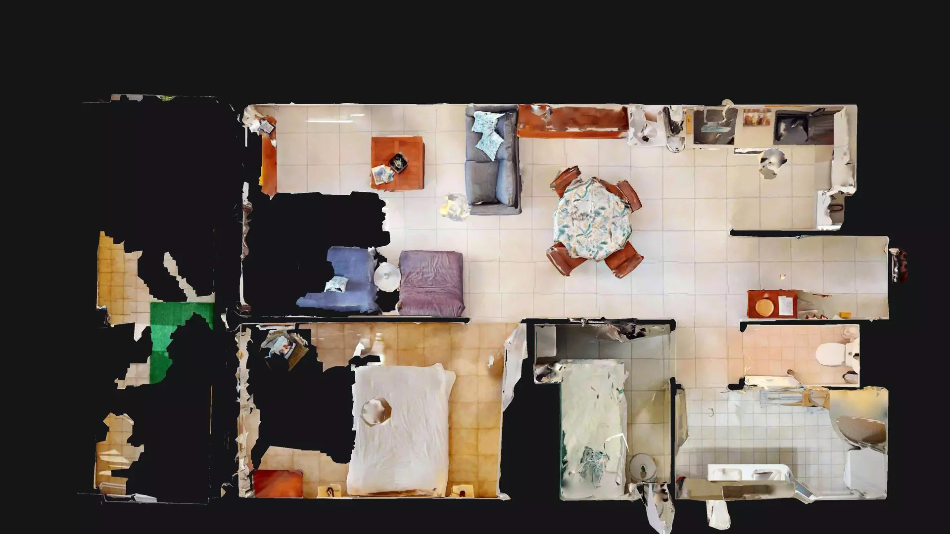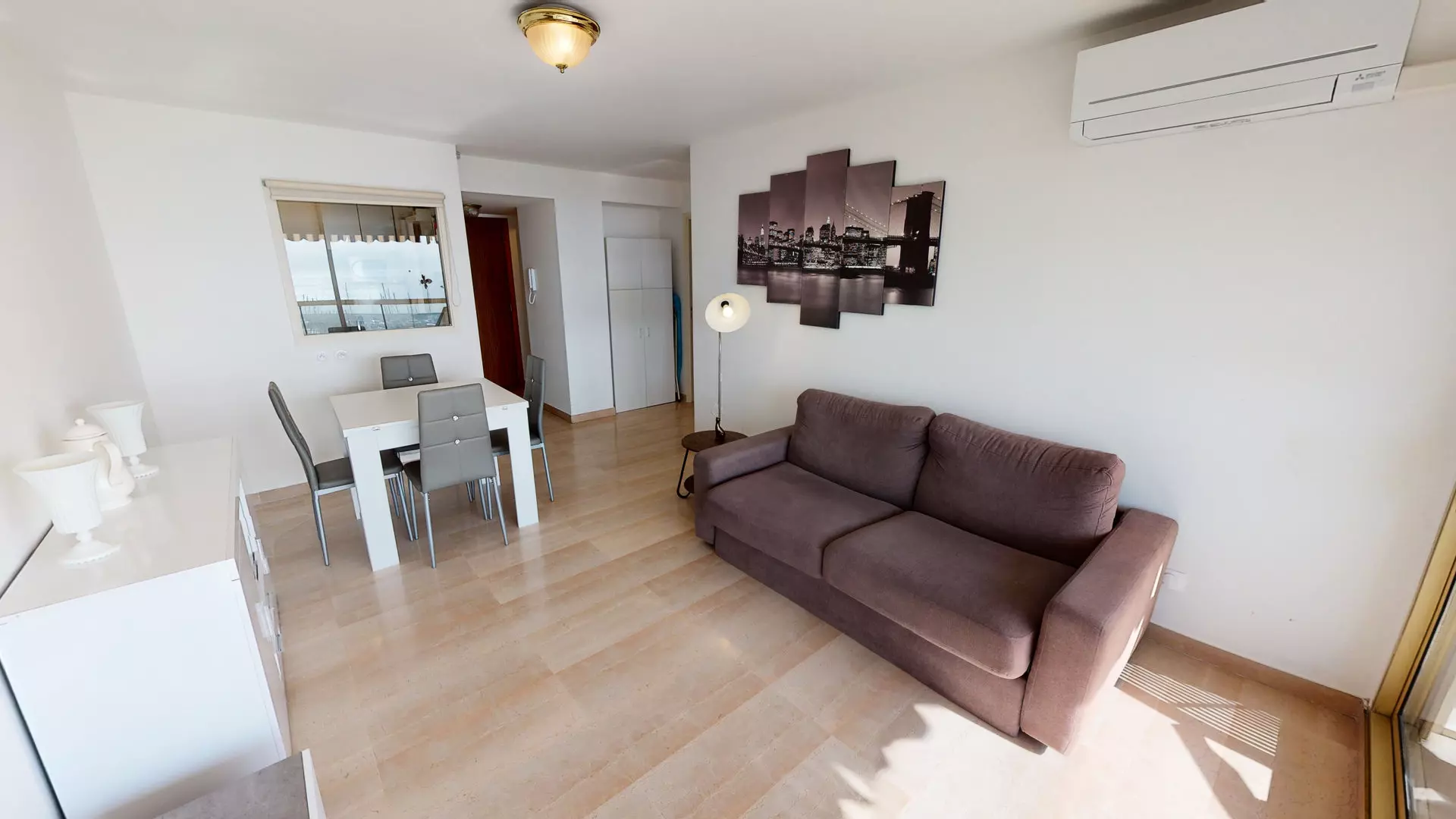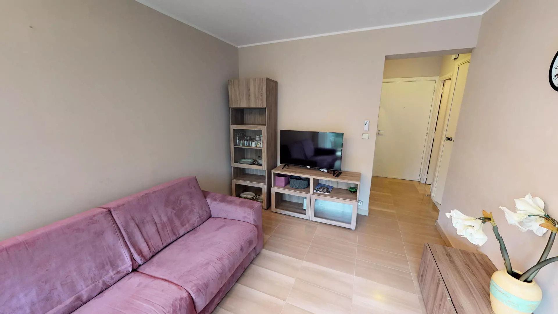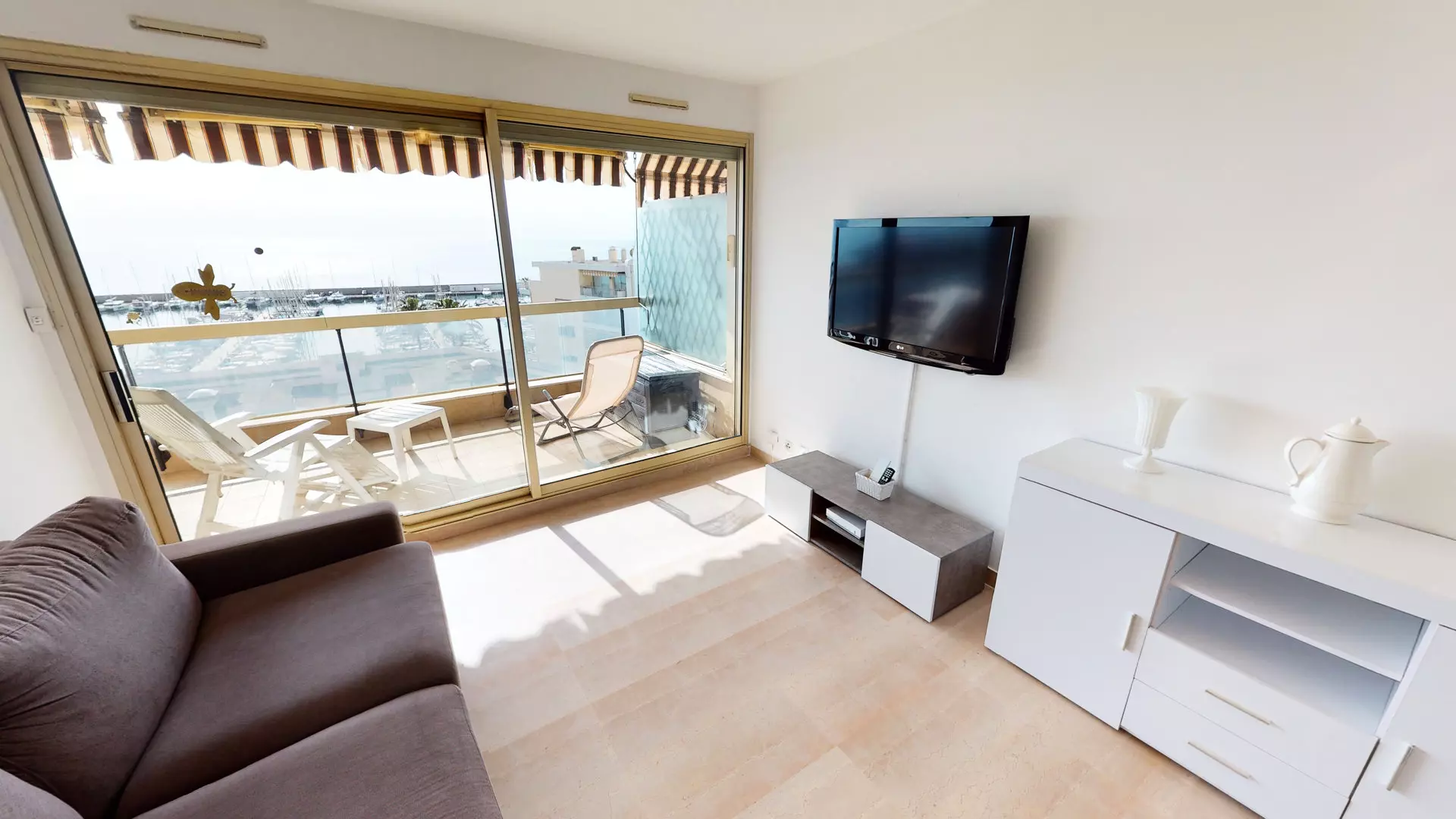 Séjour avec canapé lit double 140x190cm et TV écran plat.