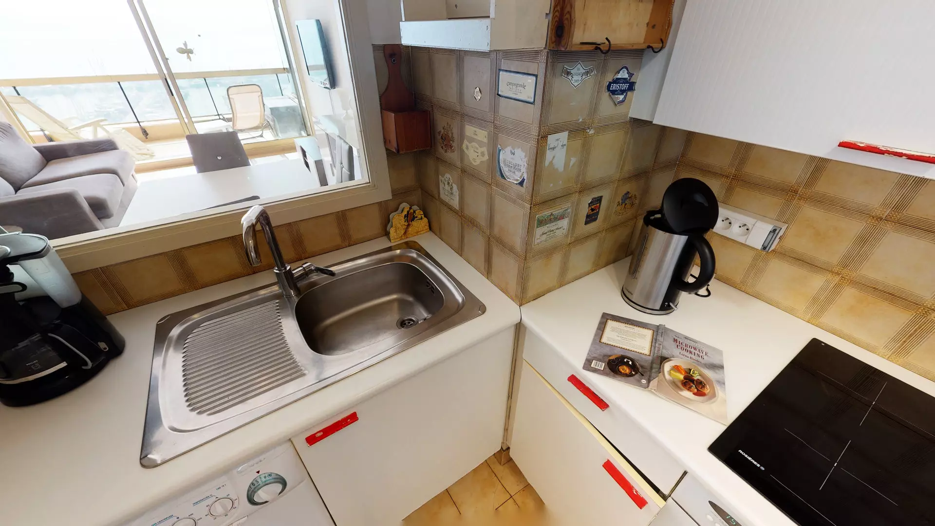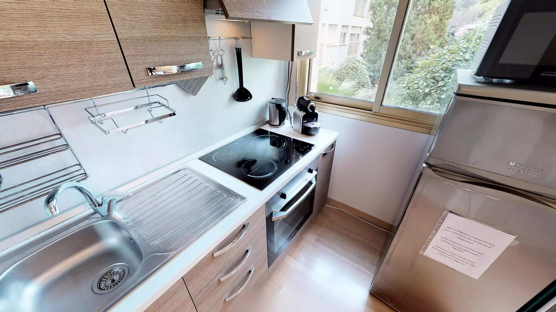 Coin cuisine équipé de four traditionnel, plaque à induction 3 feux, microonde, cafetière type Senseo, réfrigérateur/congélateur, lave-vaisselle, bouilloire et cafetière éectrique à filtres.
