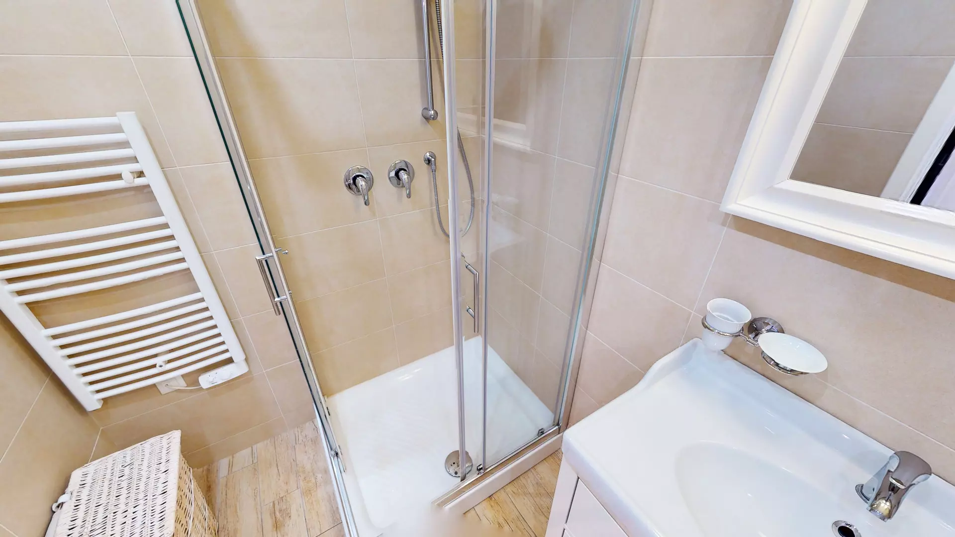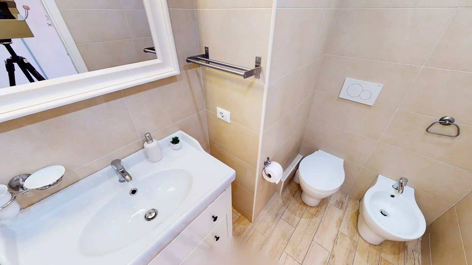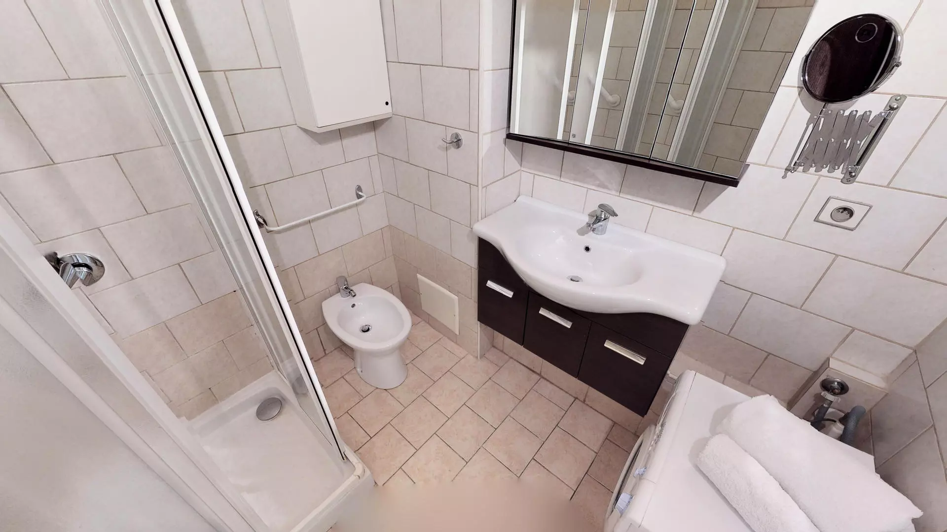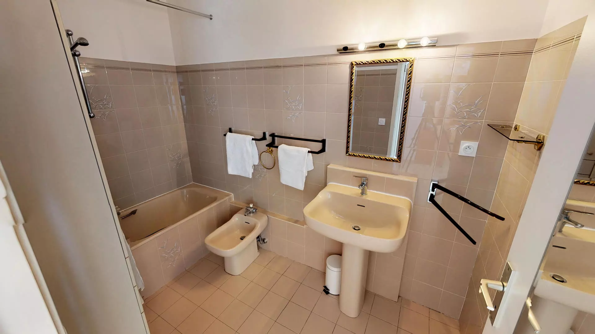 Salle d'eau avec douche, lavabo, WC et bidet.