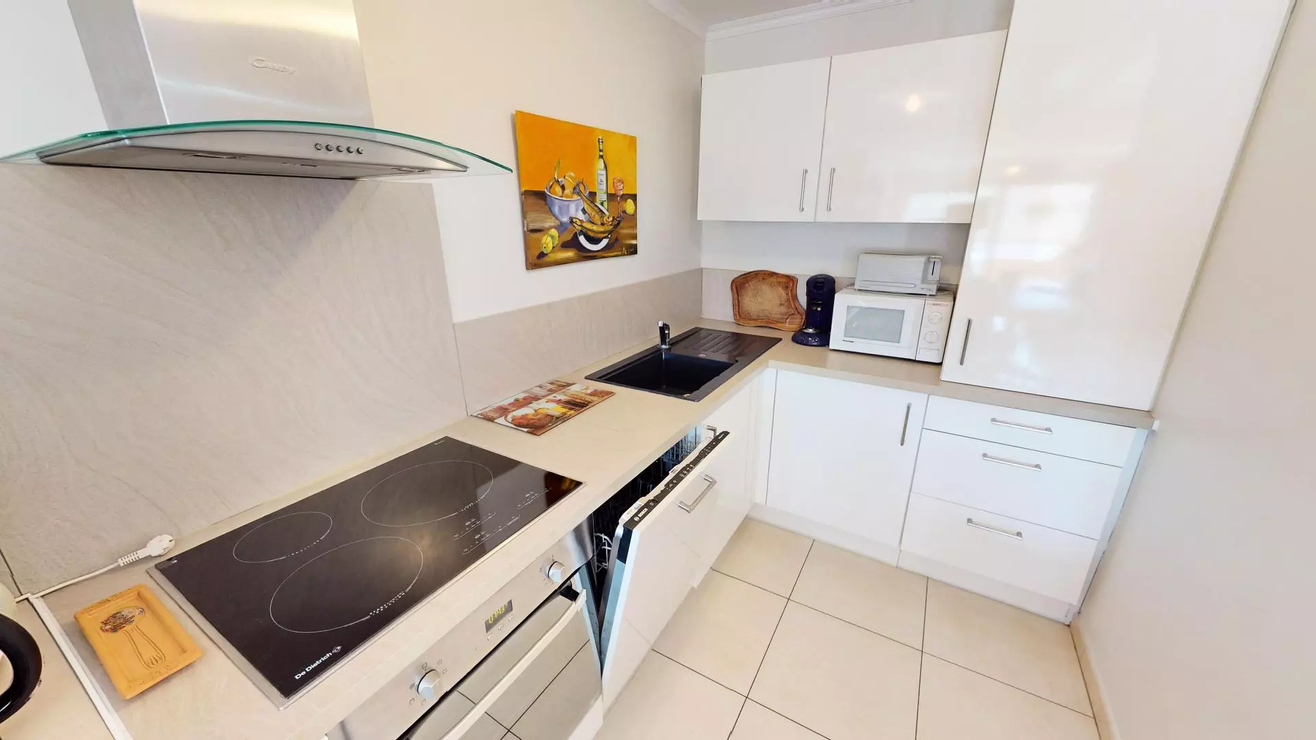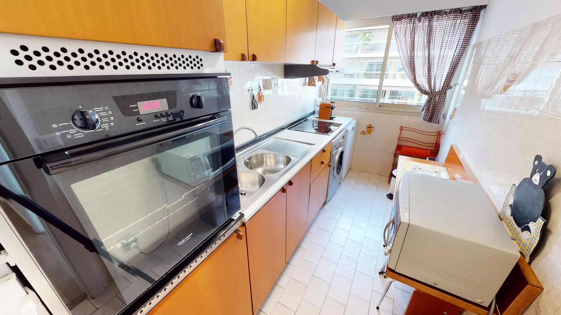 Cuisine séparée avec lave-linge, lave-vaisselle, microonde, four et plaques électriques.