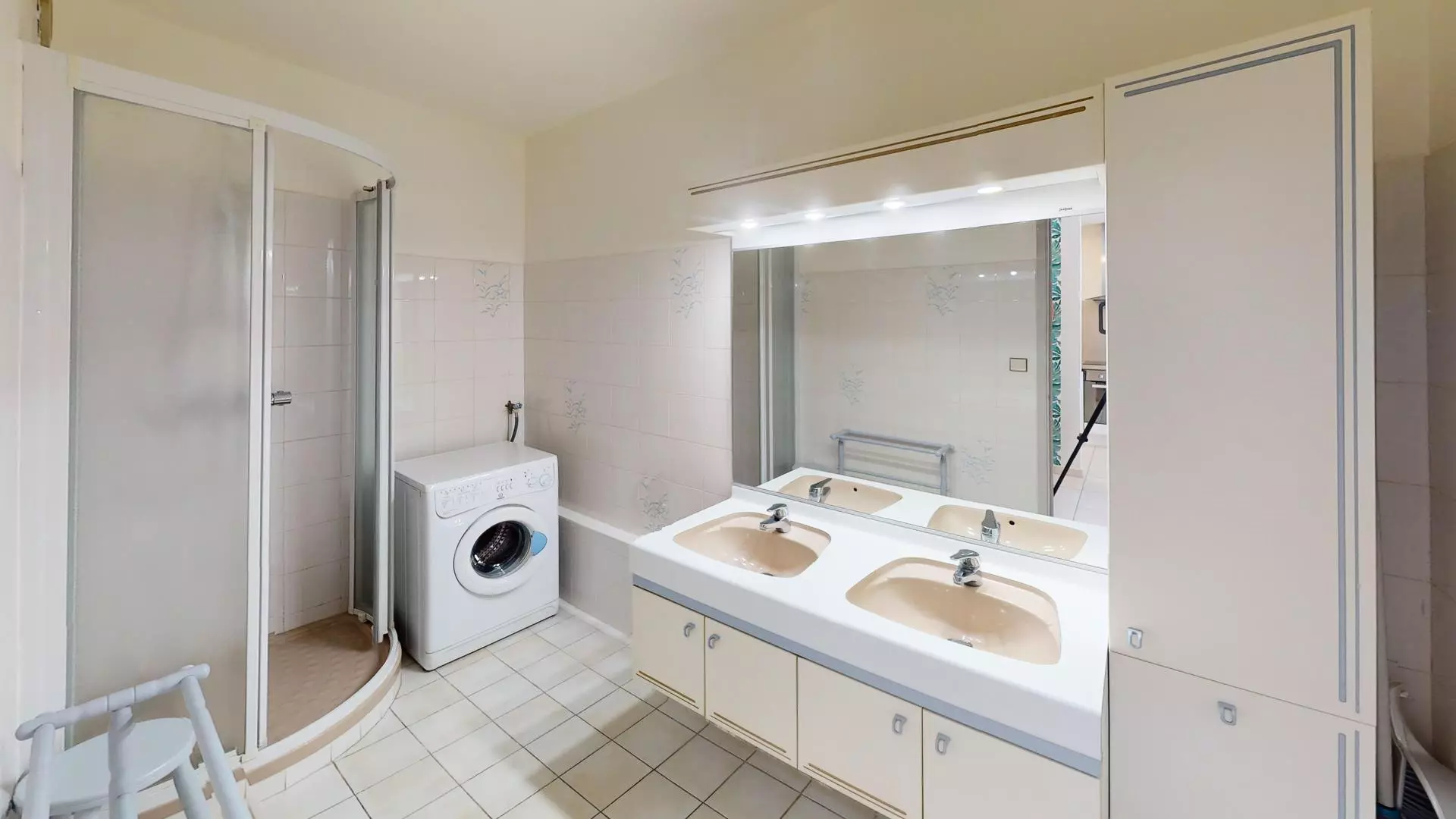 Salle d'eau avec lavabo double vasque, lave-linge et douche.