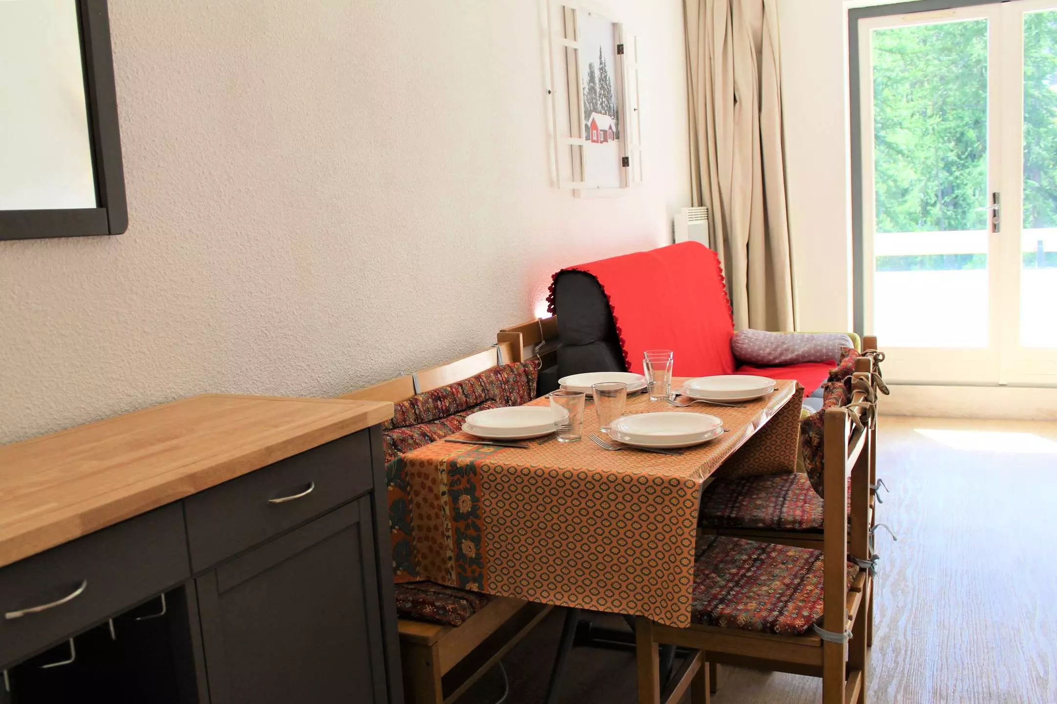 Cette location à la montagne dispose d'un coin cuisine équipé ouvert sur un séjour disposant de deux lits gigognes une personne et d'un coin montagne avec deux lits superposés une place. Cet appartement comprend également une salle de bains avec baignoire et de WC indépendants.