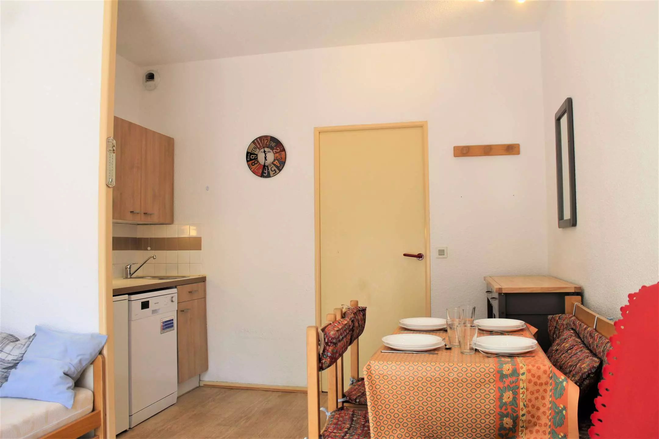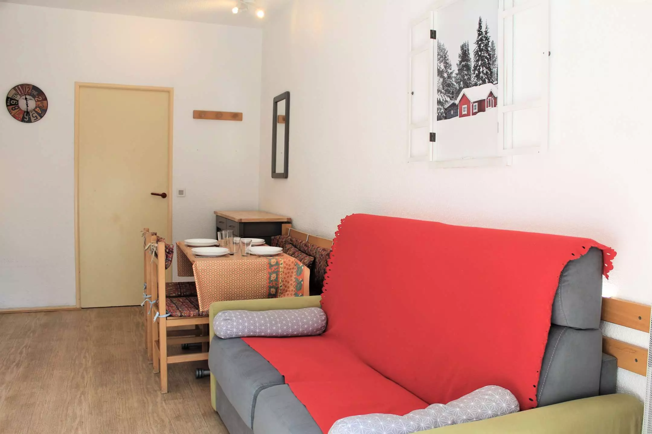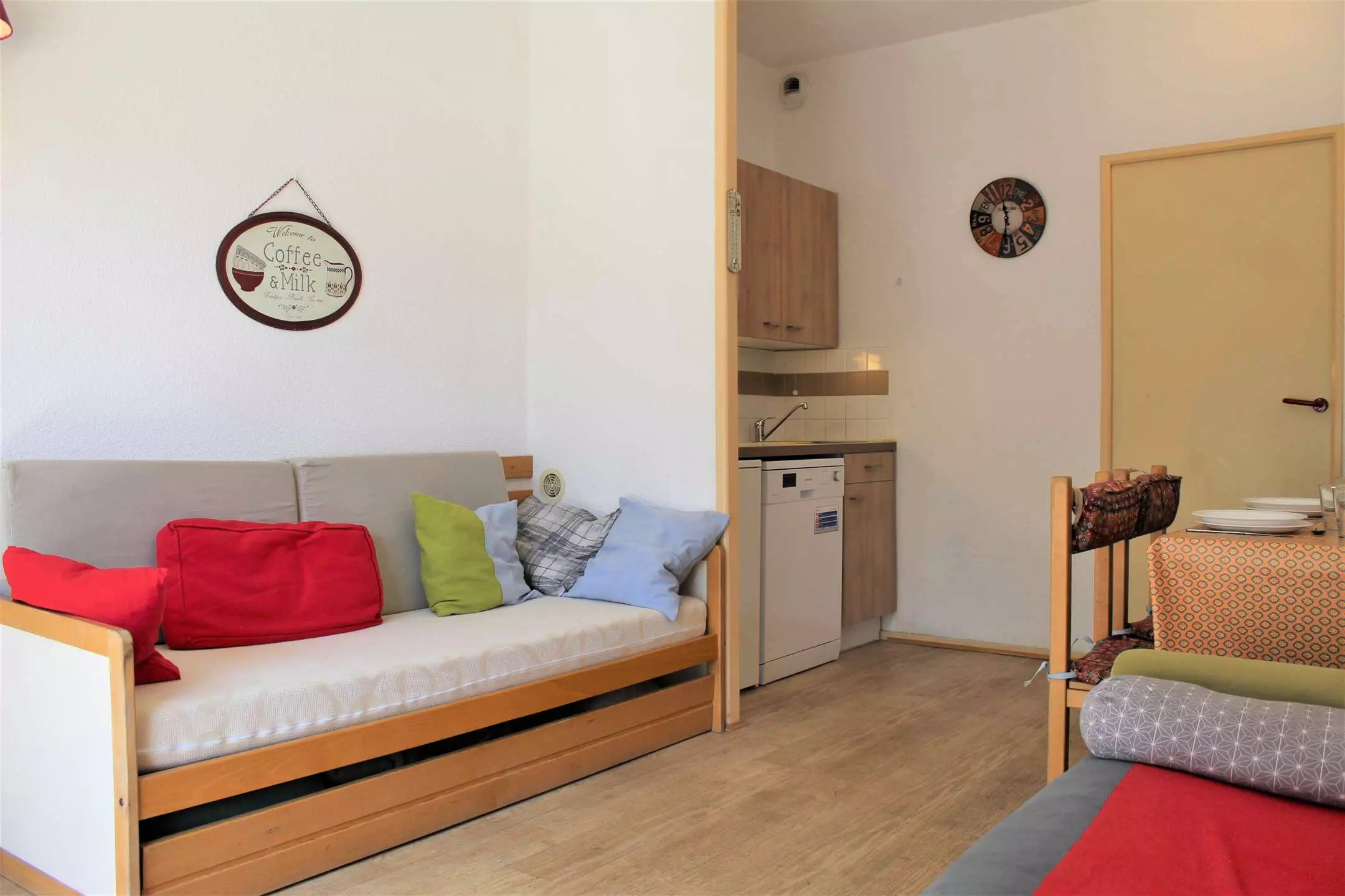 Cet appartement à la montagne se compose d'un coin cuisine équipé ouvert sur un séjour disposant d'un canapé convertible pour deux personnes. Il dispose également d'un coin nuit avec deux lits superposés une place, d'une salle de bains avec baignoire et d'un WC indépendant.
