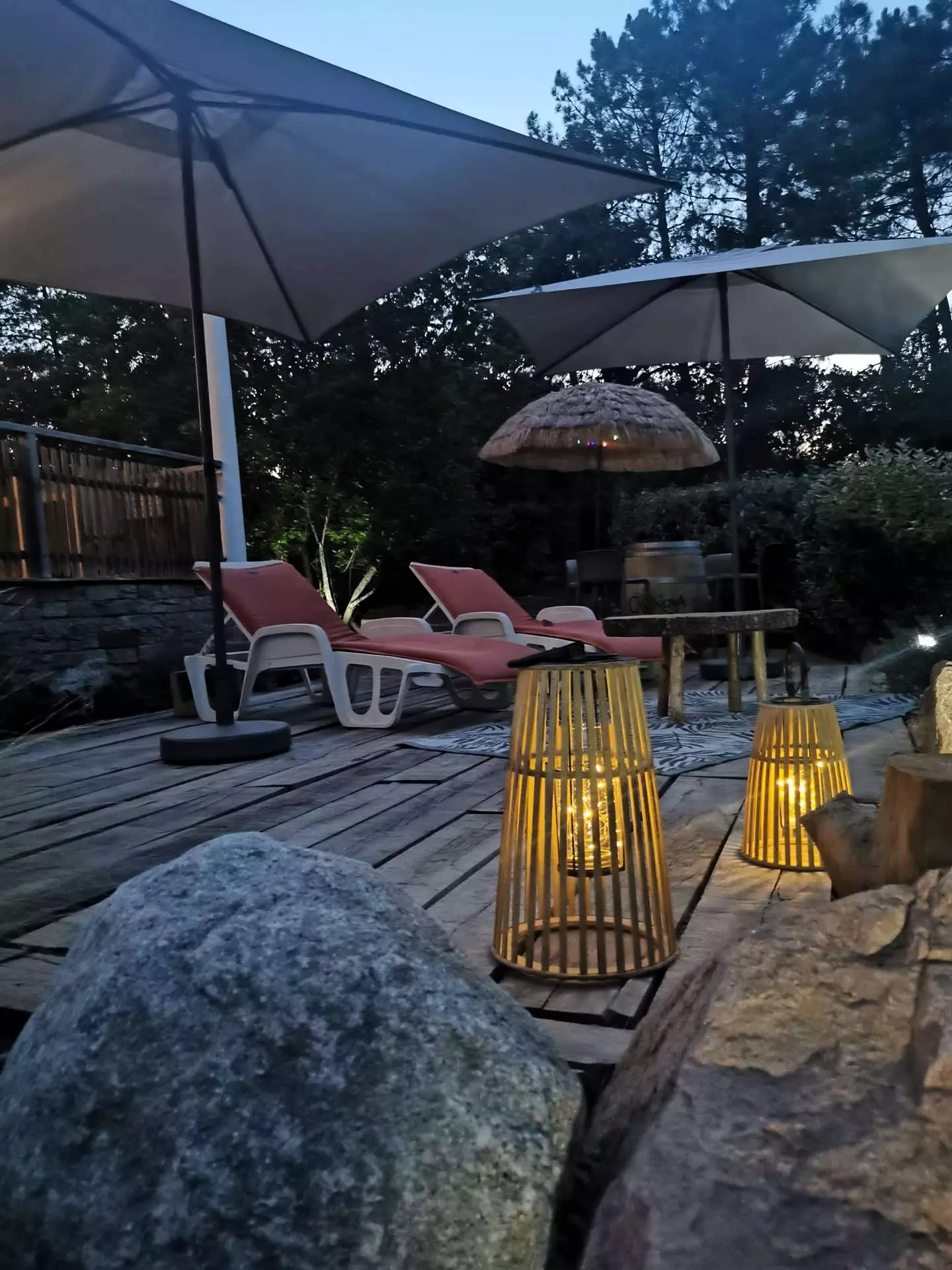 Jardin avec chaises longues et barbecue & douchette extérieure