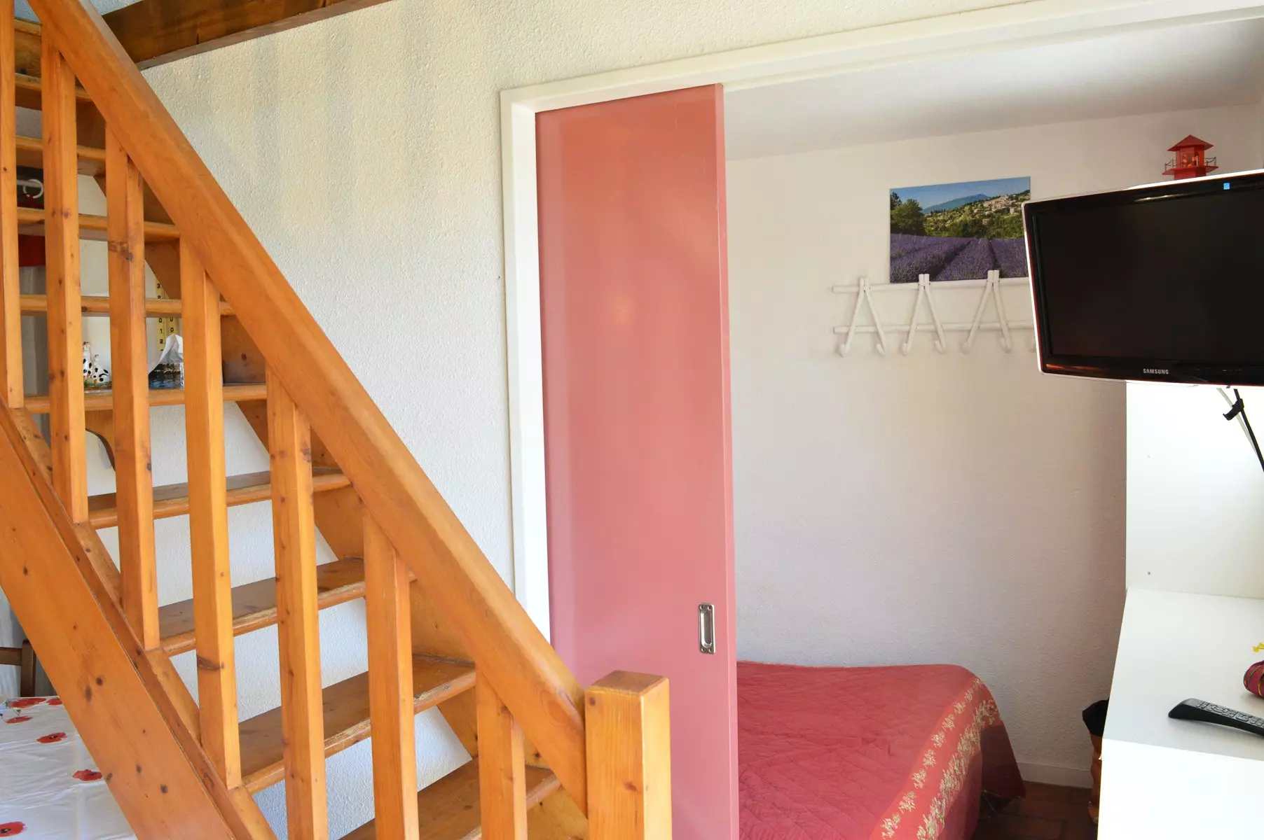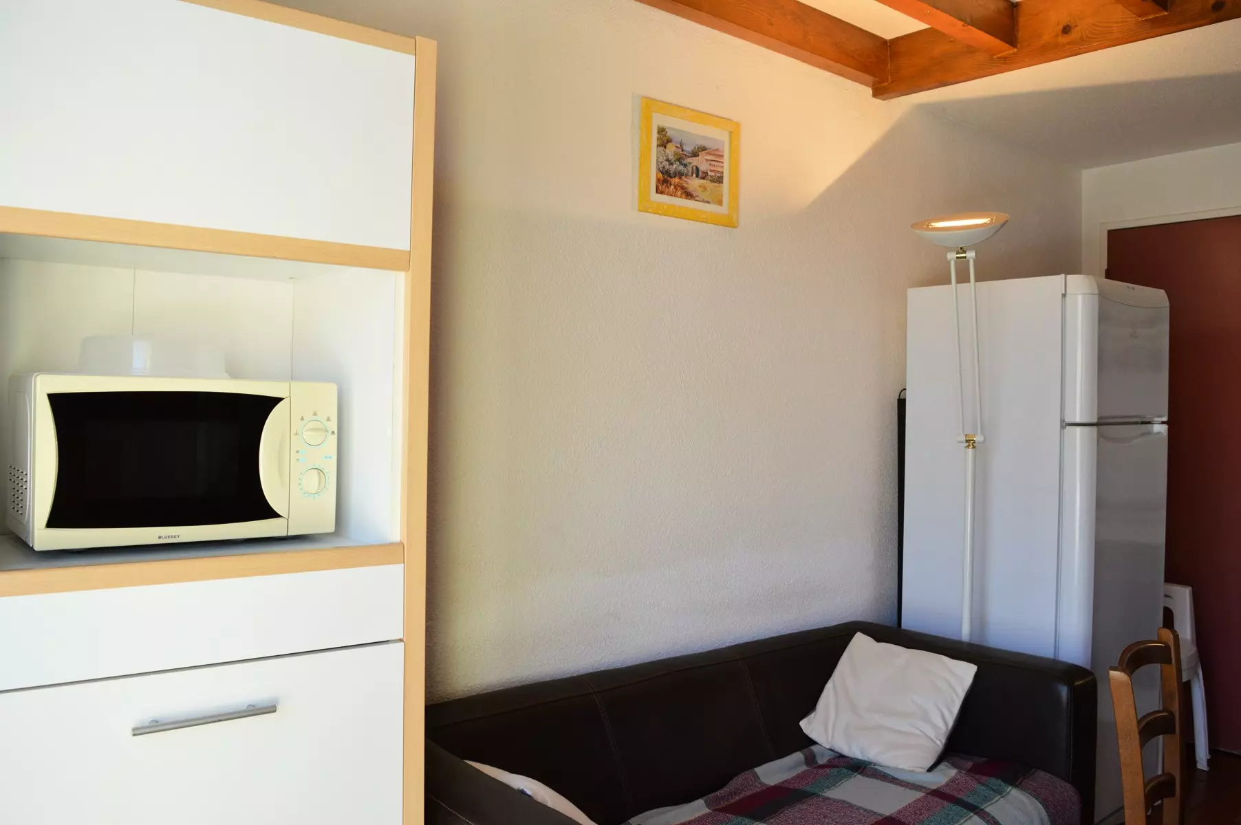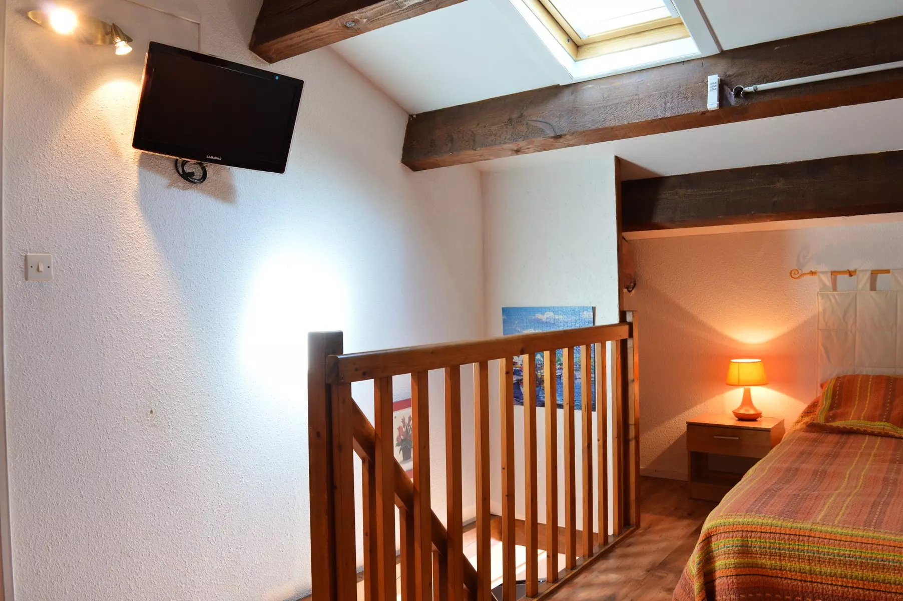 Cette location de pavillon de vacances en famille, possède un séjour avec télévision (sous réserve d'une bonne réception) et canapé non convertible, une kitchenette équipée avec micro-ondes, une chambre avec un lit deux places, une salle d'eau avec WC. A l'étage, se trouve une chambre avec un lit 120x190 et une mezzanine avec un lit deux personnes et télévision.