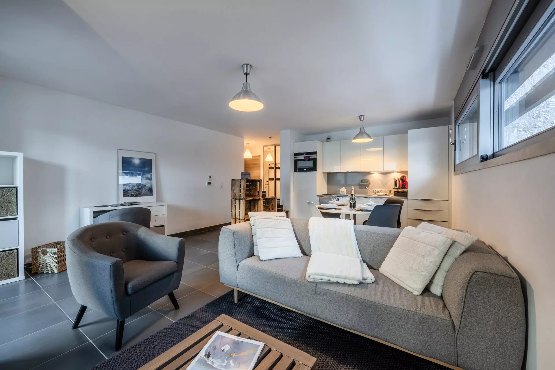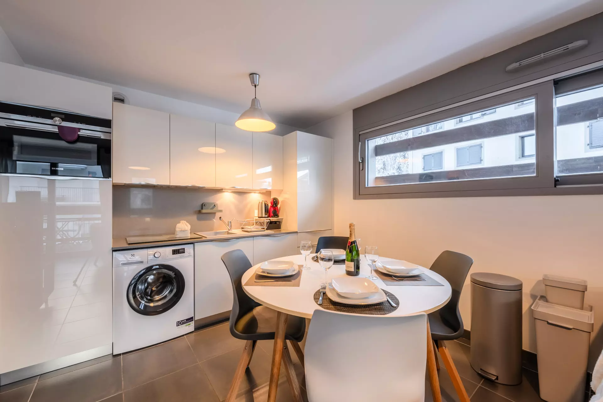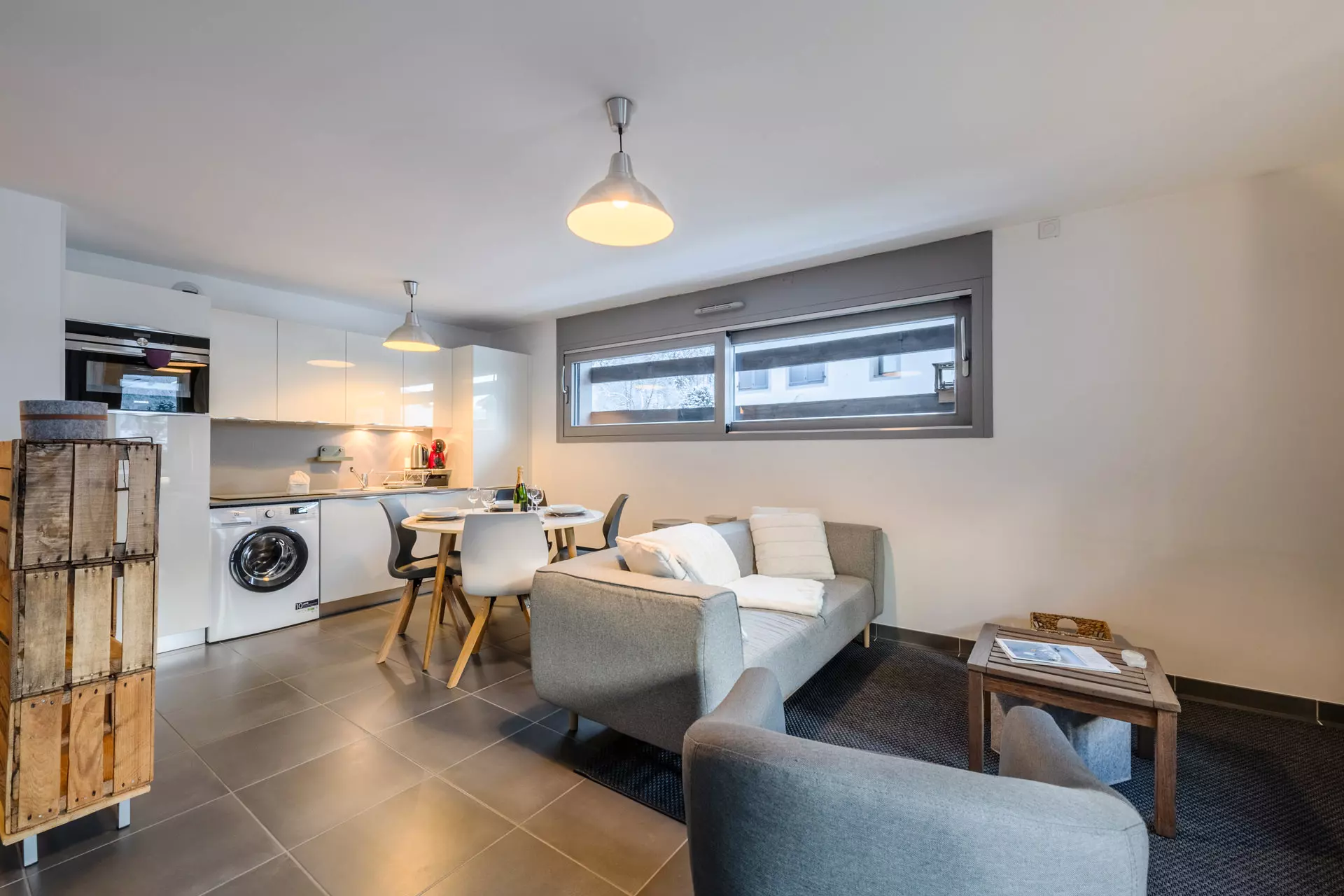• Cuisine ouverte et équipée (réfrigérateur, lave-vaisselle, plaques vitrocéramiques , combi four / micro-ondes, lave-linge, bouilloire).