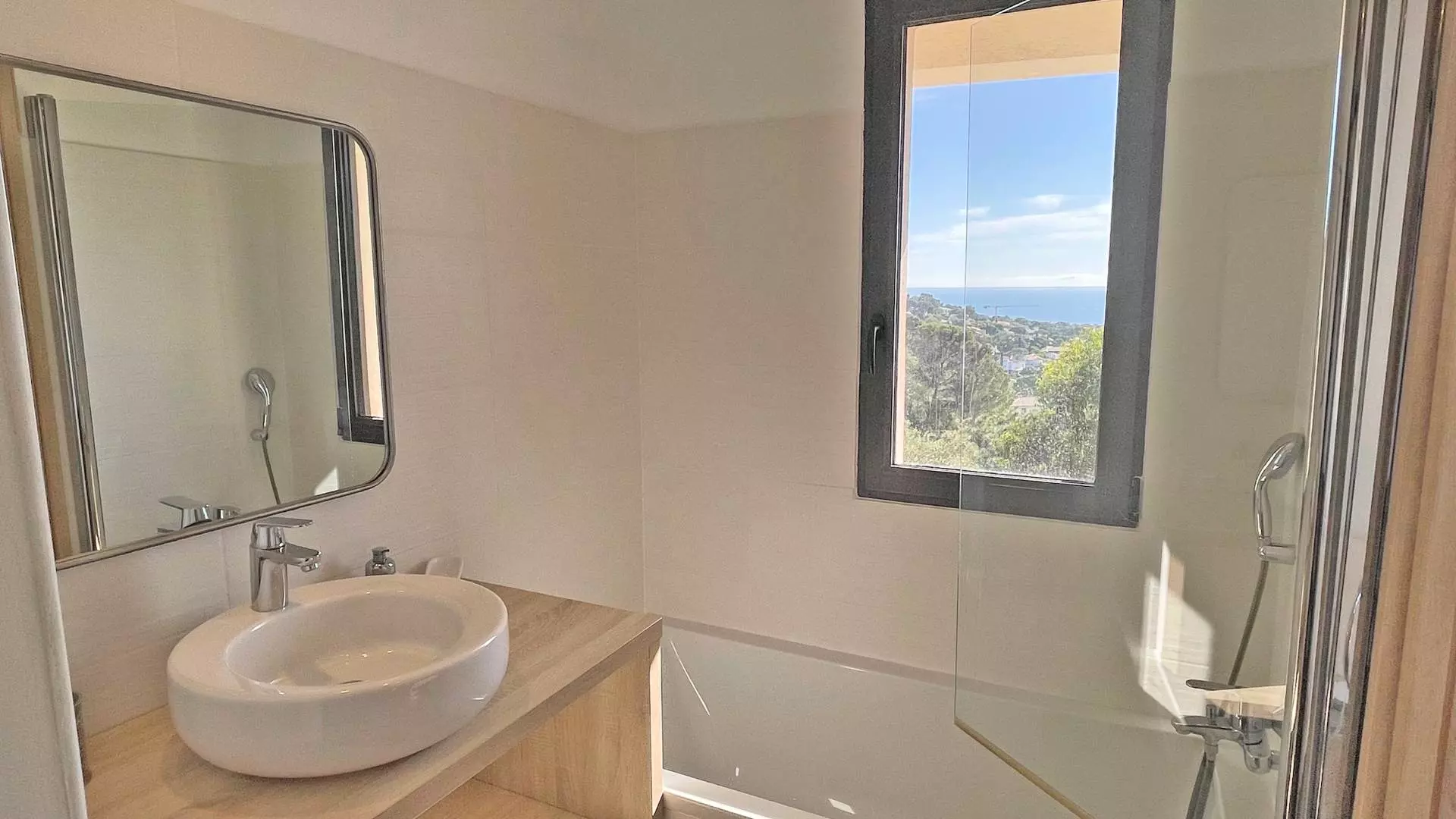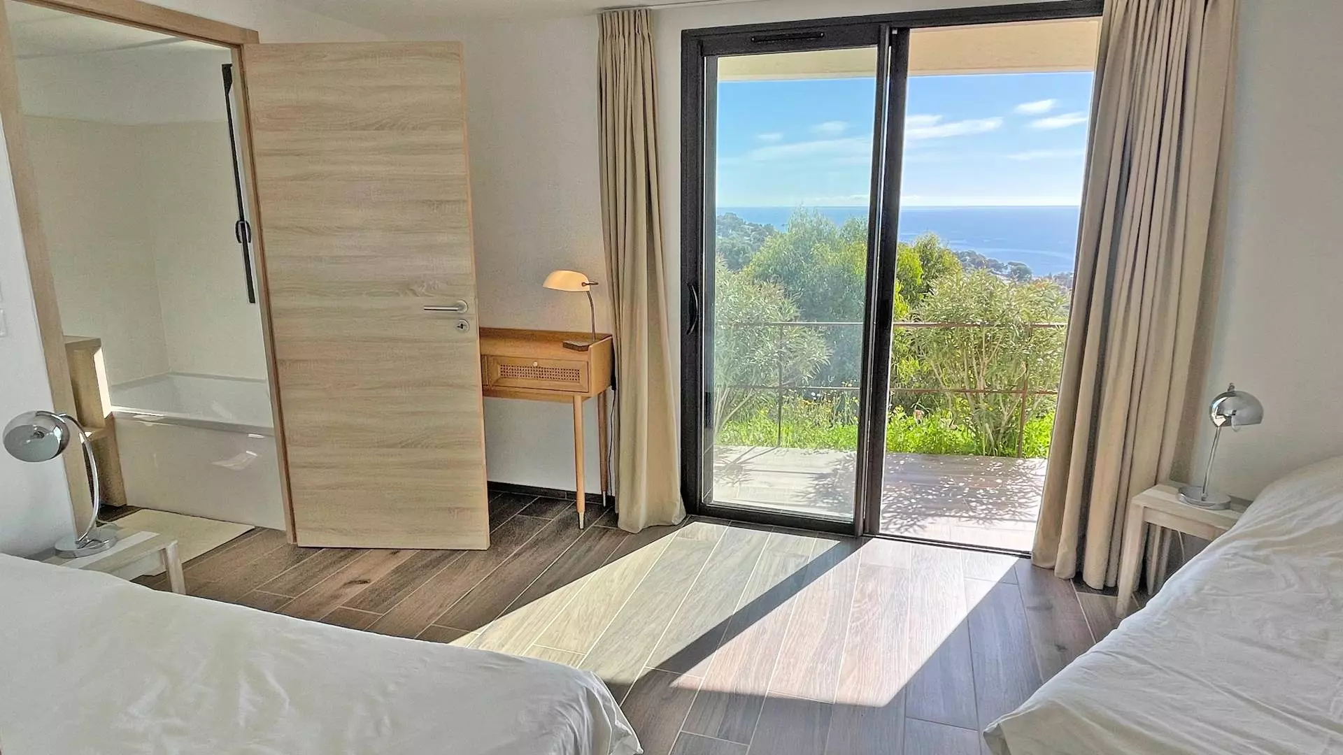 • Chambre 2 - Vue mer et accès terrasse et piscine - Climatisation : 2 lits simples 80cm et dressing, avec salle de bains équipée d'un meuble vasque et baignoire