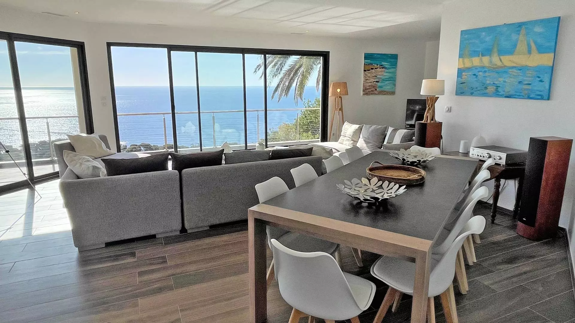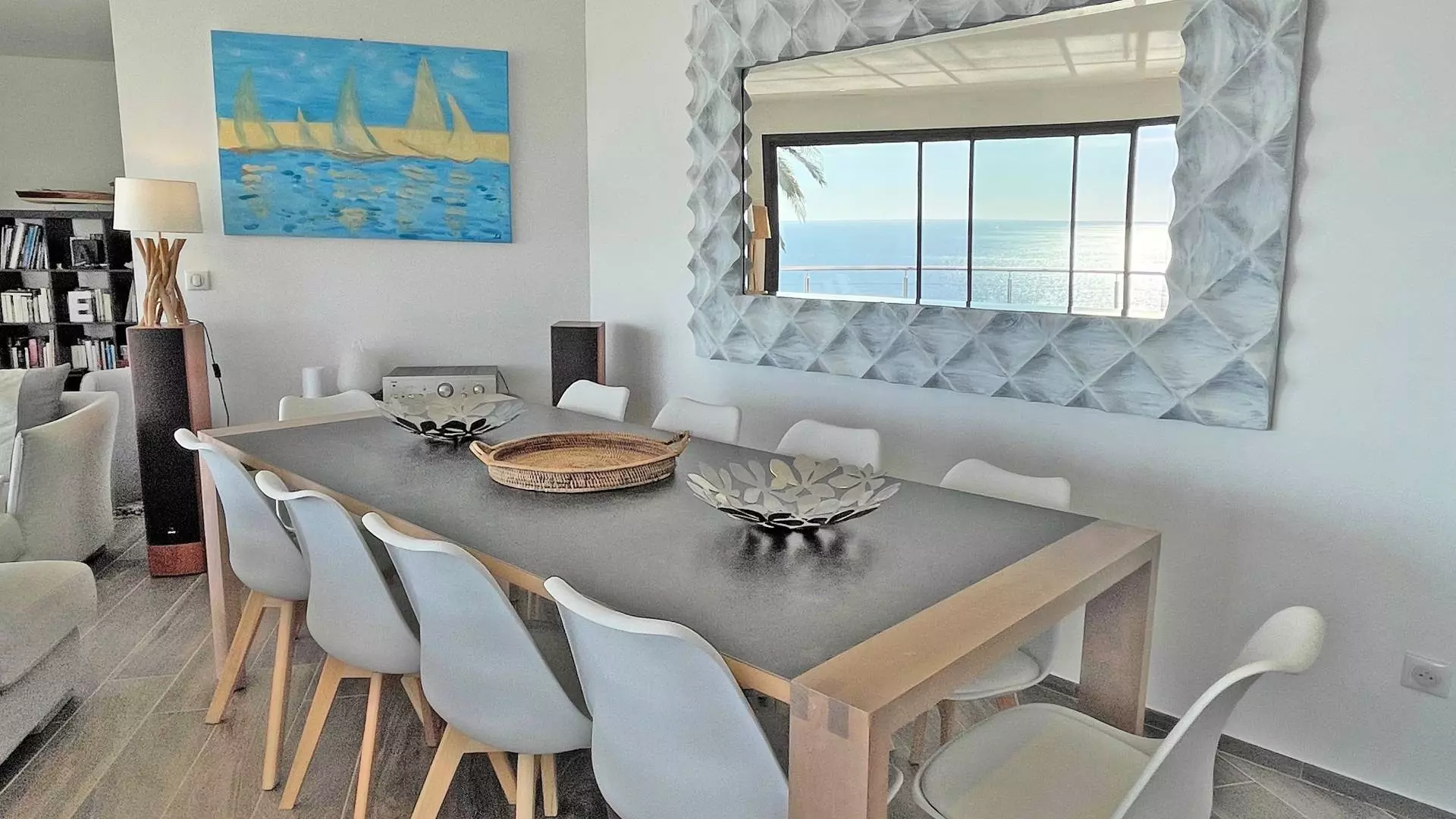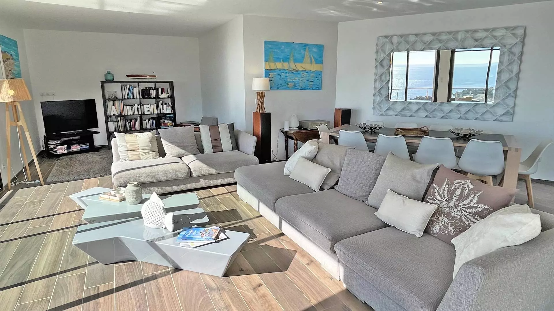 • Pièce à vivre, climatisée, très lumineuse avec vue mer, salon équipé d'une TV écran plat et de grands canapés, salle à manger avec accès piscine et terrasse couverte.