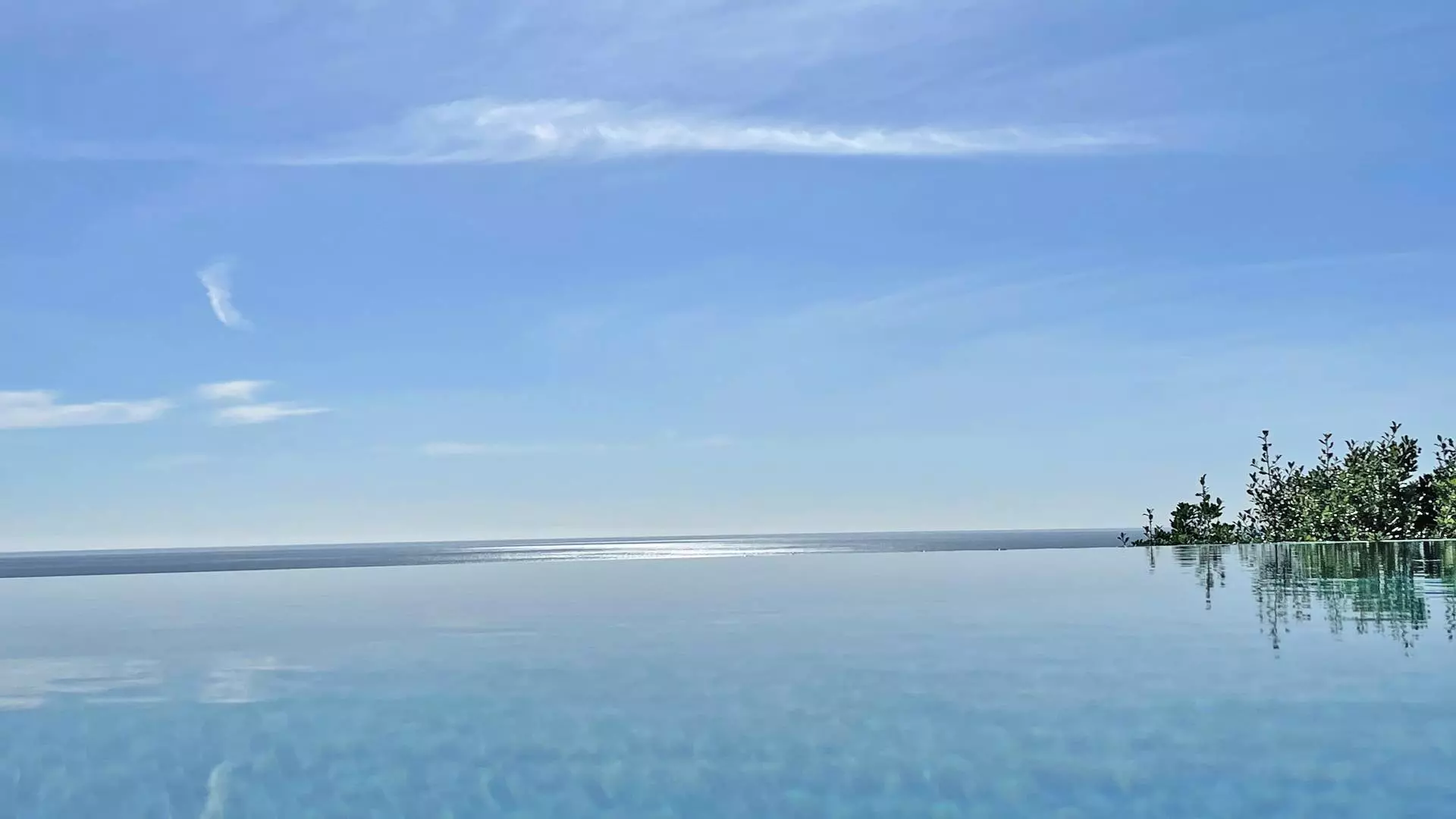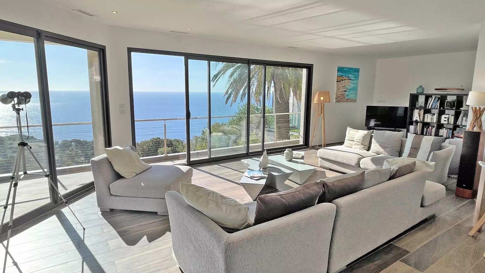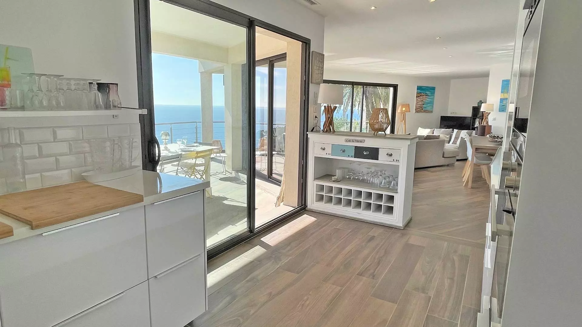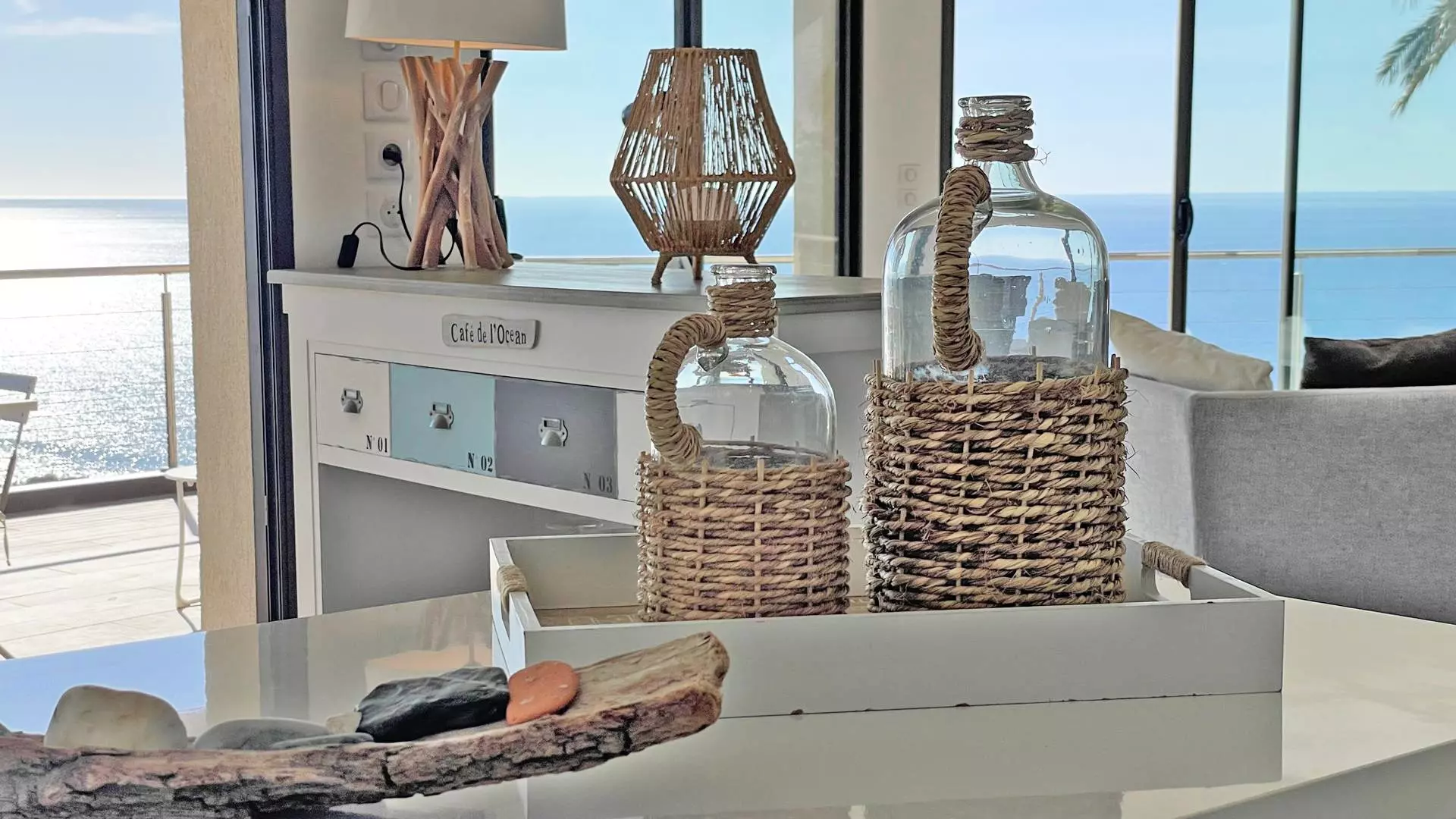 • Pièce à vivre, climatisée, très lumineuse avec vue mer, salon équipé d'une TV écran plat et de grands canapés, salle à manger avec accès piscine et terrasse couverte.