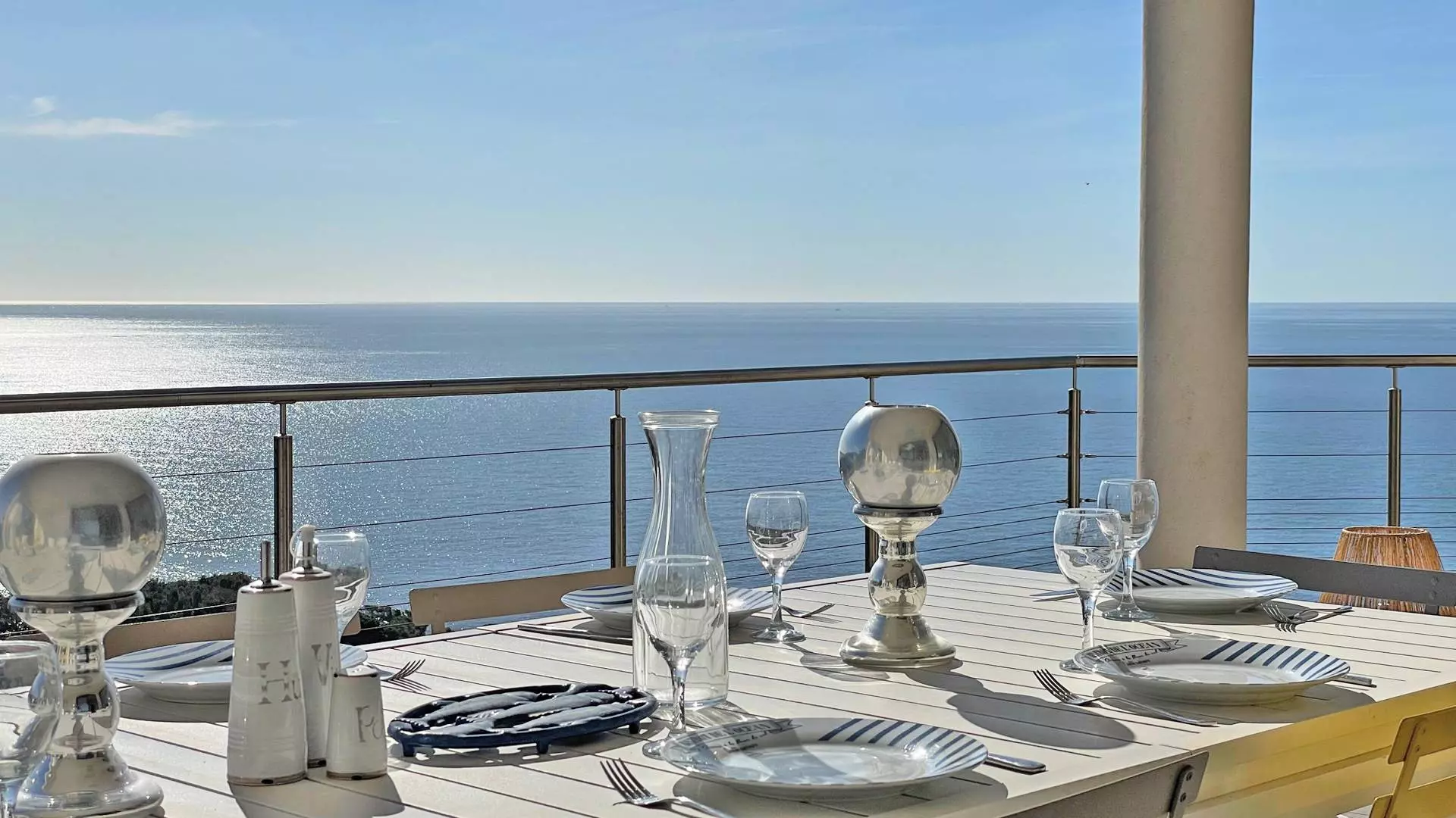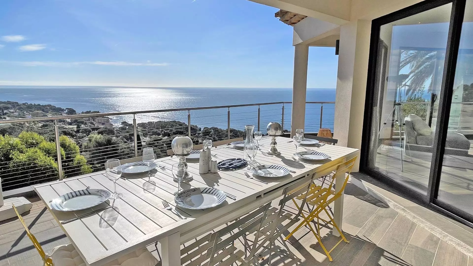 L'agencement intérieur de la villa offre de beaux espaces et un très bon confort. Une terrasse couverte à l'avant de la villa permet de prendre les repas à l'abri du soleil tout en profitant du cadre de vue exceptionnel.