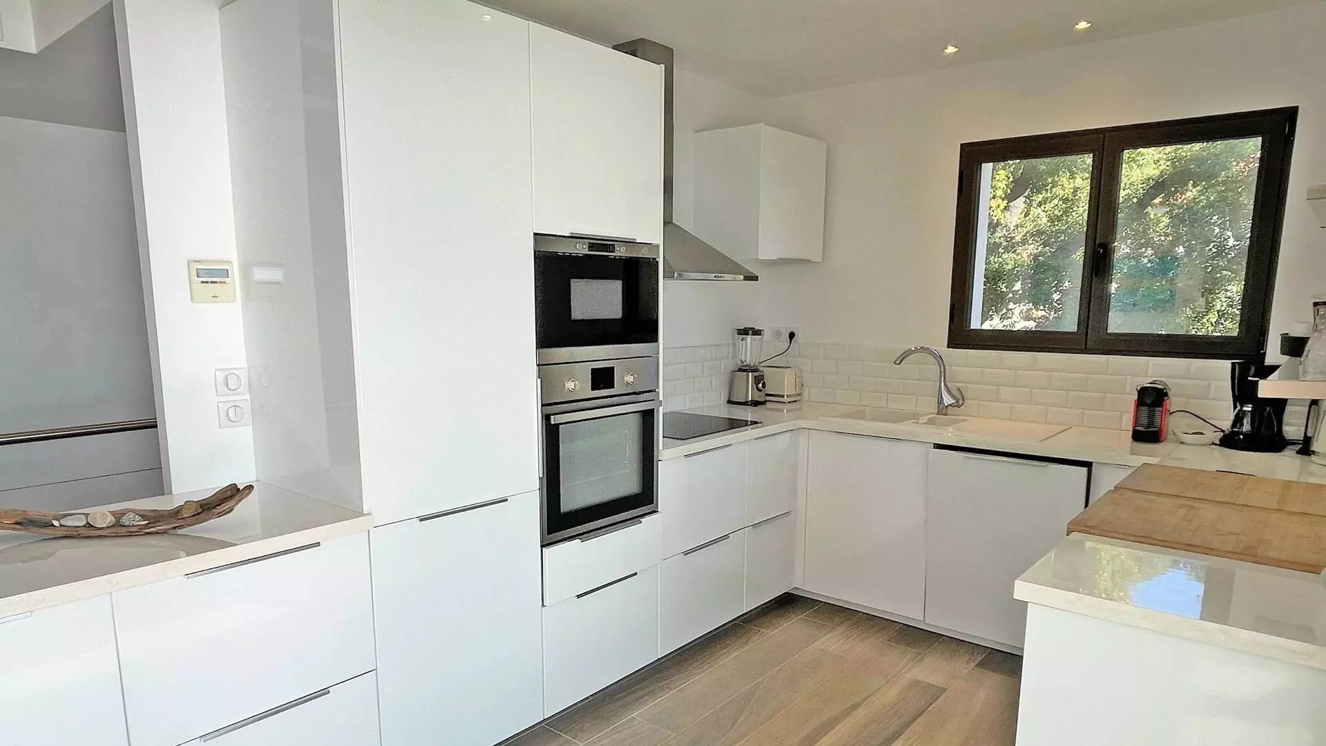 • Cuisine équipée ouverte avec lave-vaisselle, four, micro-ondes, plaque cuisson 4 feux induction, réfrigérateur américain, cafetière à filtre et Nespresso, grille-pain, bouilloire avec vaisselles et ustensiles divers.
