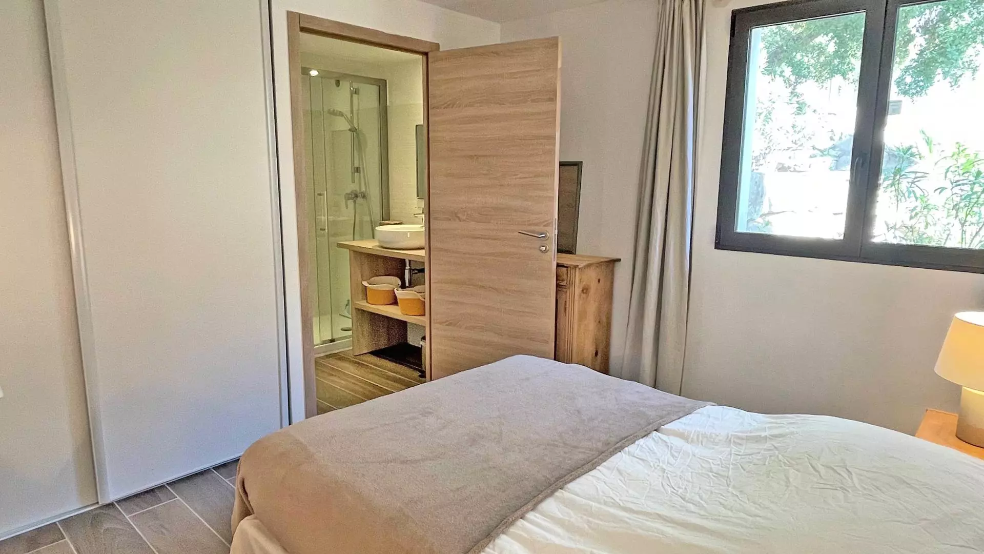 • Chambre 1 en suite - Vue jardin - Climatisation : Lit double 140cm et placard, avec salle d'eau attenante équipée d'un meuble vasque et douche