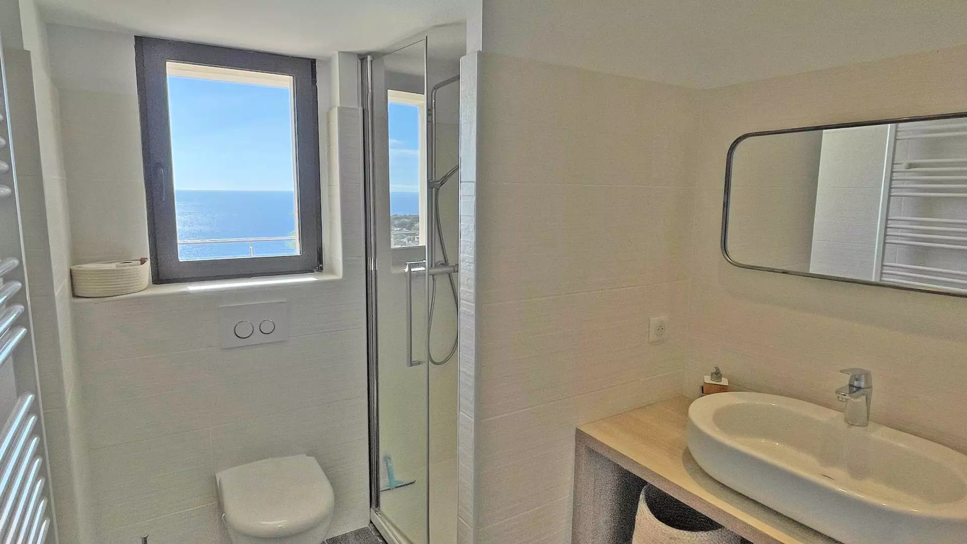 • Chambre 4 en suite - Vue mer et accès terrasse et piscine - Climatisation : Lit gigogne 2x80cm ou 160cm et rangements, avec salle d'eau attenante équipée d'un meuble vasque et douche