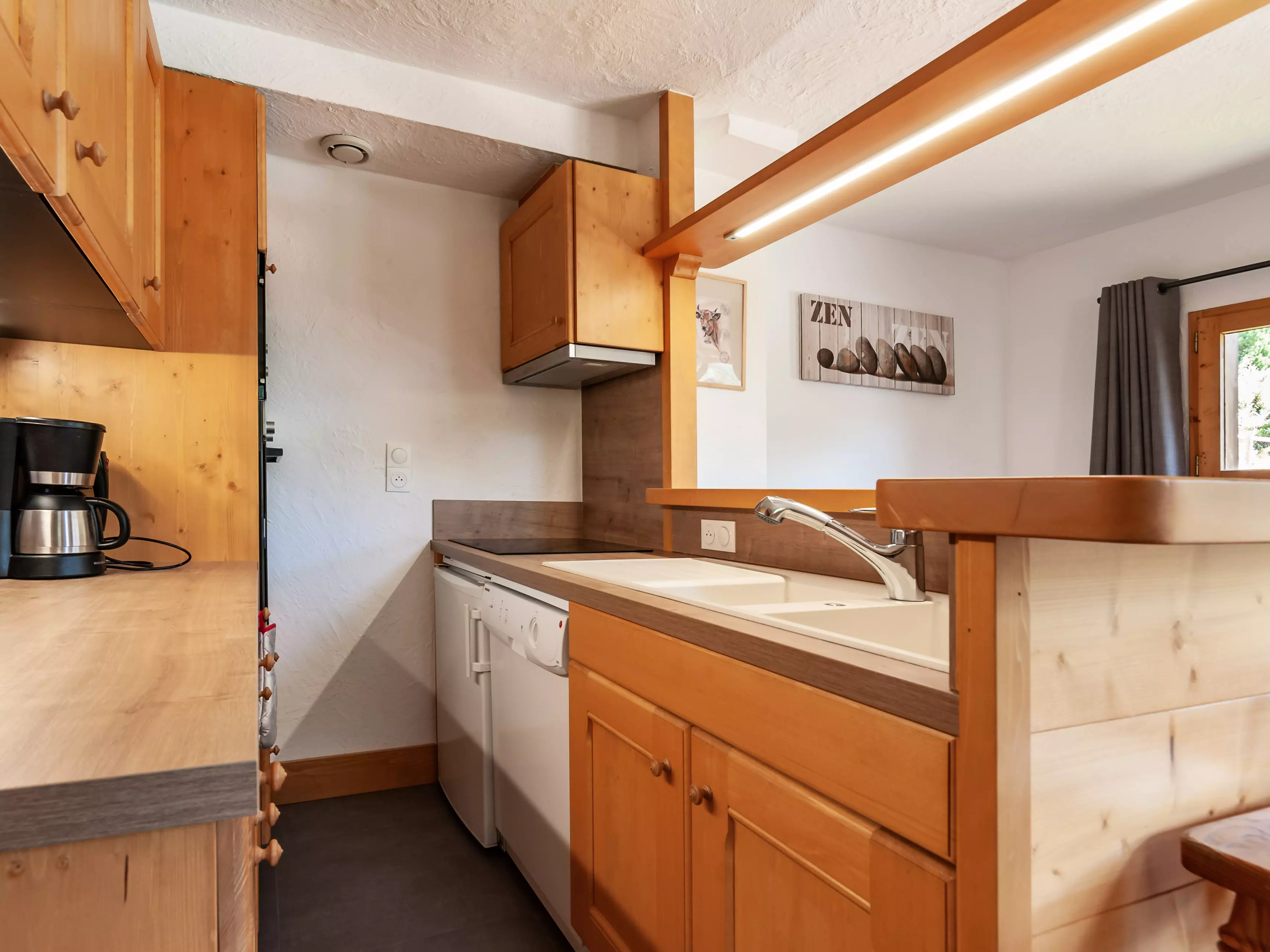 Cuisine équipée de plaques électriques, four, micro ondes, lave vaisselle, réfrigérateur, cafetière, bouilloire, grille-pain.