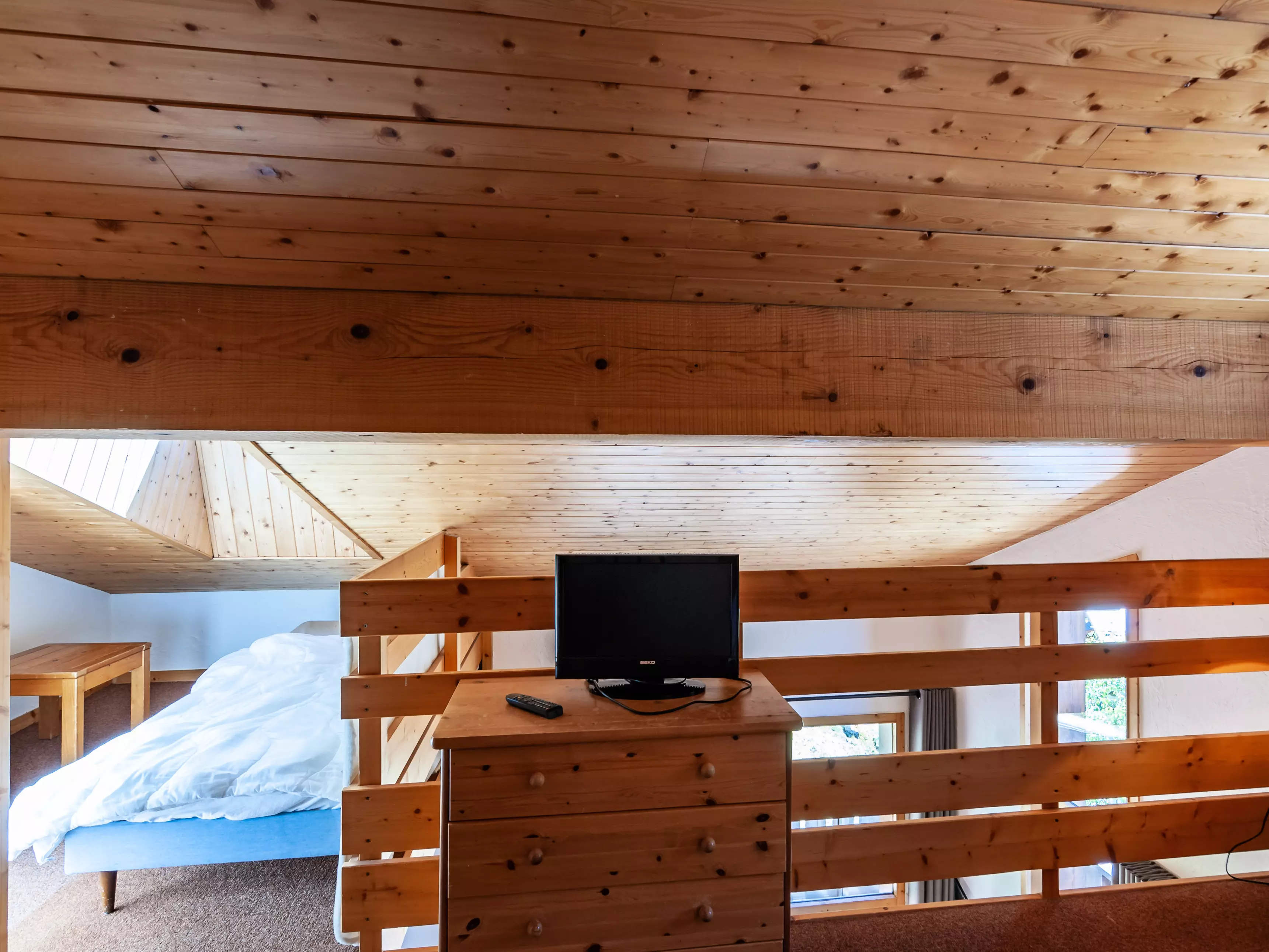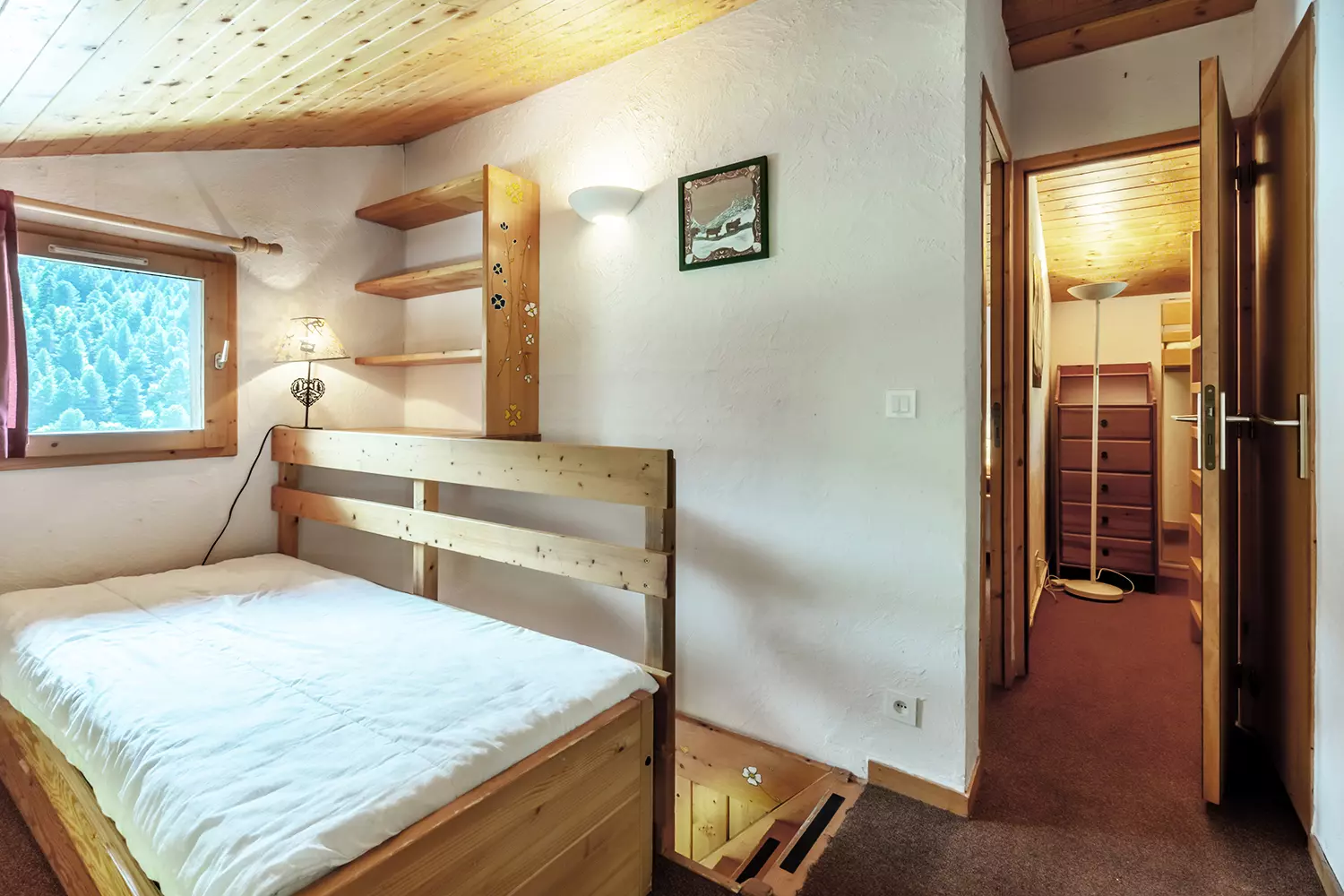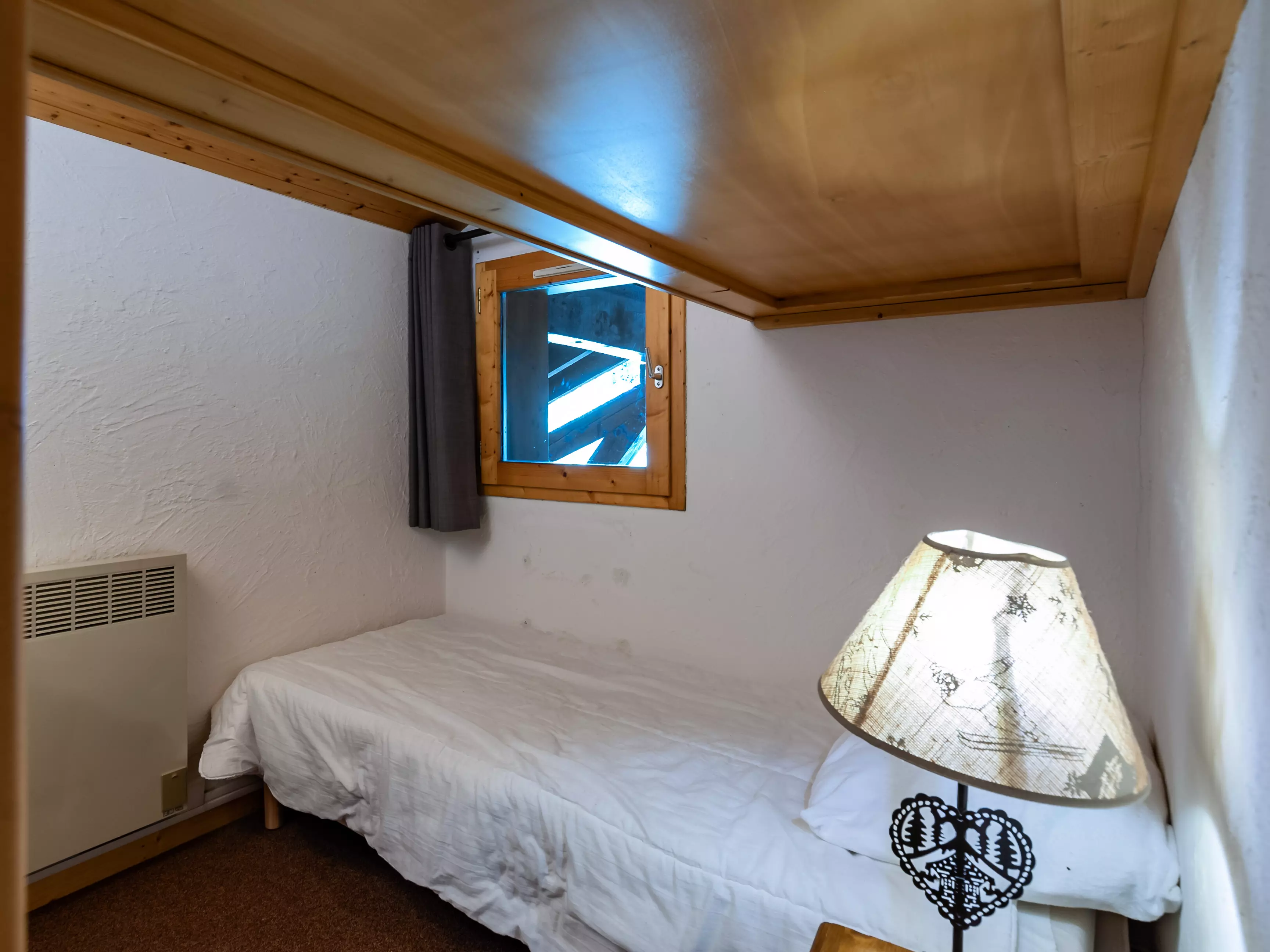 Mezzanine avec 1 lit simple et 1 lit tiroir (80x190). Chambre contenant un lit double (140x190) Chambre- cabine avec un lit simple et un lit mezzanine (80x190).
