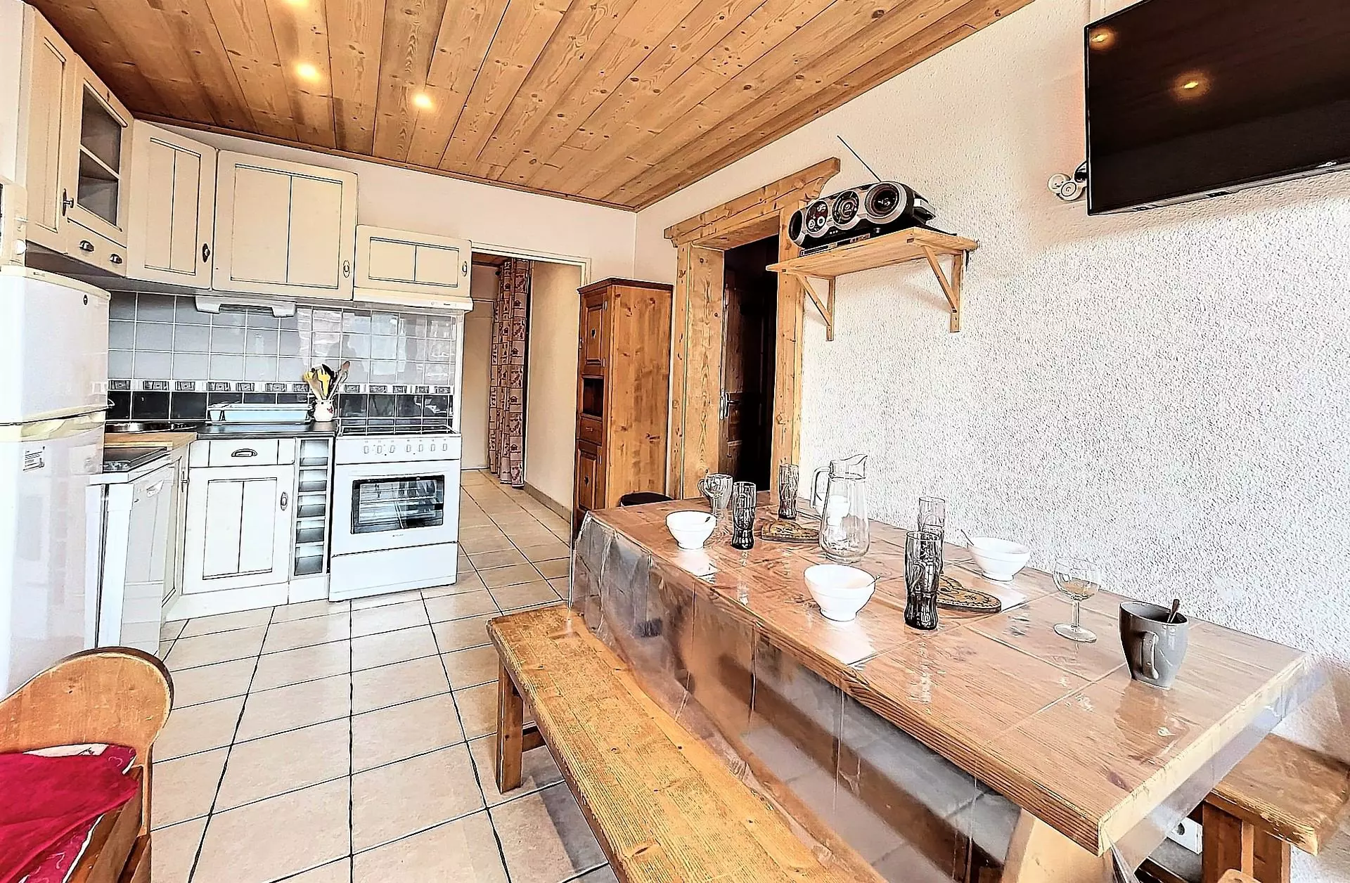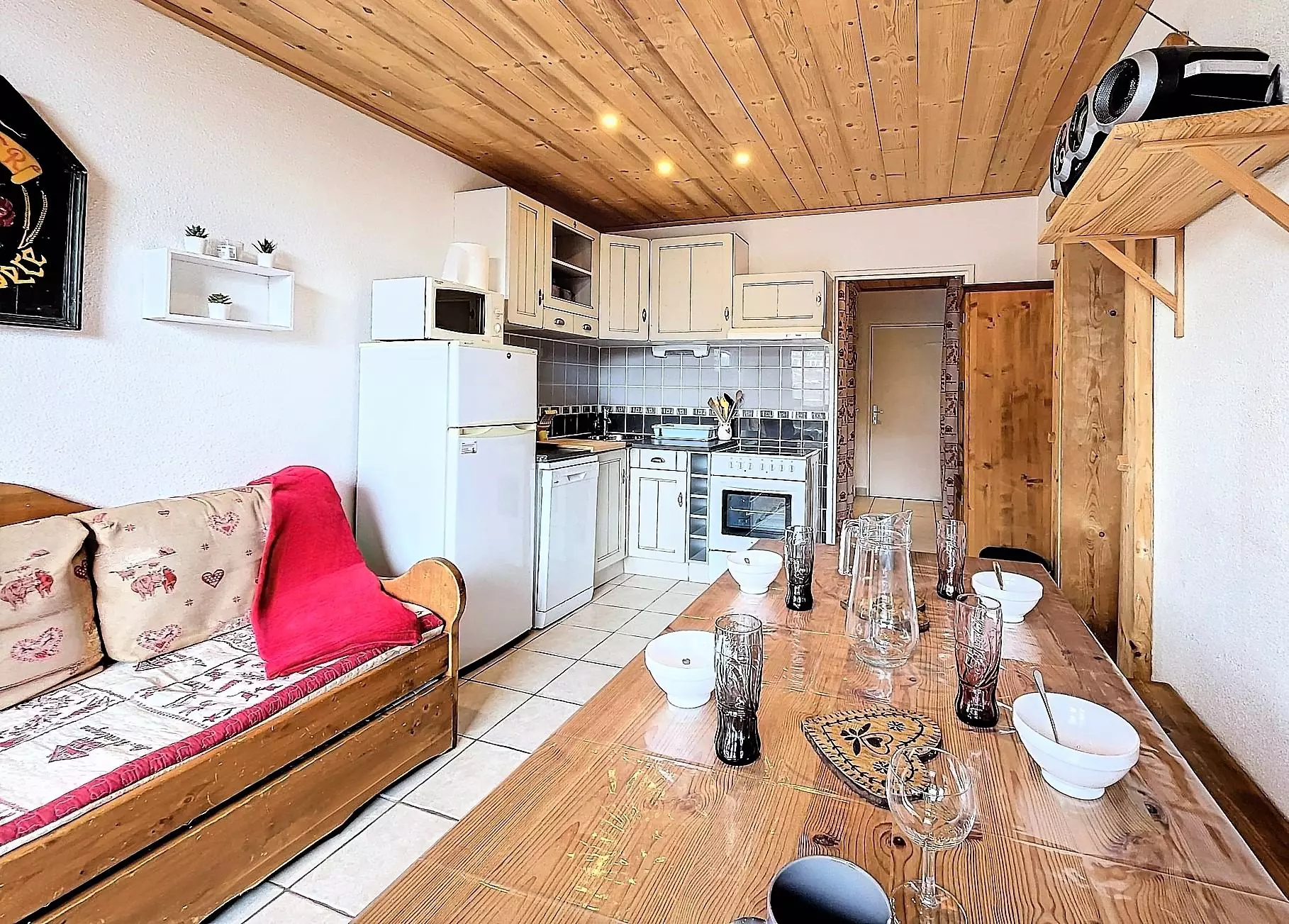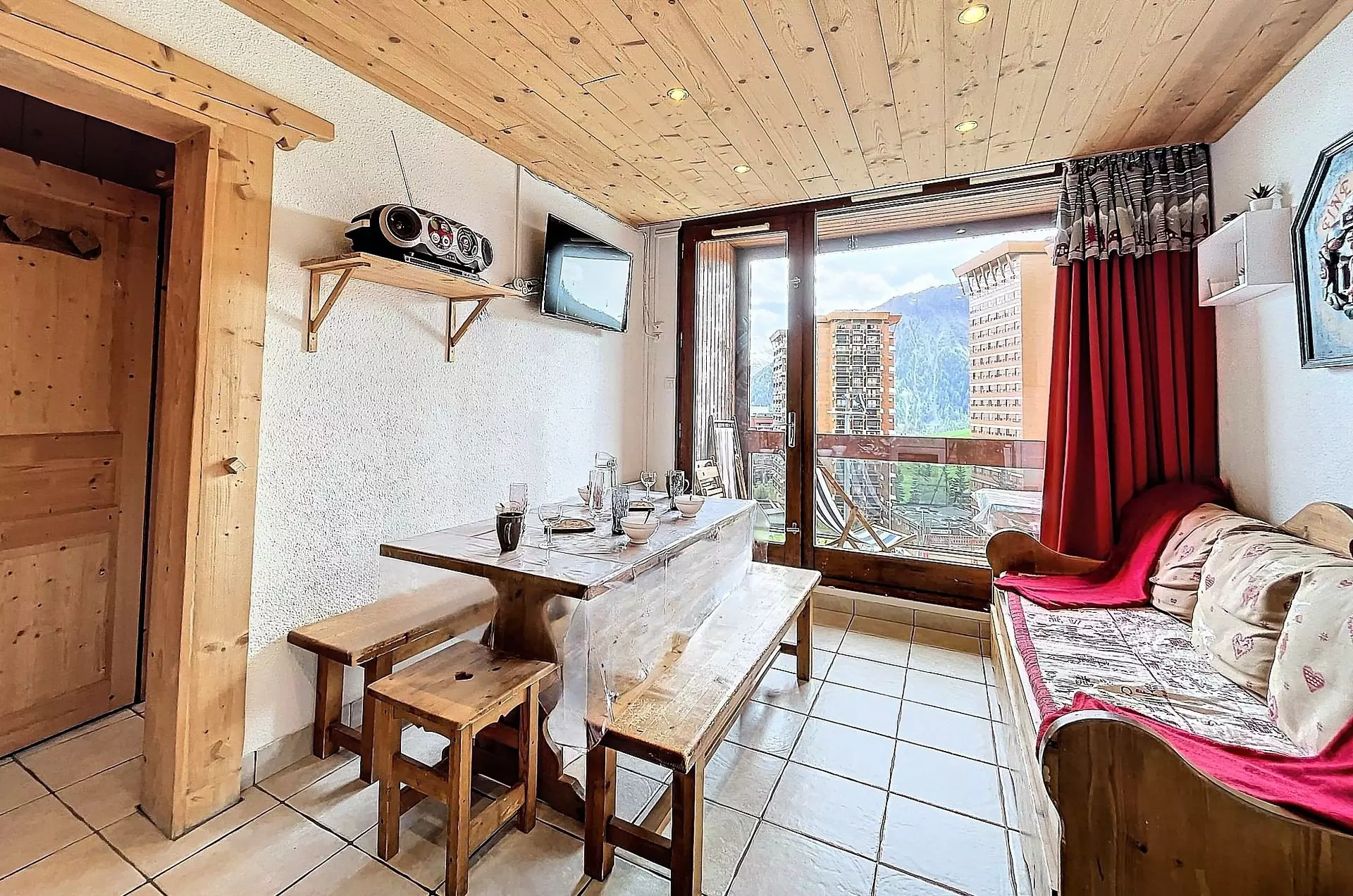 Le séjour est équipé d'un table pouvant accueillir 6 convives, d'un canapé lit gigogne en 160 pour 2 personnes et TV écran plat, ouvrant sur un balcon avec vue imprenable sur la piscine et les pistes.