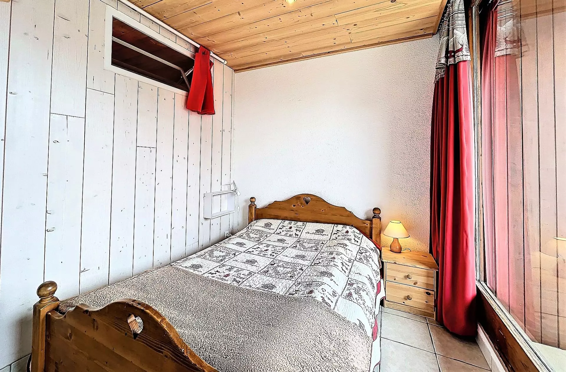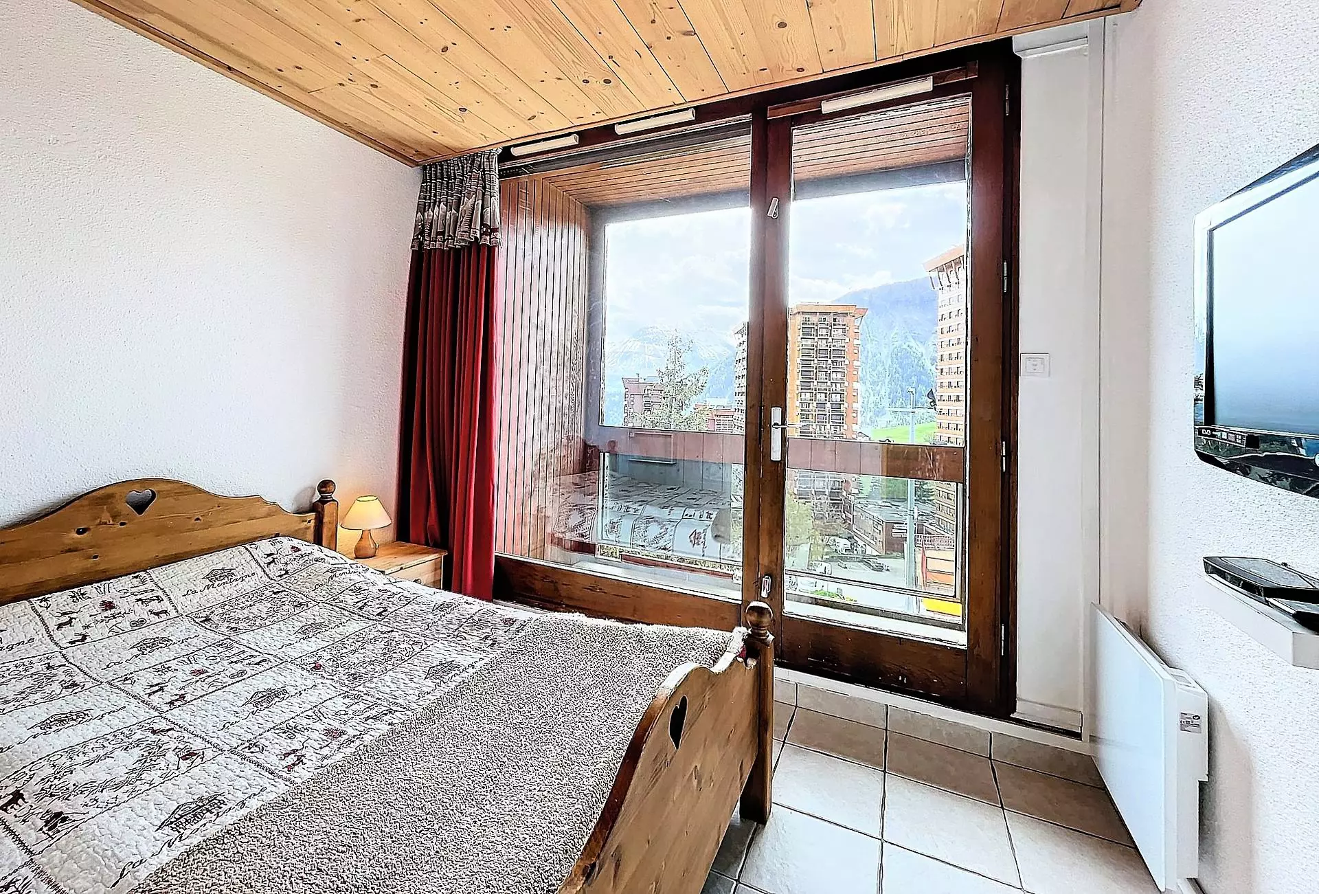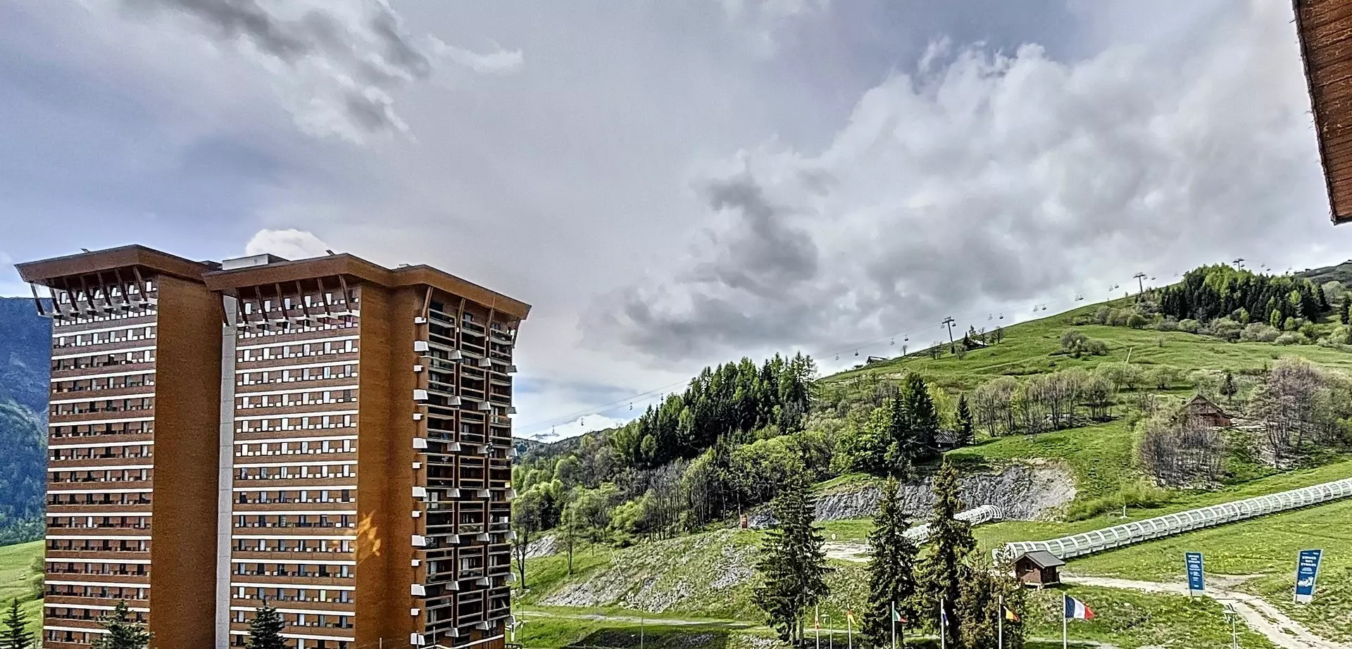 En plein centre de la station sur front de neige, appartement 2 pièces + alcôve de 44 m², pour 6 personnes, situé Résidence GALAXIE, au 2e étage côté piscine.