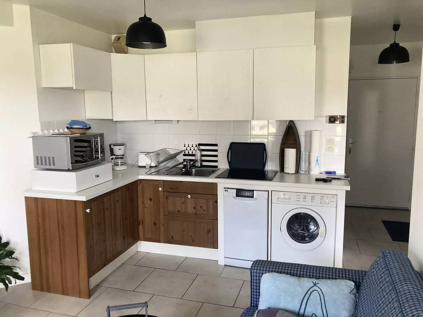 -Une cuisine équipée avec lave-linge, lave-vaisselle, four micro-ondes, plaques induction, grille-pain, cafetière, bouilloire;