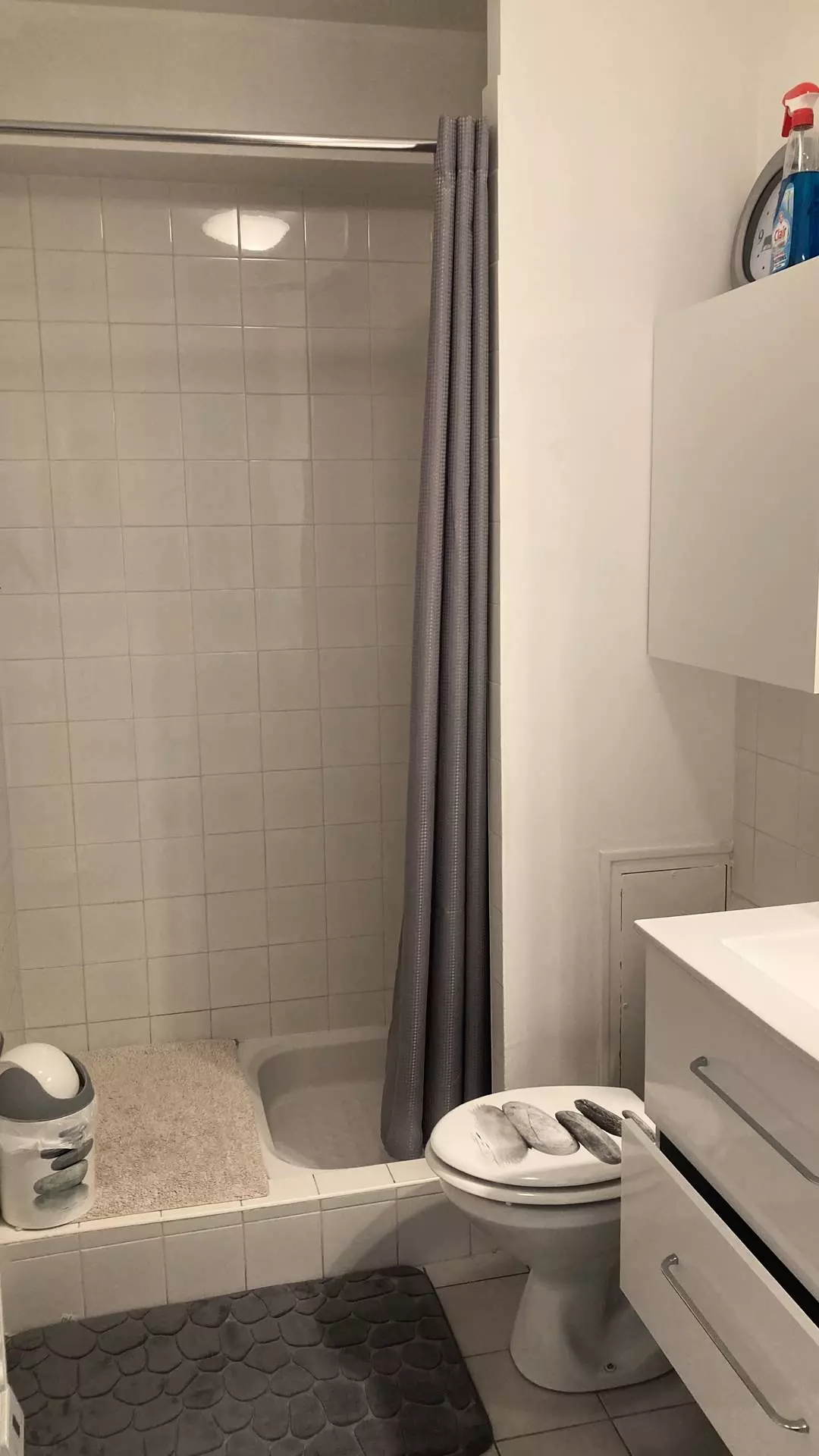 -Une salle d'eau avec douche, vasque, sèche-serviette, WC;