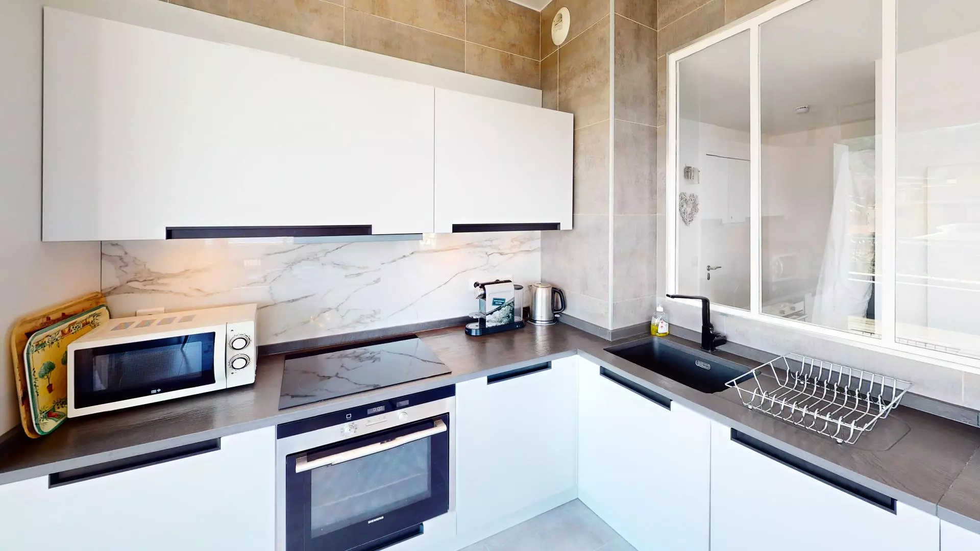 Coin cuisine équipé de four, microondes, lave-vaiselle et lave-linge.