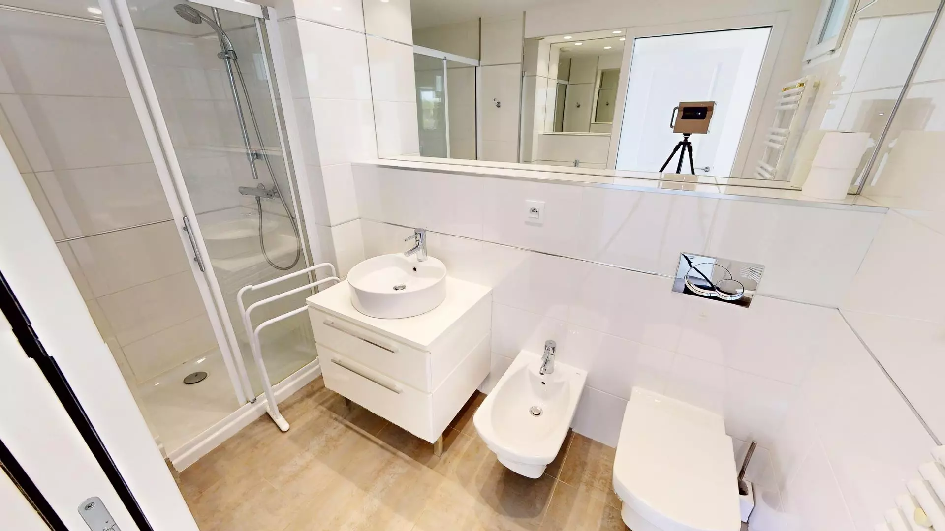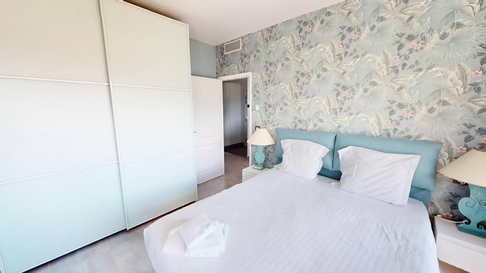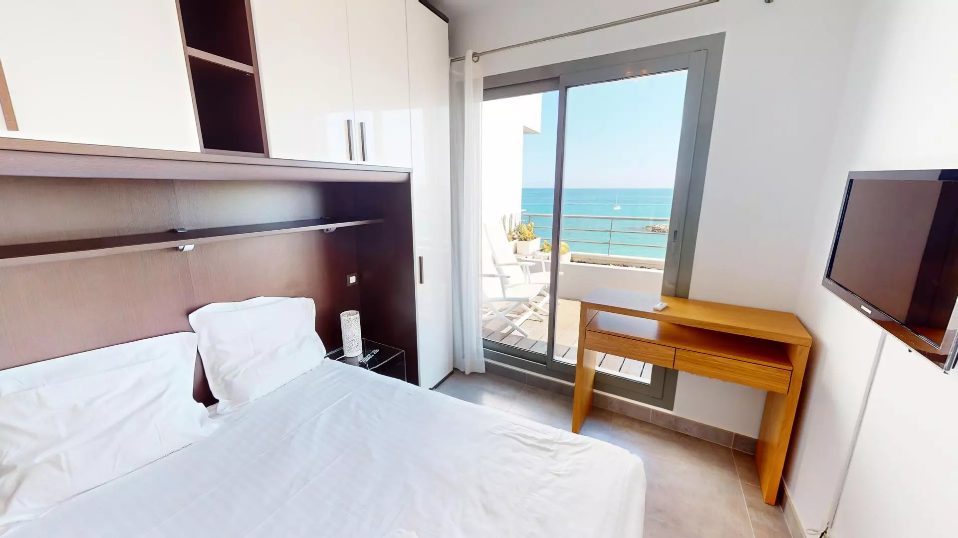 Chambre avec lit 160x200cm, nombreux rangements, TV écran plat au mur et accès direct à la salle d'eau avec WC et bidet.