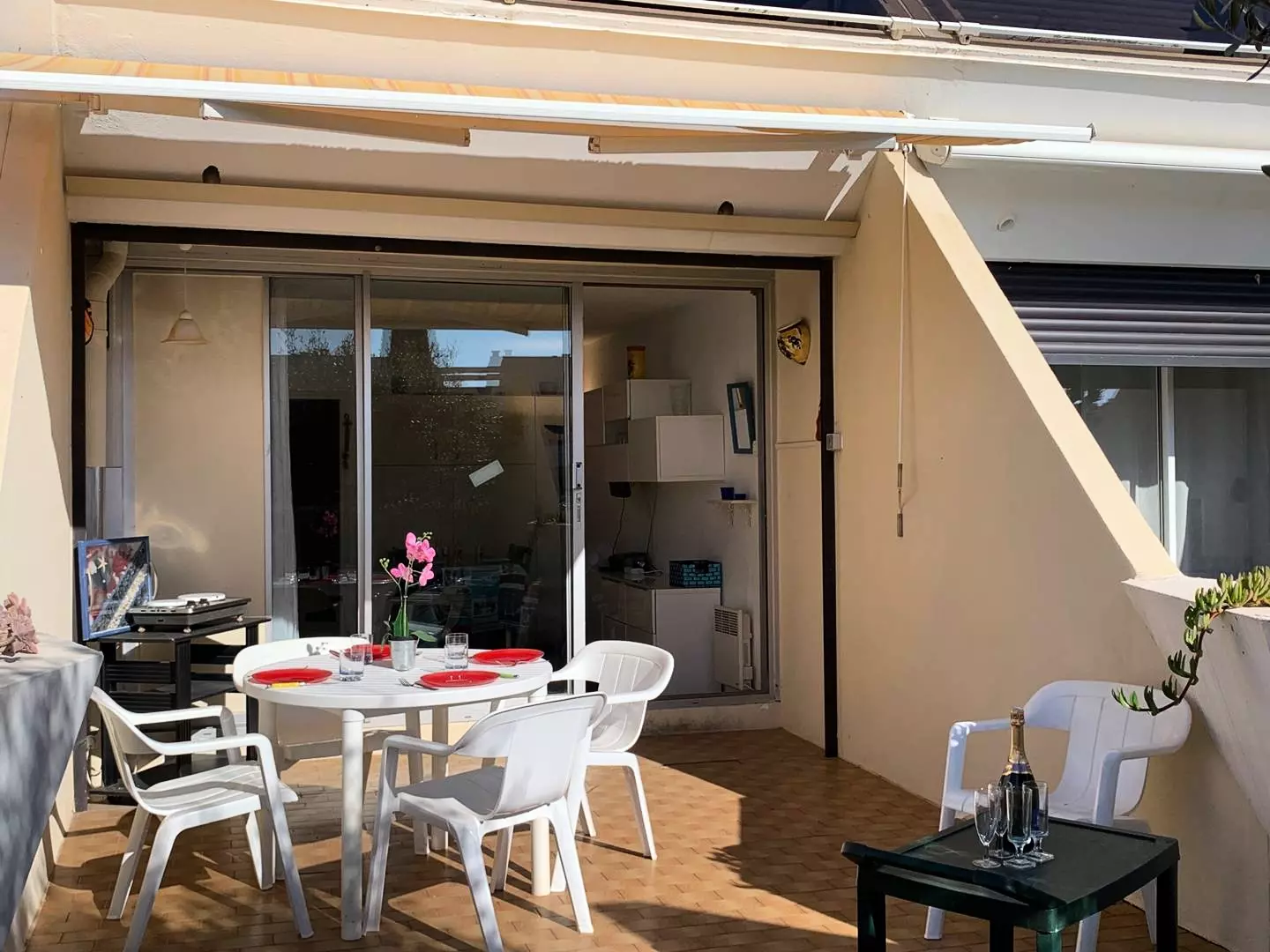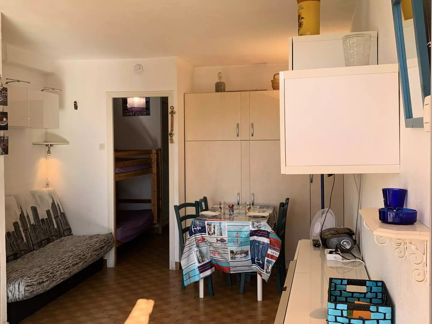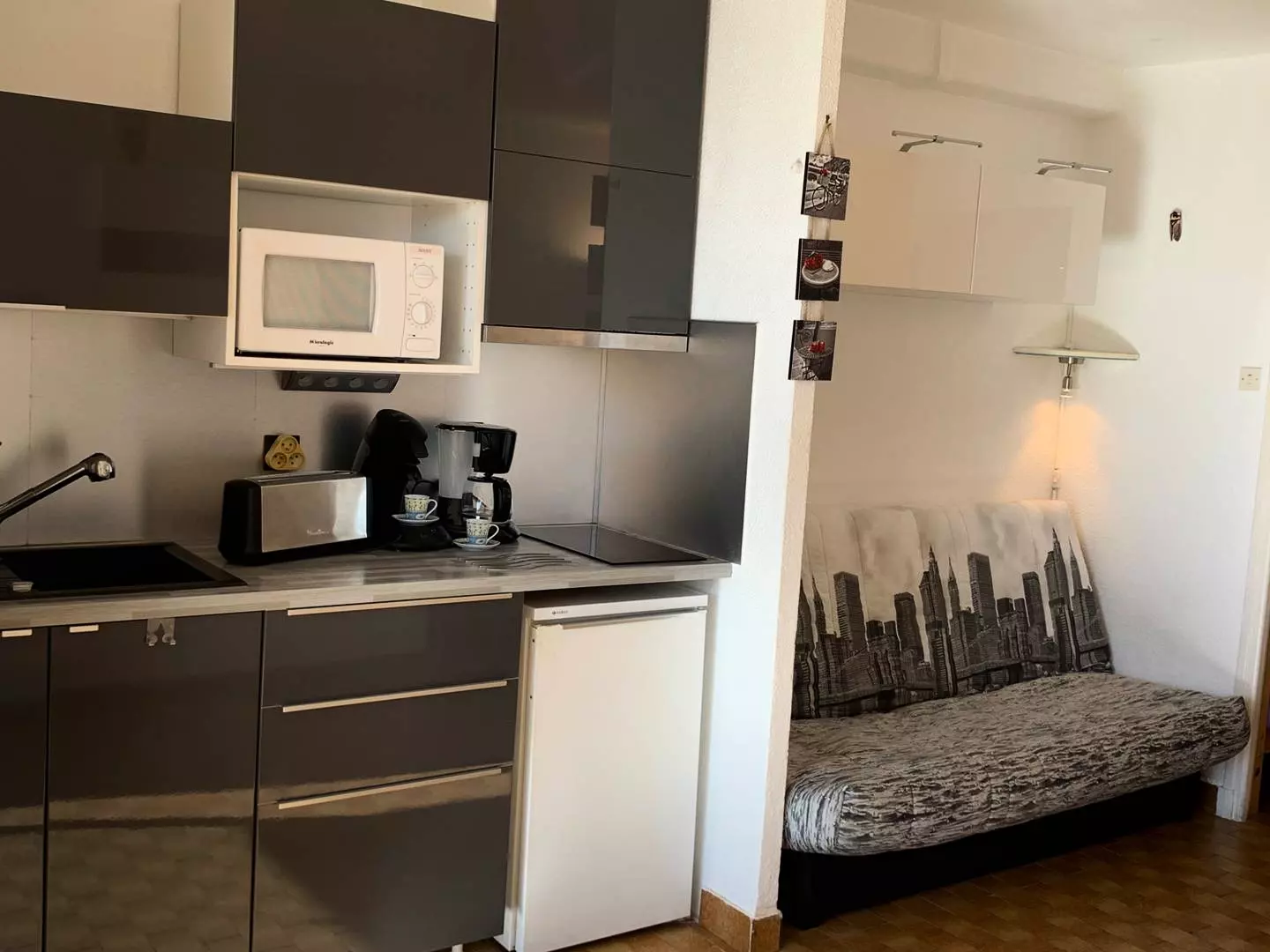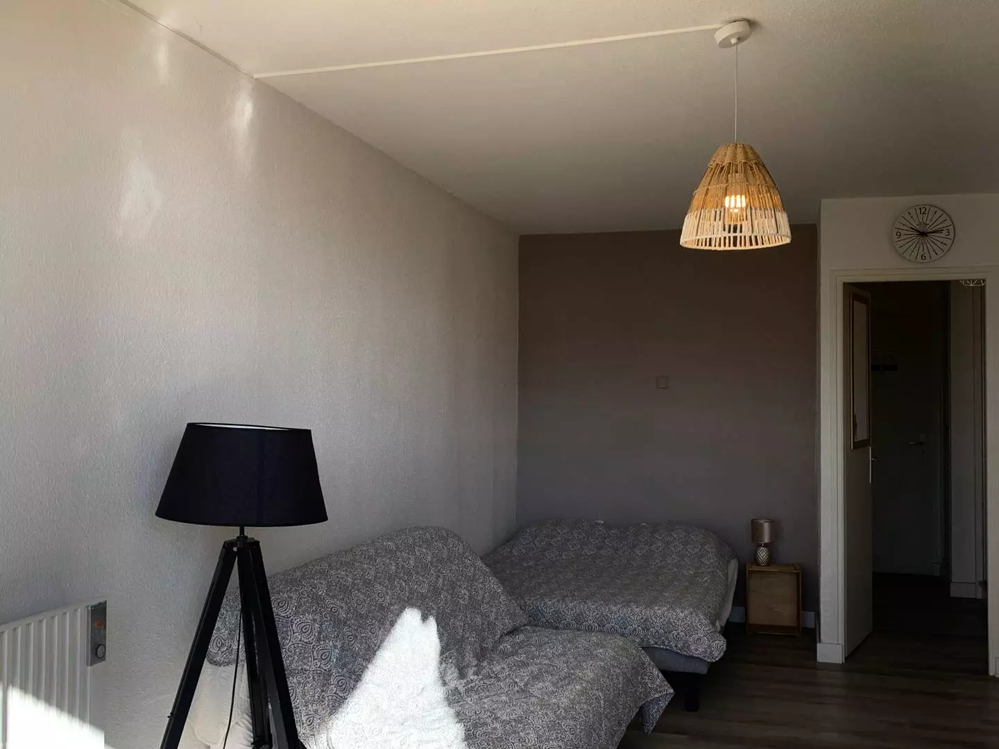 Grand studio joliment aménagé. Orienté sud, grand séjour ouvert sur une terrasse bien ensoleillée. Dans l'entrée, il y a un grand placard. Dans le séjour, un lit en 160 et un canapé.