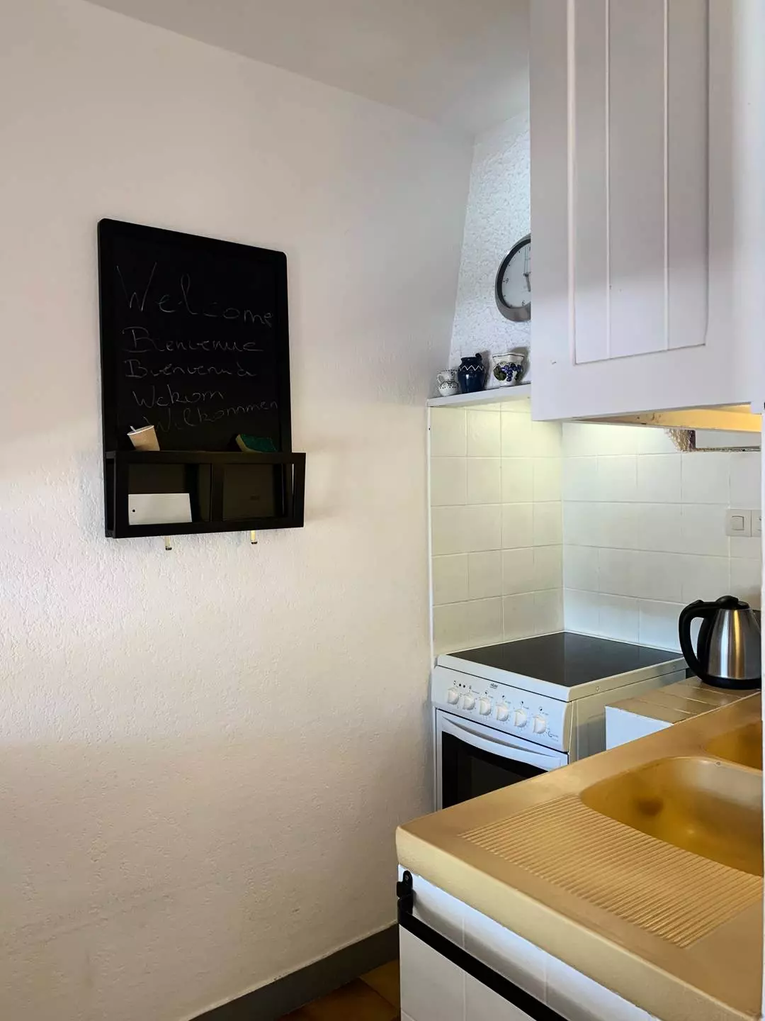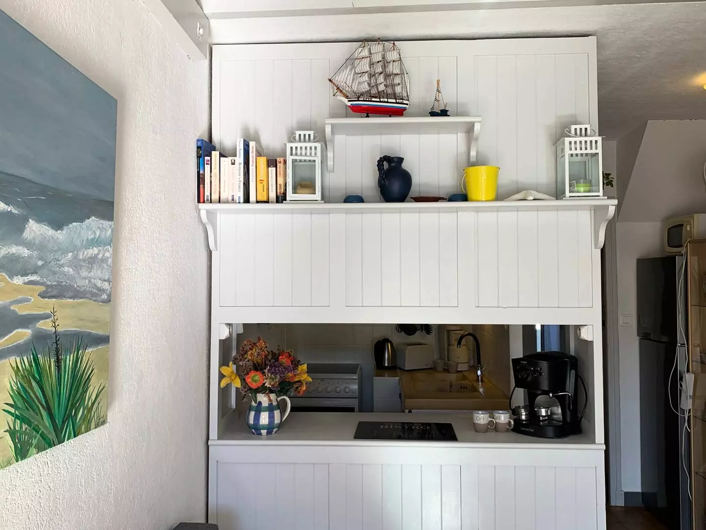Dans le passage vers le séjour se trouve la kitchenette et la salle d'eau ainsi que les WC séparés.