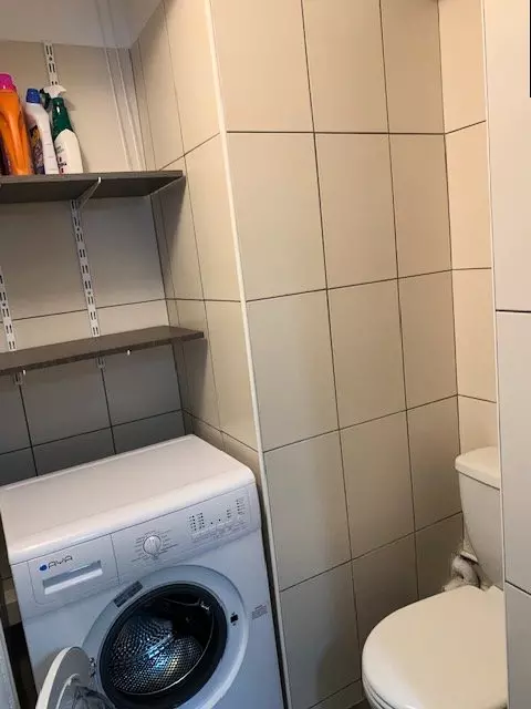 Dans le couloir vers le séjour, il y a l'escalier (qui monte à la chambre à l'étage) et la salle d'eau avec baignoire, machine à laver et toilettes.