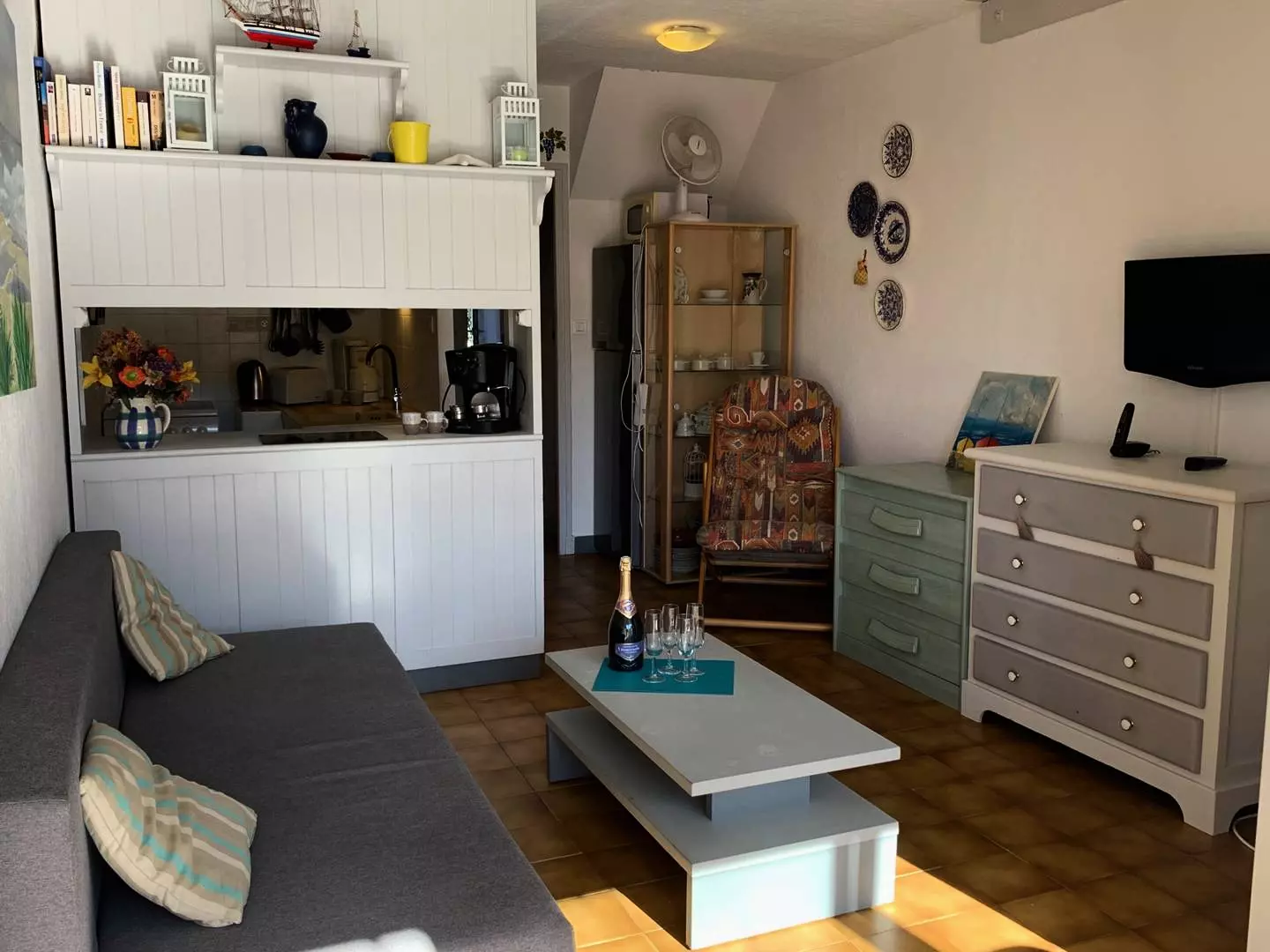 Le séjour est meublé en salon avec canapé et TV (sur chaînes Françaises). La mezzanine est ouverte sur le séjour et meublée d'un lit en 140 (TV branchée sur chaînes étrangères).