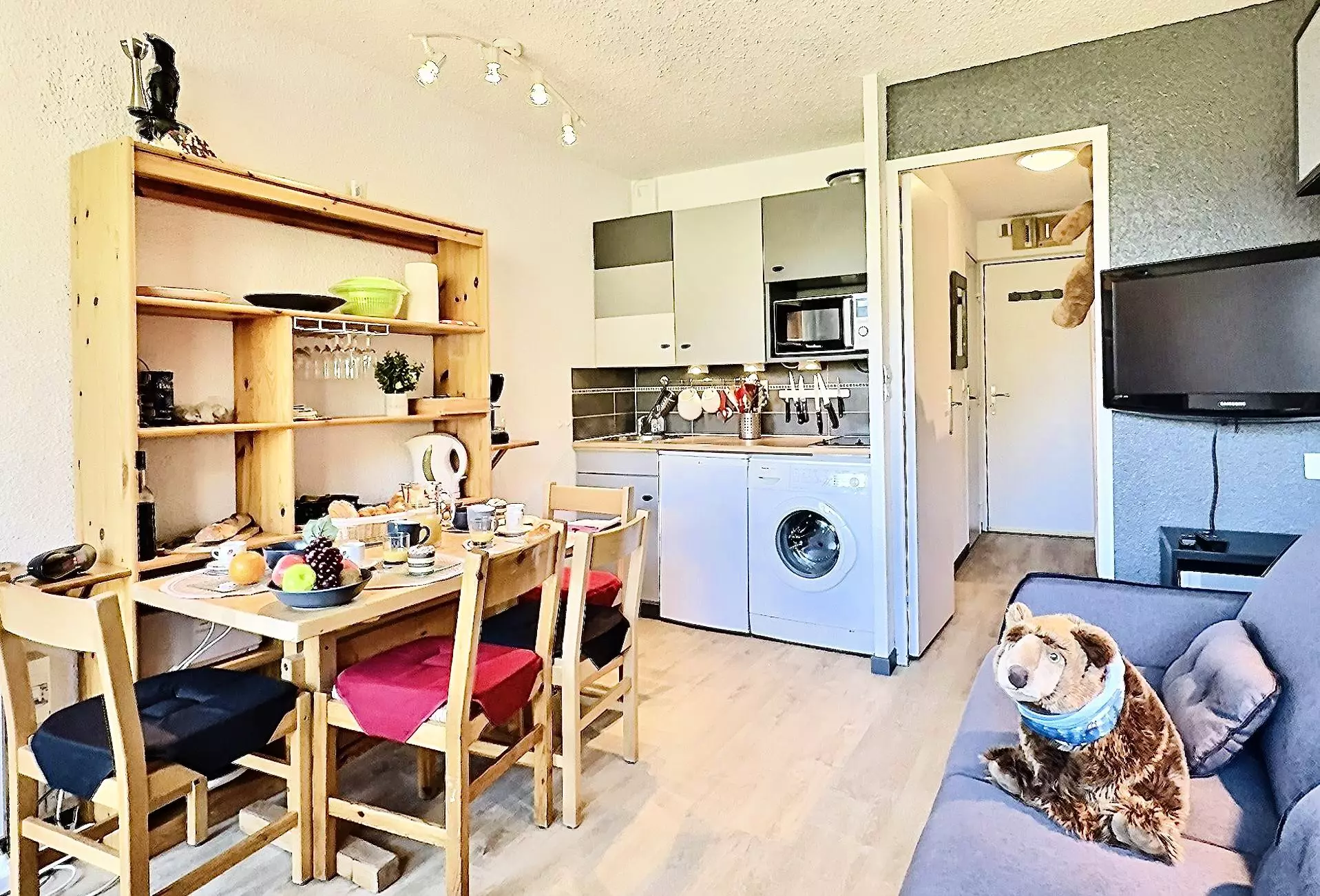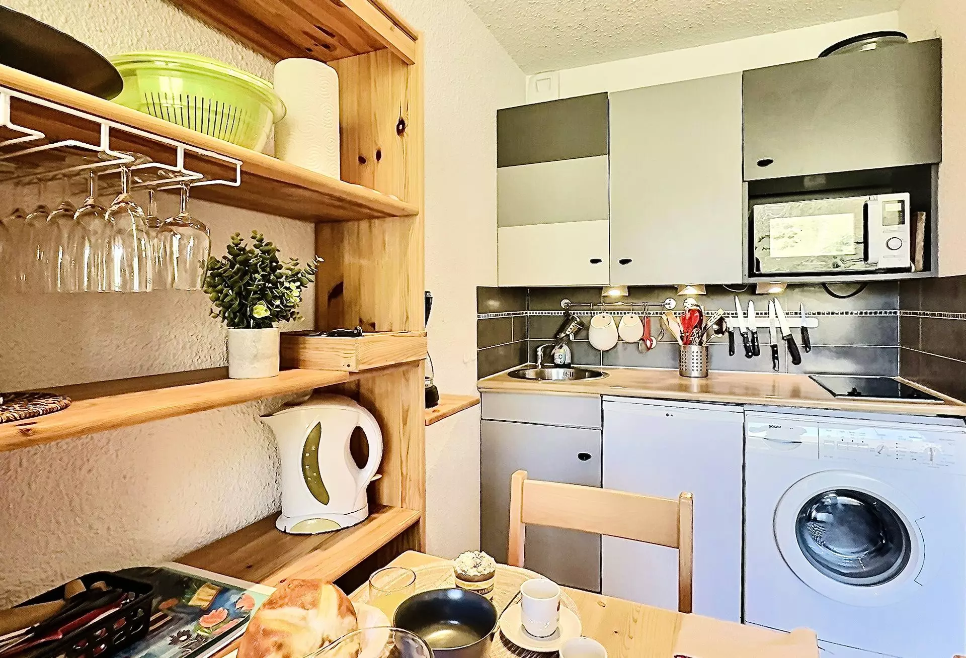 Il est équipé avec des plaques à induction, un four, un lave vaisselle et un réfrigérateur.