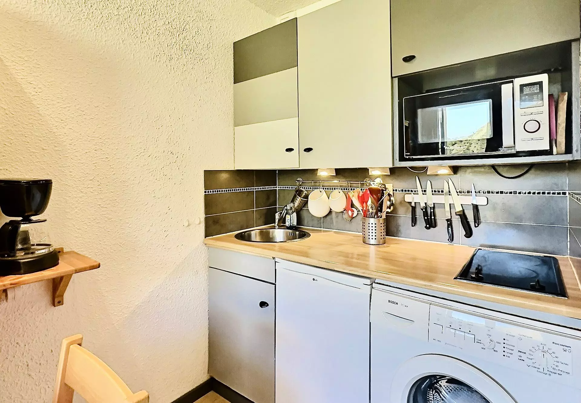 Elle est équipée de plaques à induction, d'un micro-ondes et d'un réfrigérateur.
