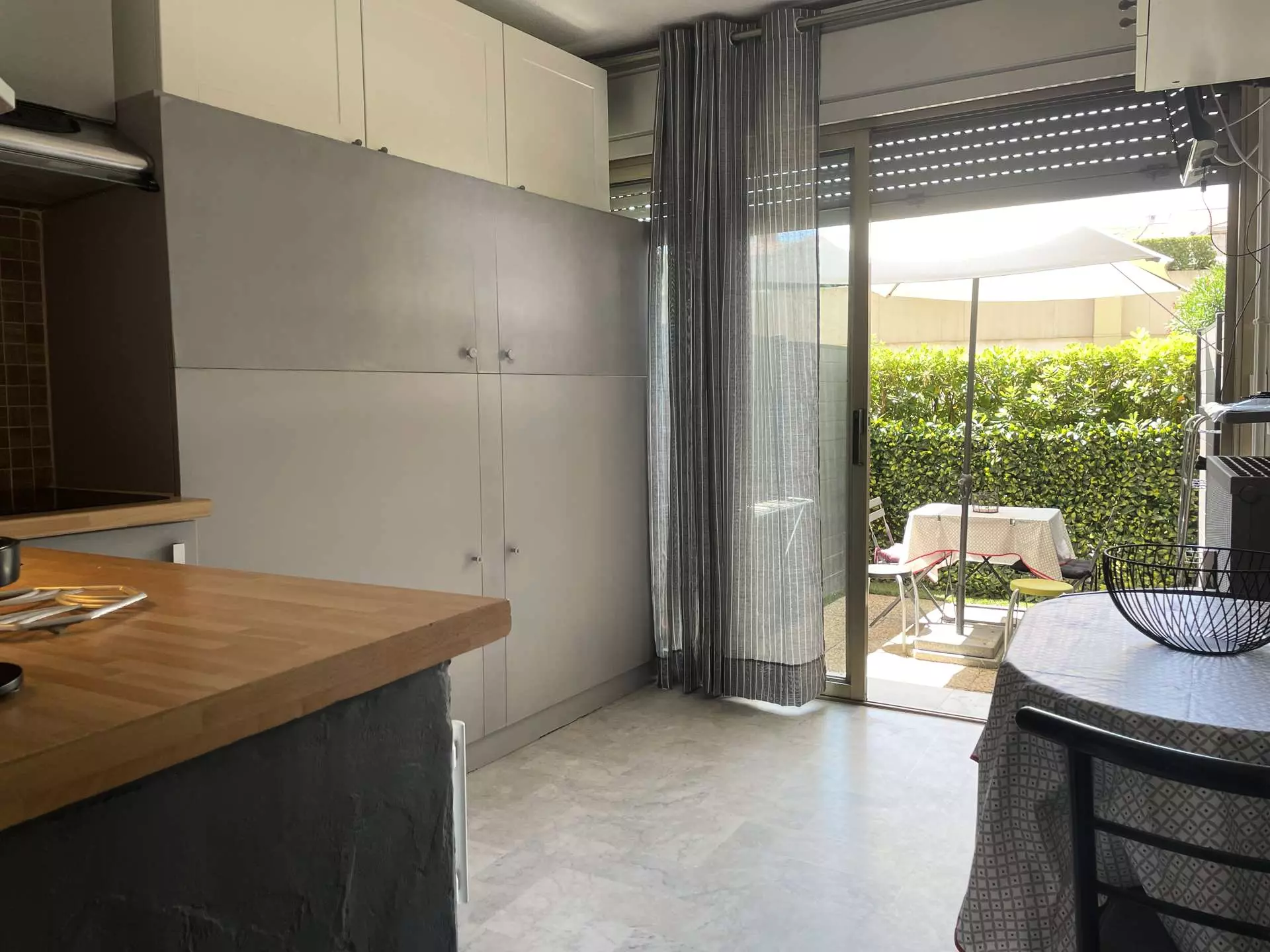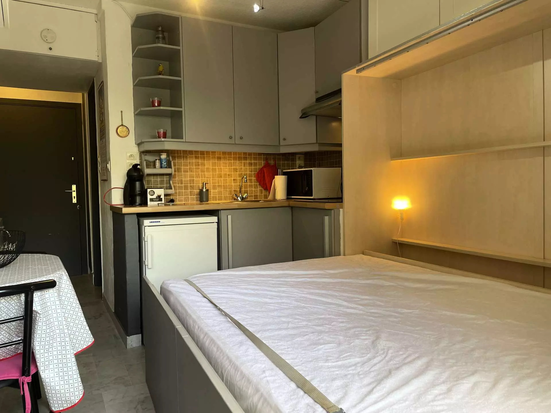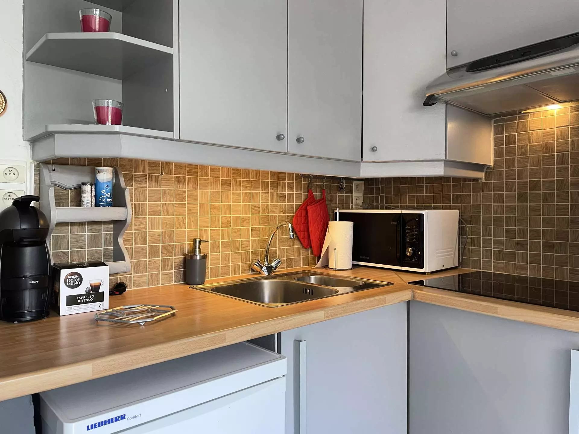 Votre appartement de vacances en rez de jardin comprend une entrée, une salle de douche avec wc, un séjour avec kitchenette équipée, un lit escamotable ouvert sur une terrasse avec mobilier.