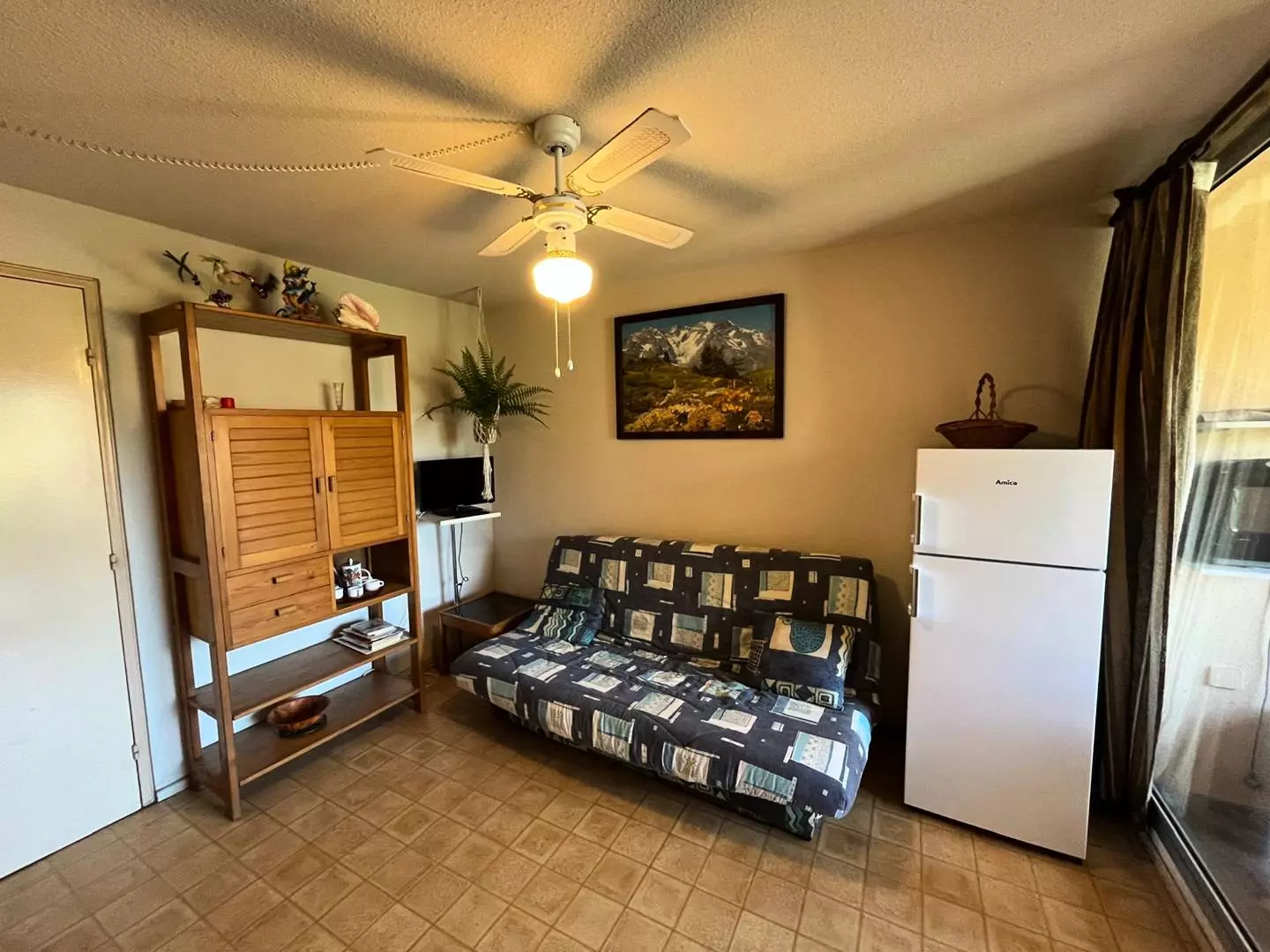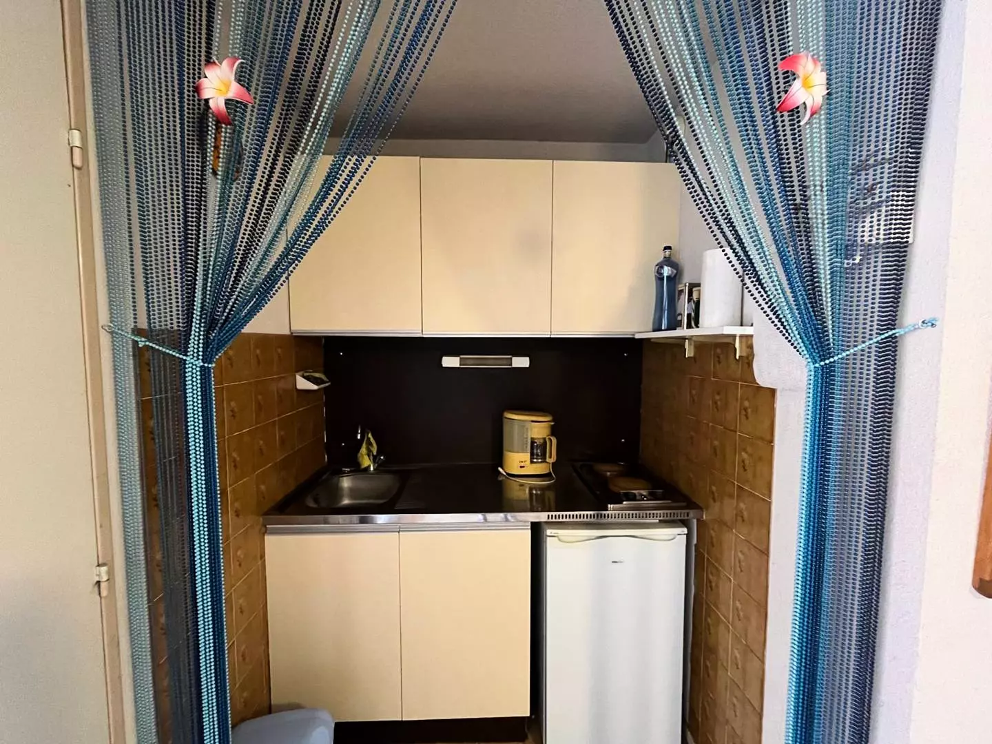 Kitchenette ouverte : réfrigérateur top avec congélateur, plaque de cuisson avec 2 feux, une cafetière à filtre, micro-ondes, grille-pain, bouilloire. Il y a également un grand balcon. Parking privatif.