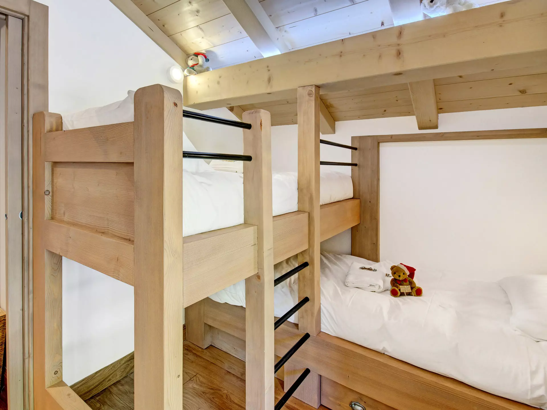 Ce chalet peut accueillier 10 adultes et 4 enfants (ou 12 adultes maximum) et se compose comme suit :