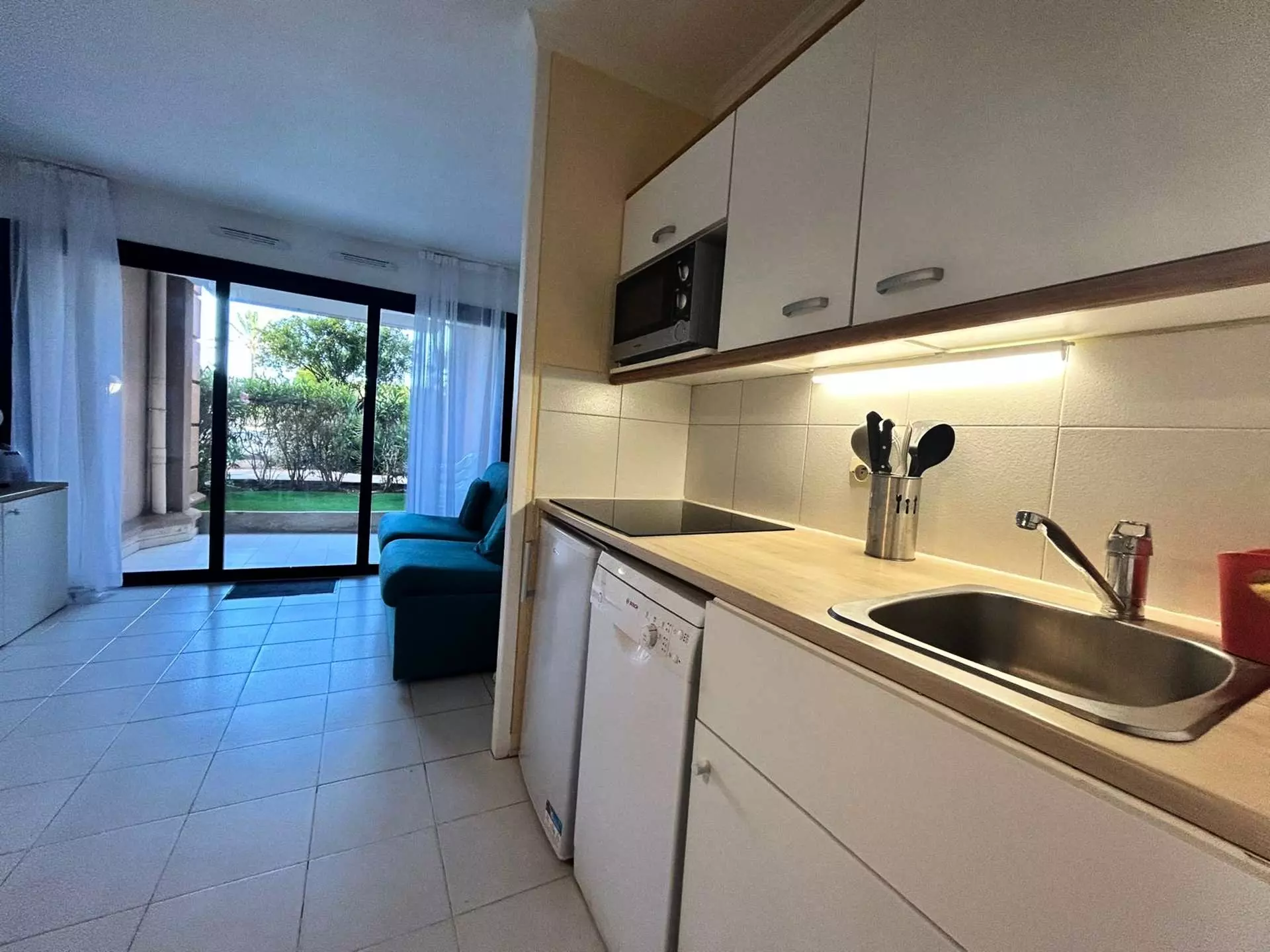 Le Logement : Cet appartement de vacances lumineux situé au rez-de-chaussée avec un accès direct depuis les magnifiques jardins de la résidence Palme d'Azur vous séduira. Il comprend une entrée avec un séjour comprenant un canapé convertible 140x 190), une cuisine moderne entièrement équipée avec coin repas, une salle de douche avec WC et un coin avec lit double (140x190 ) ainsi qu'une terrasse en rez de jardin.