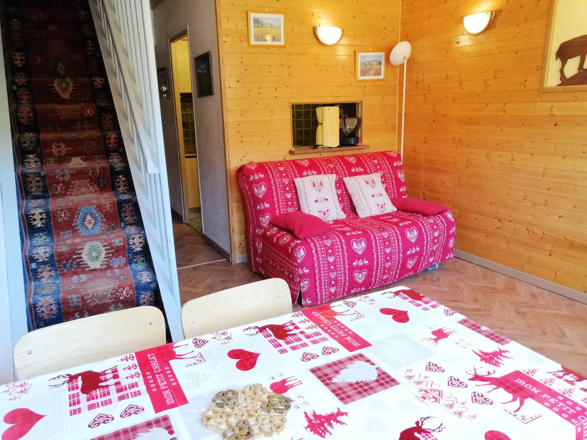 * Séjour : canapé convertible double, TV écran plat, rangements, coin repas ;