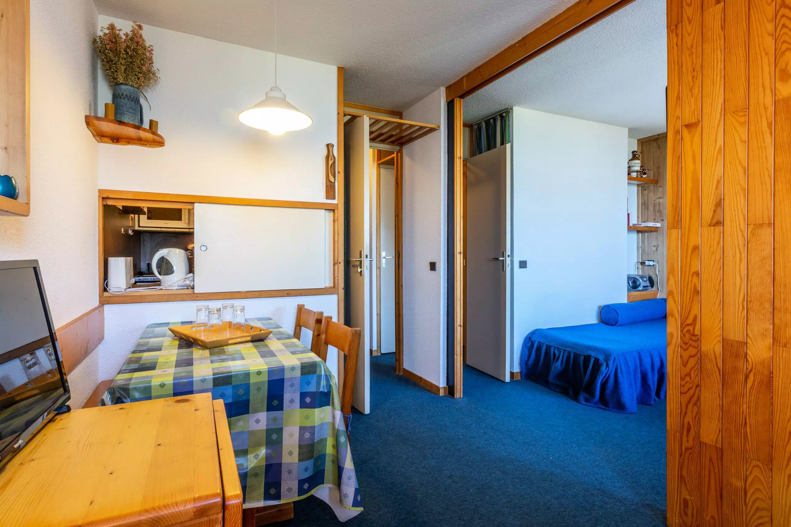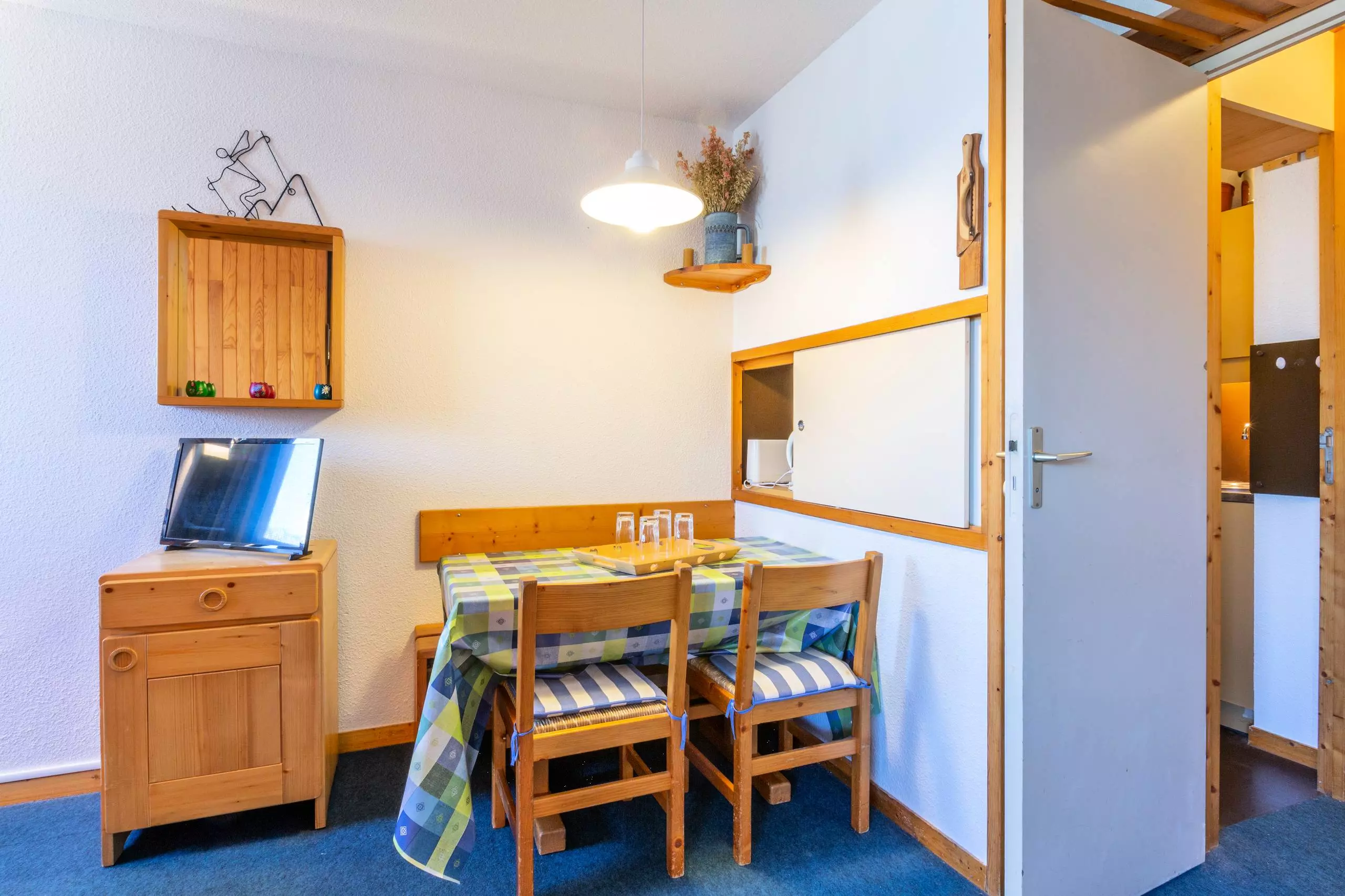 Ce studio divisible par cloison mobile de 27 m², est situé au 3ème étage (avec ascenseur) et est équipé pour 4 personnes. Il comprend :